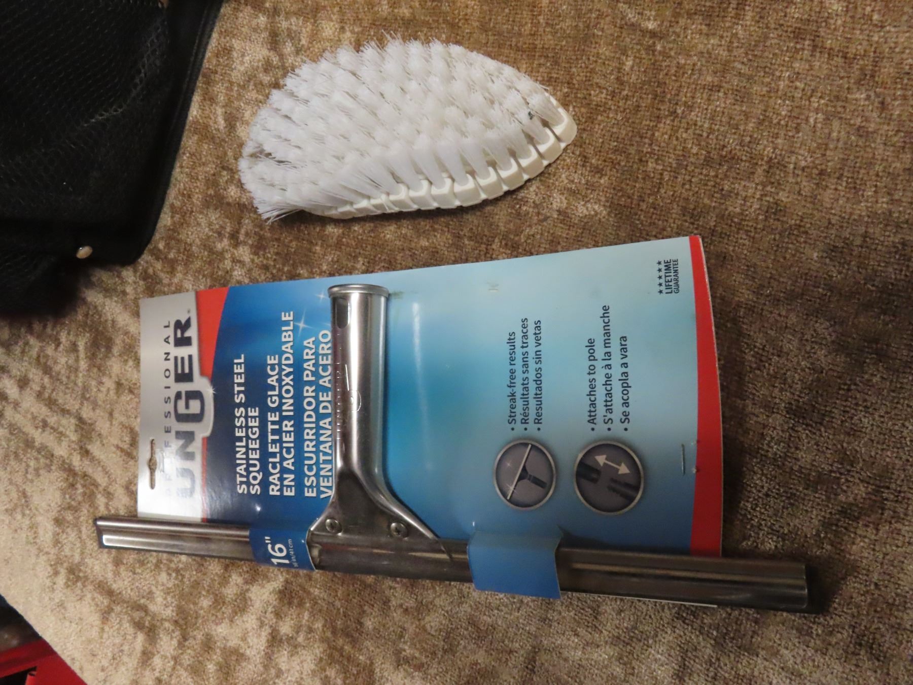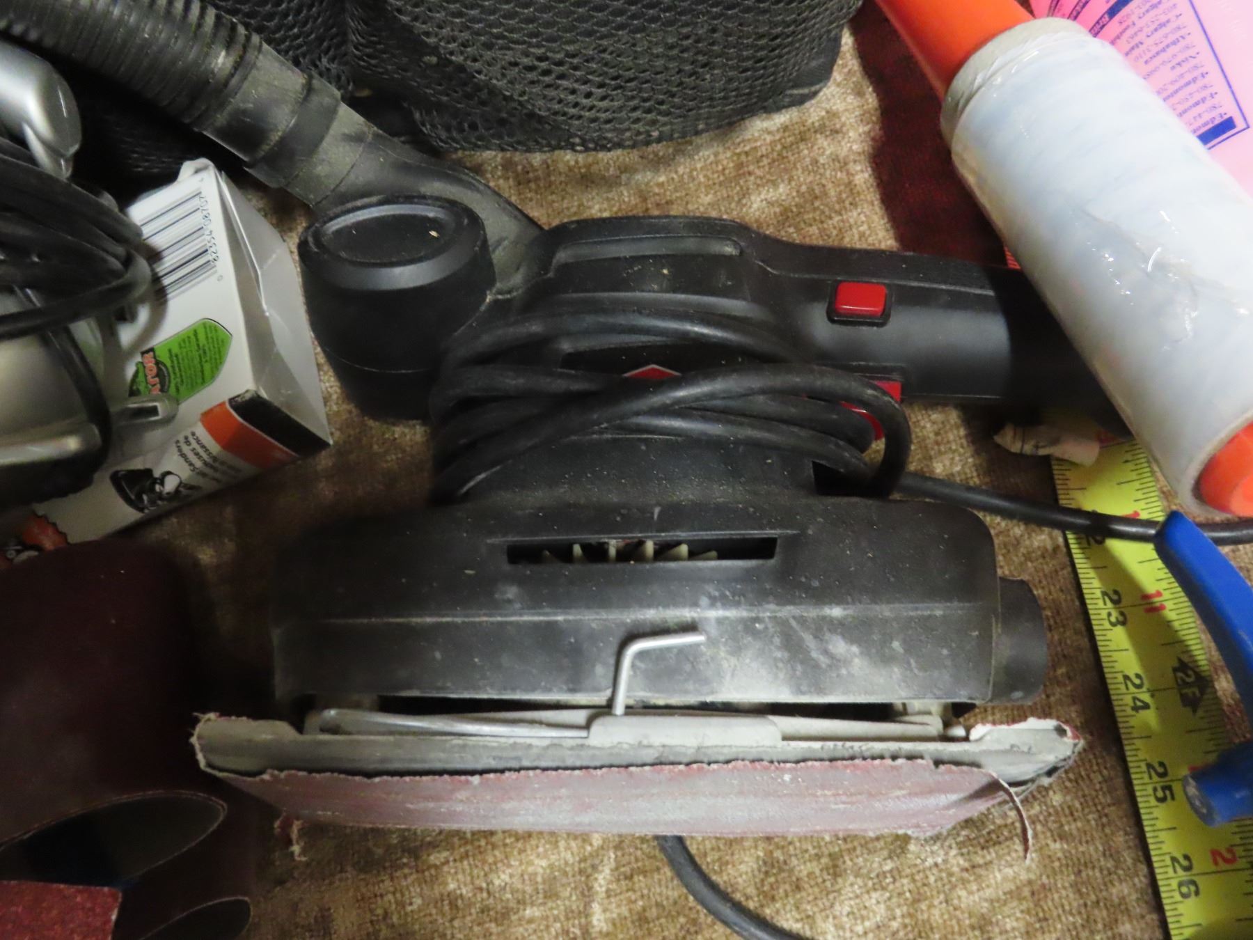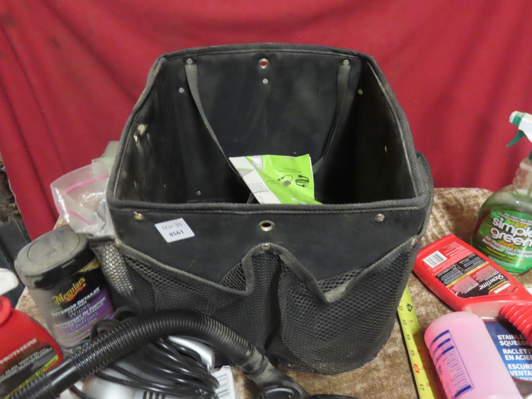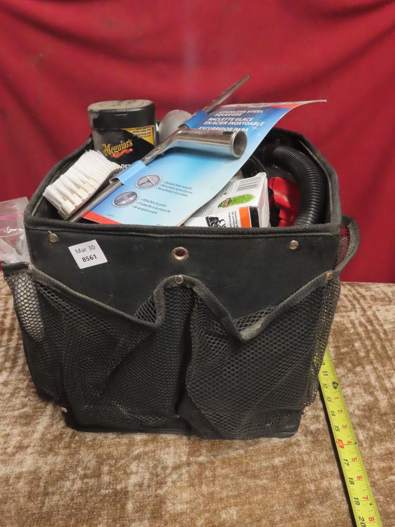 detailing lot with cleaners , cloths and brushes , job mate sander