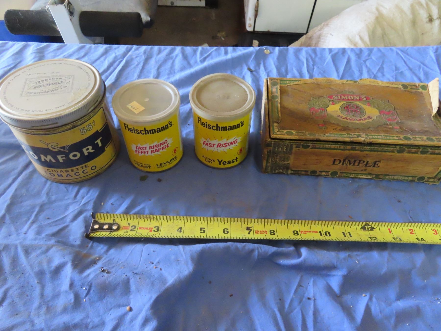 fleishman yeast cans , comfort tobacco , weathered dimple cigar box