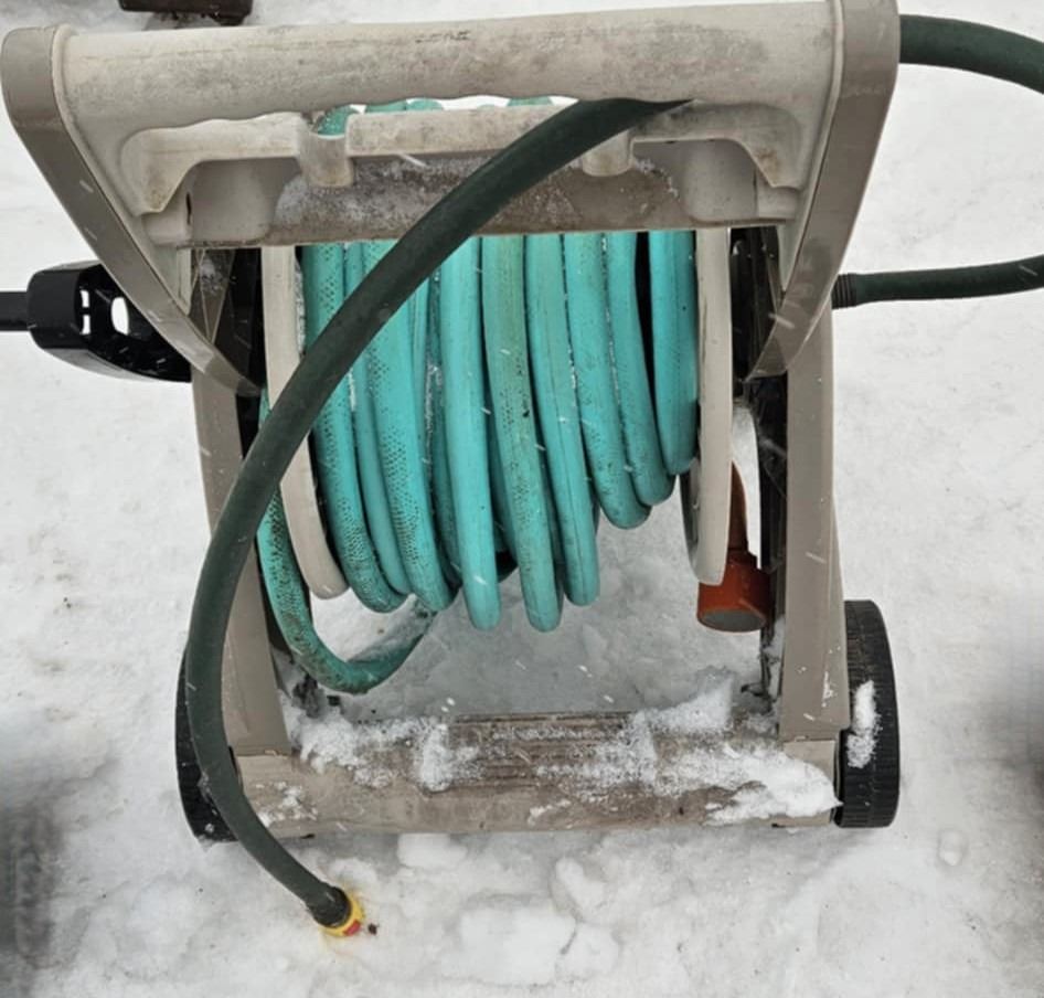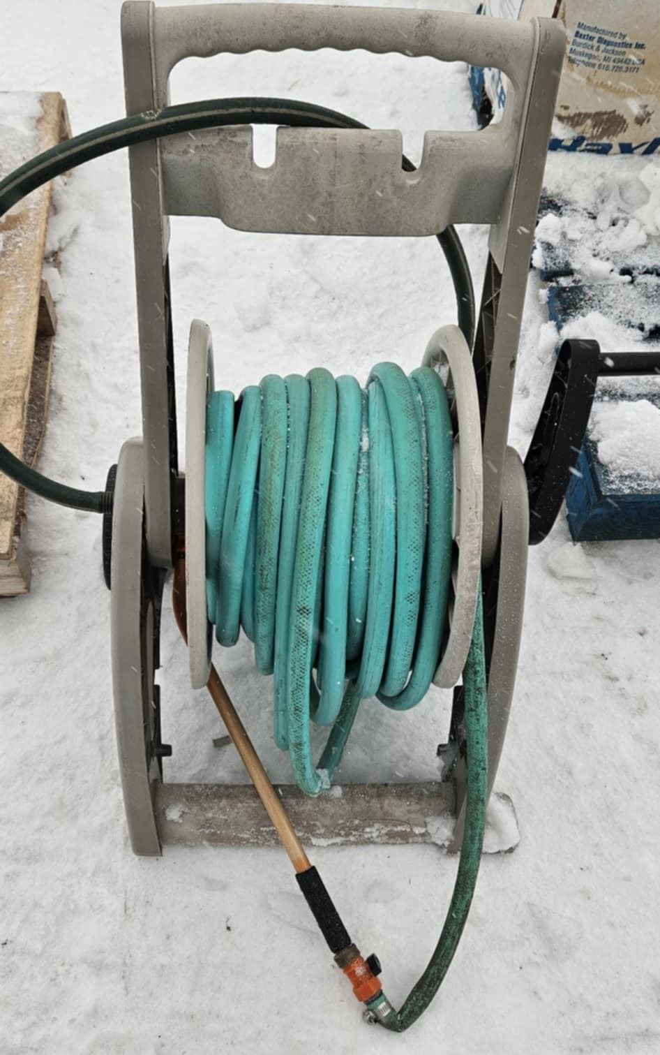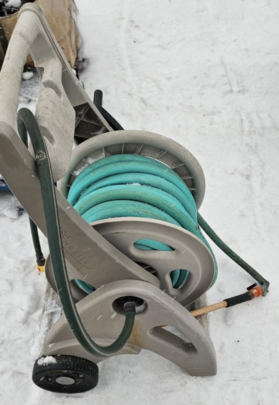 garden hose reel cart with garden hose and nozzle