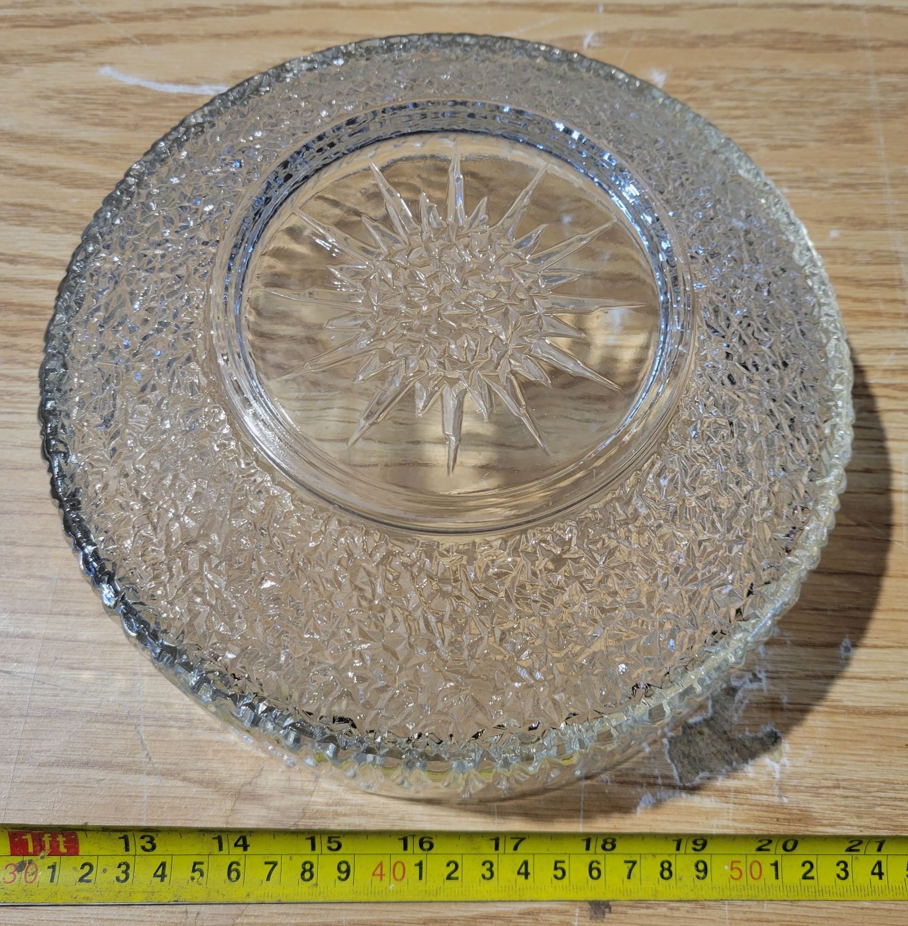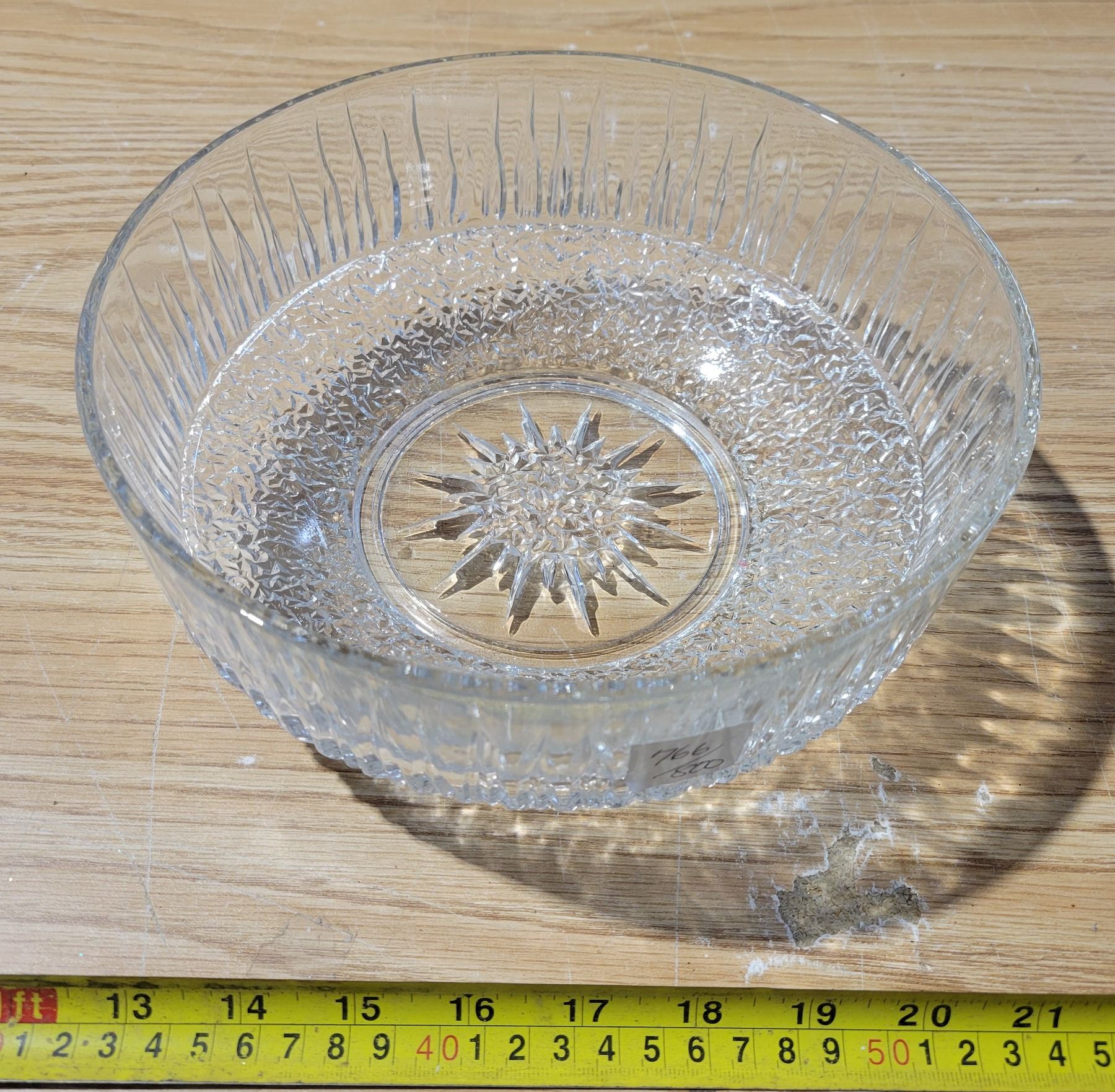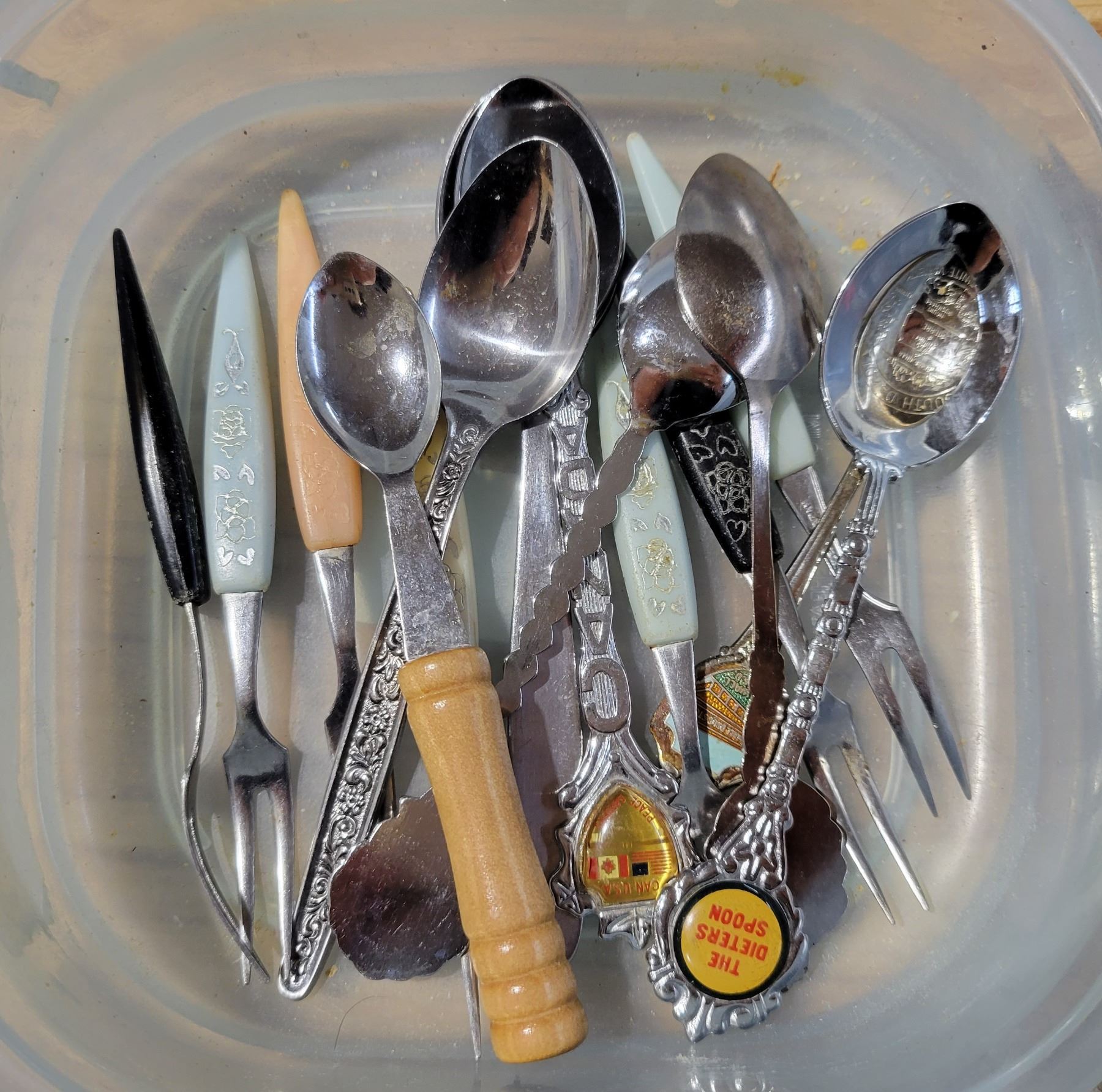 glass bowl, jam spoons, pickle forks, & winter scene tin
