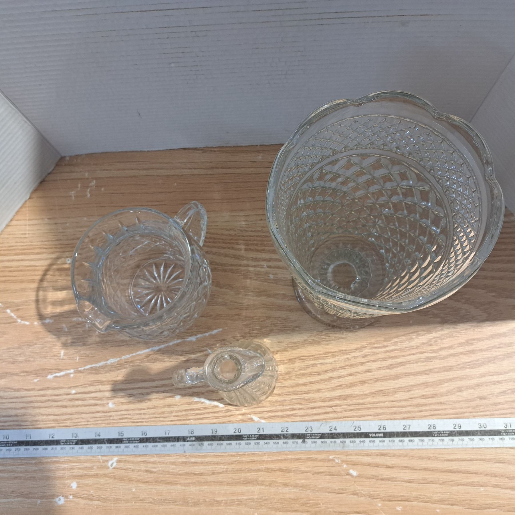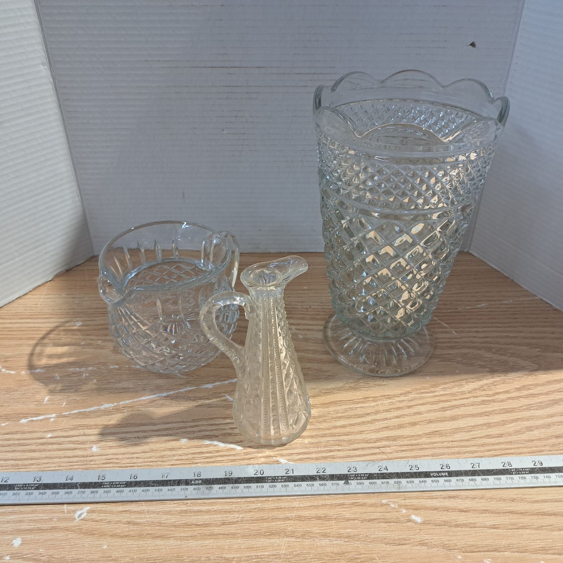 glass vase and 2 glass pitchers
