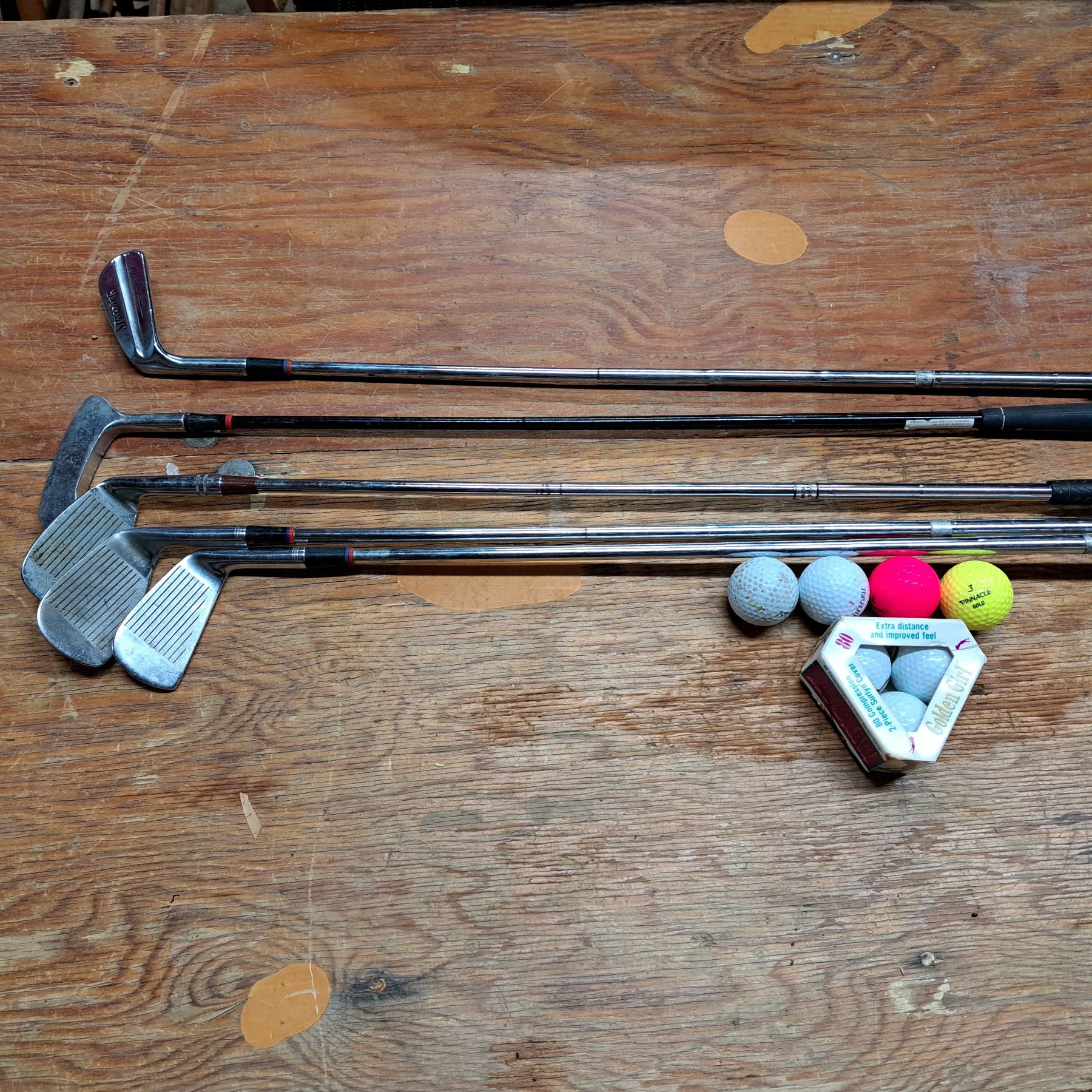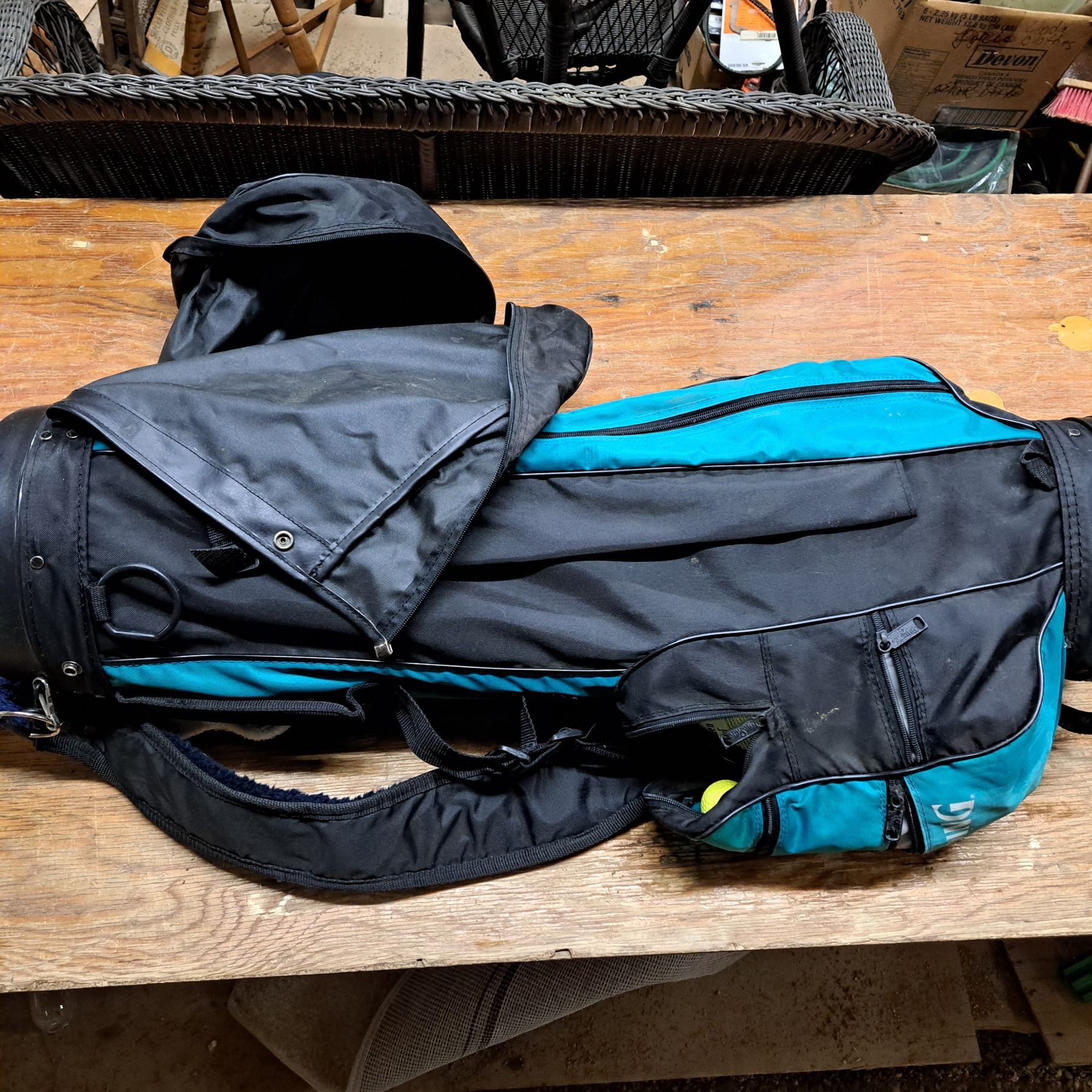 golf bag with left handed clubs(wilson and spalding) with lots of golf balls and pen with paper