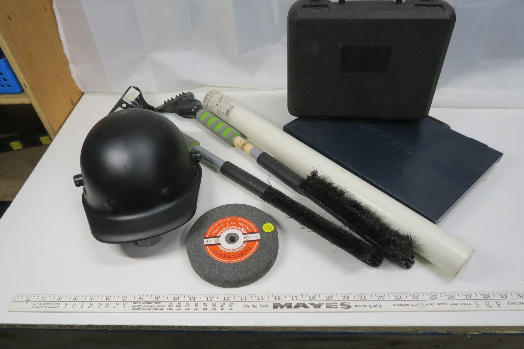 hard hat, 2 tool cases, 2 snow brushes, trailer plans, grinding disc
