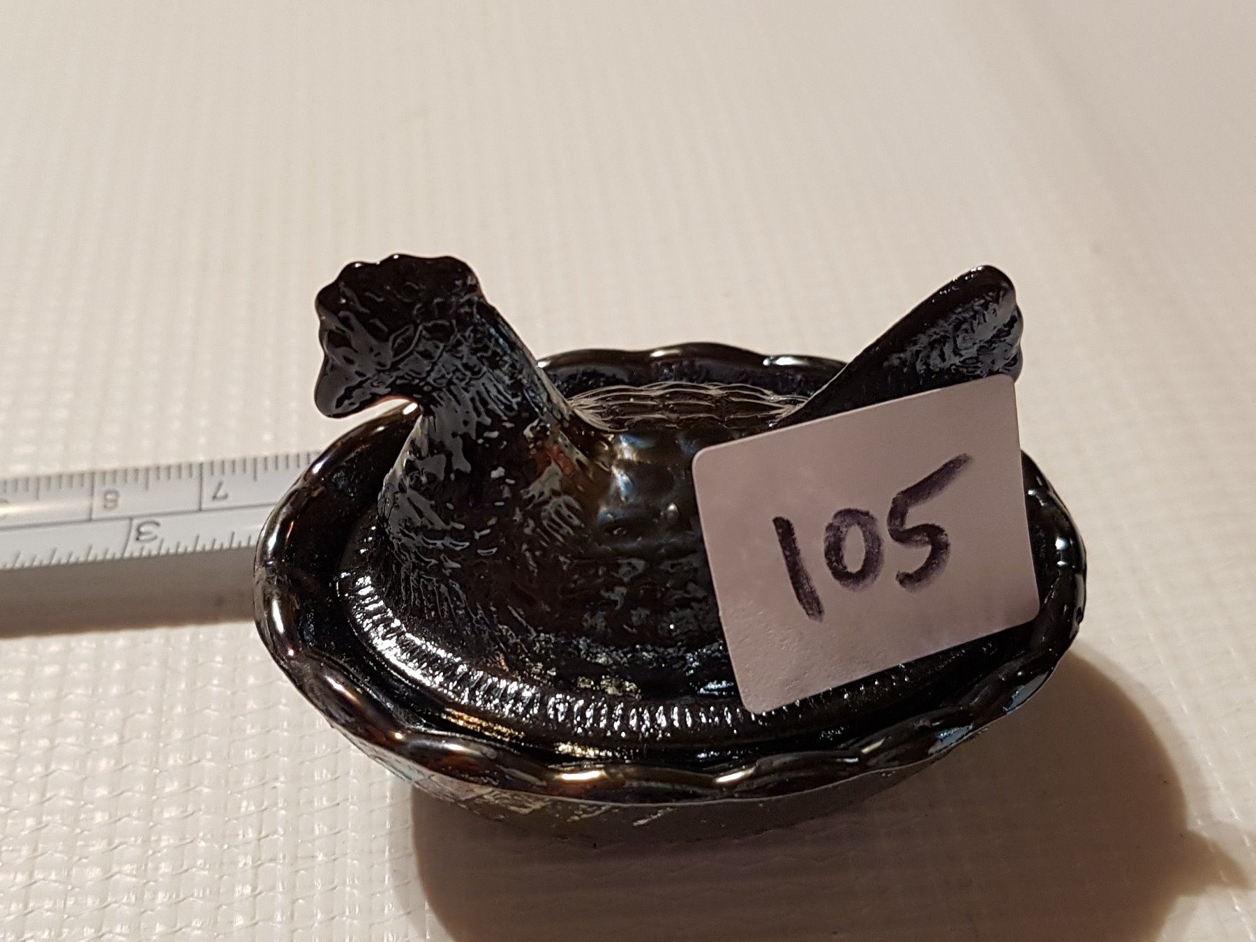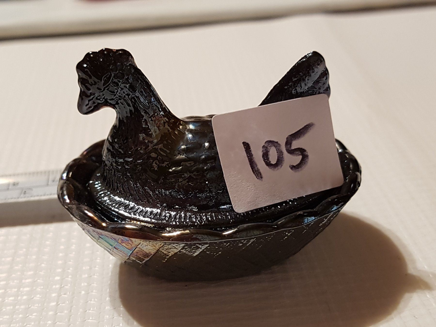 hen on a nest 2.5 inch dark carnival glass