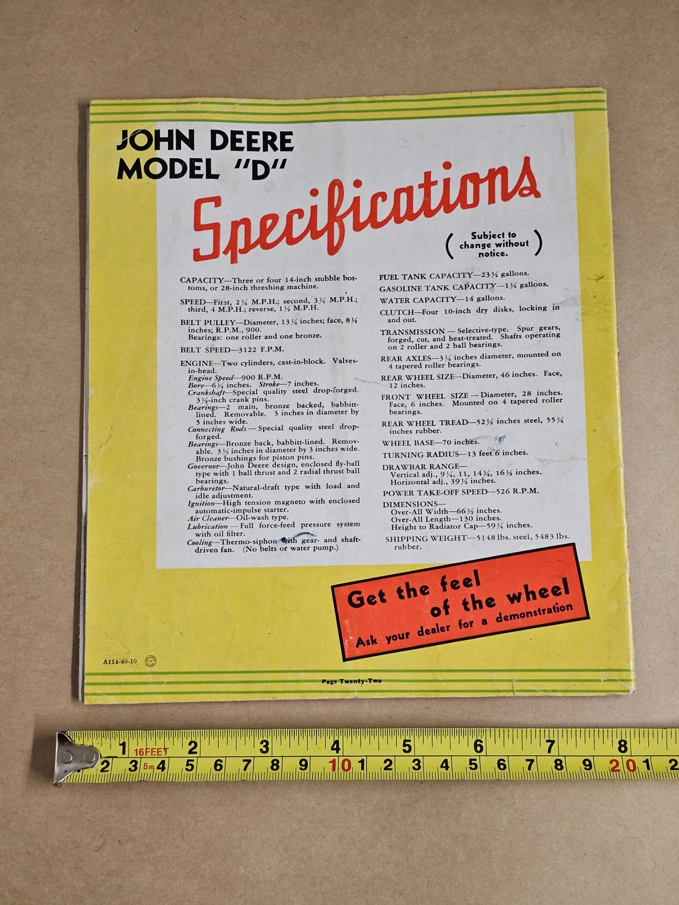 john deere model "D" tractor brochure (very good condition) A114-40-10