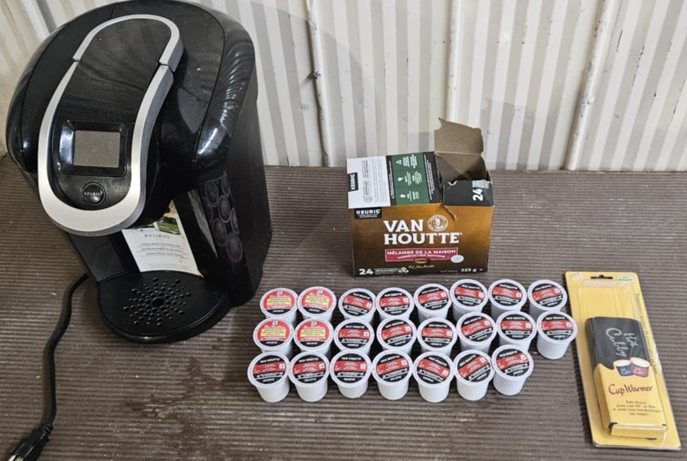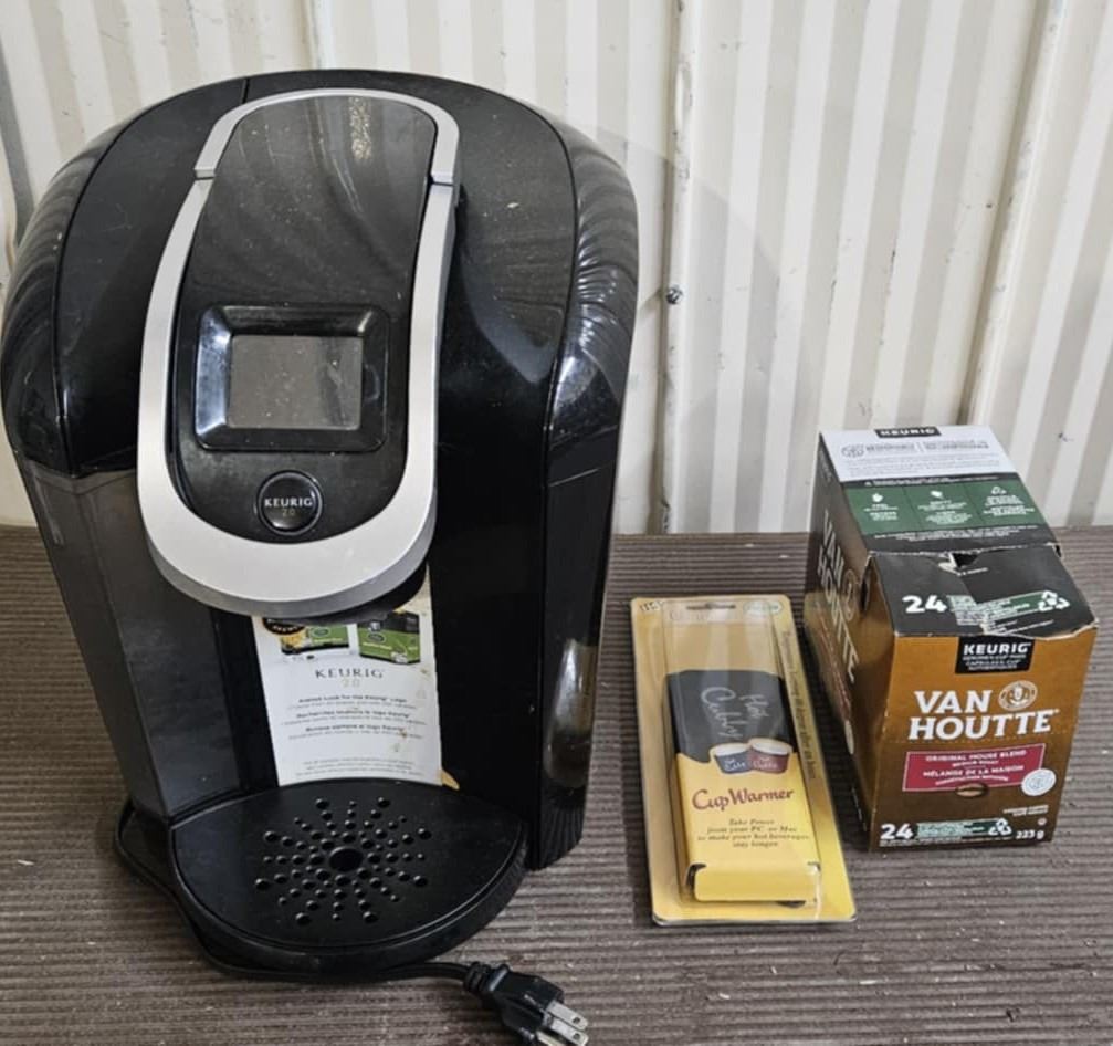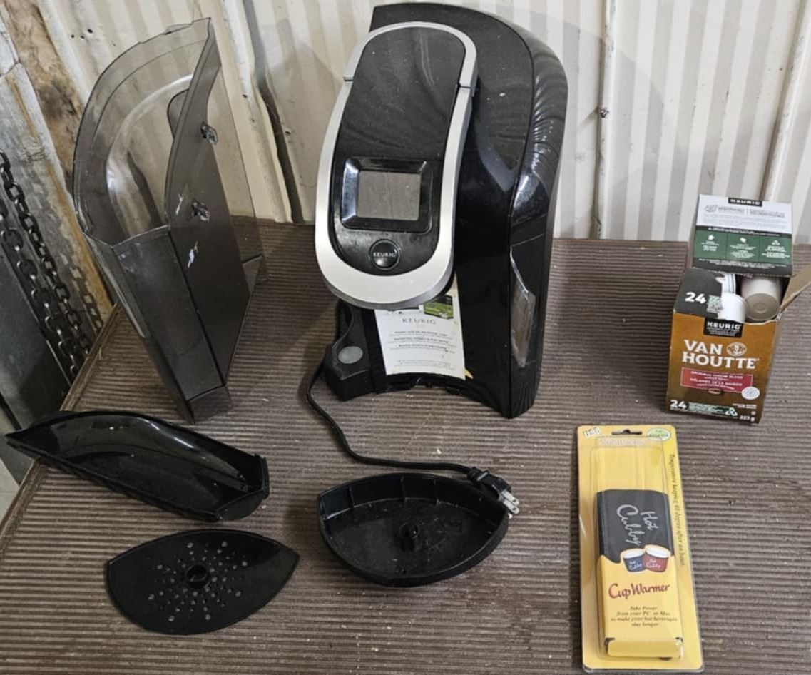 keurig coffee maker, usb cup warmer unopened and 23 coffee pods
