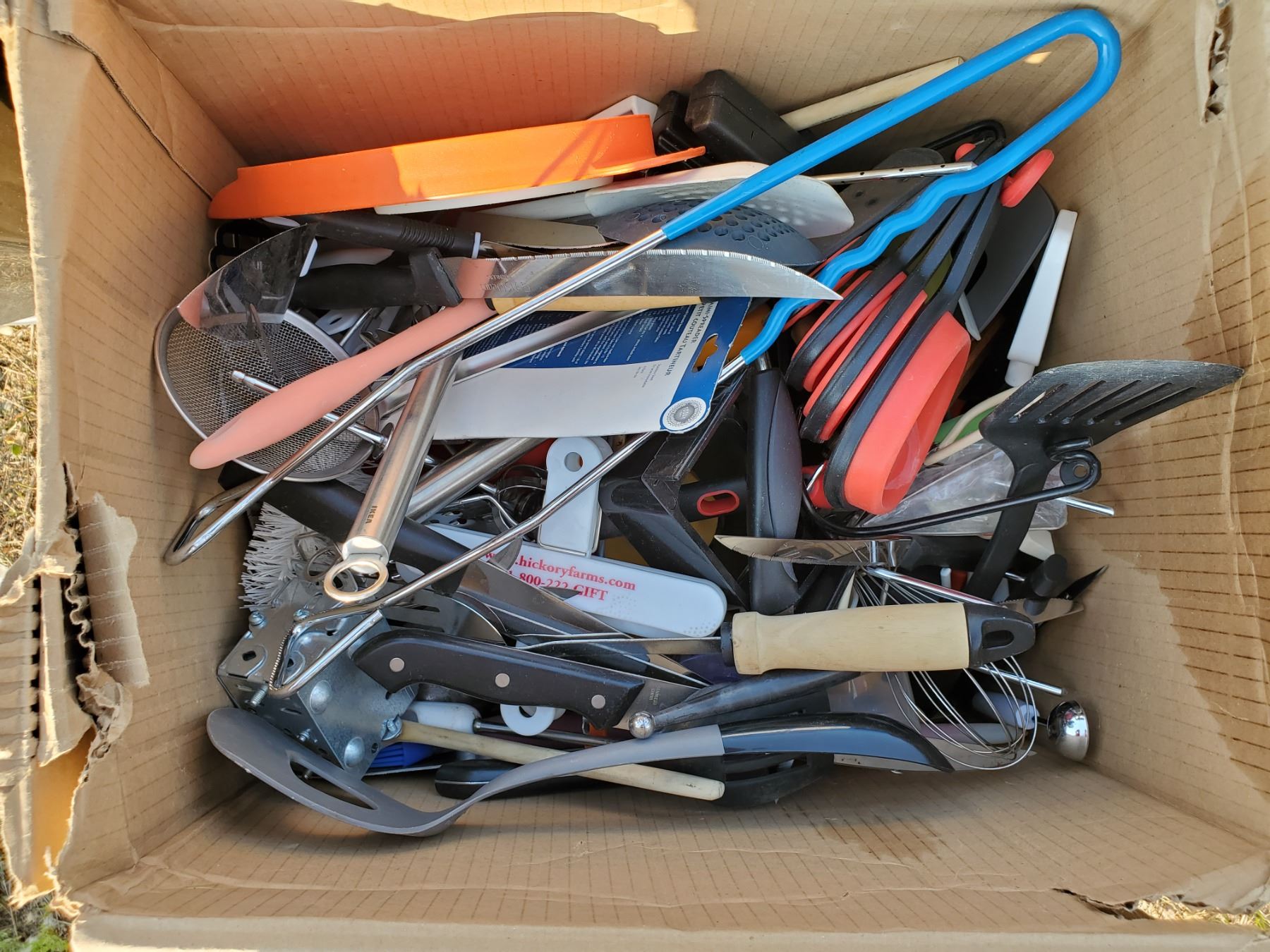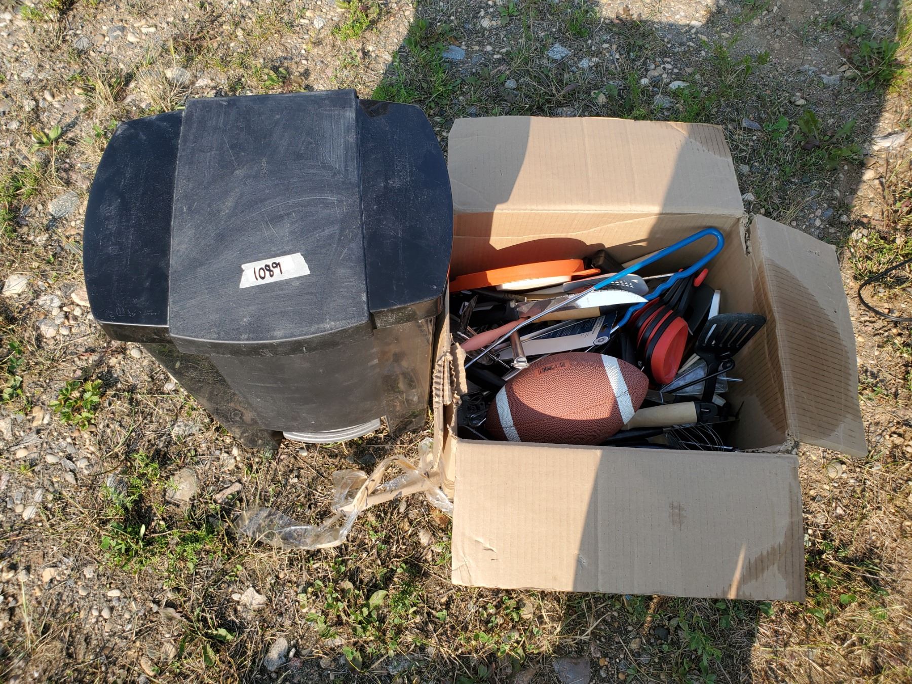 kitchen garbage can + large box full of utensils