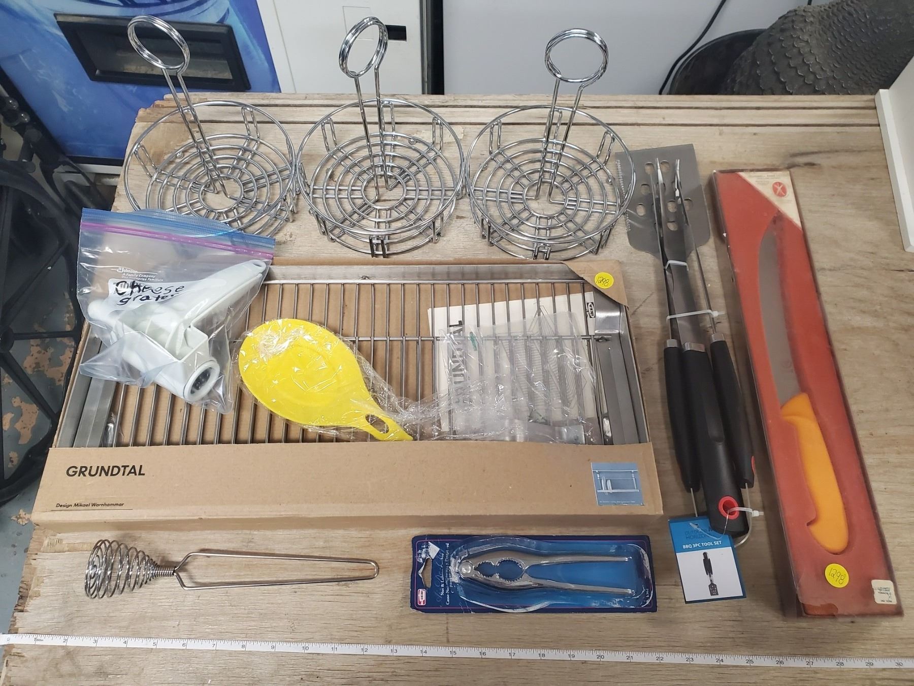 large kitchen lot with IKEA shelf, condiment holders, bbq tools etc.