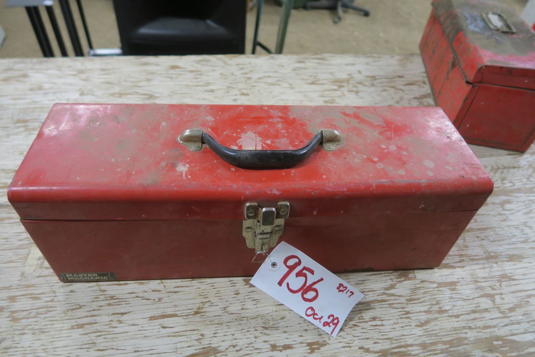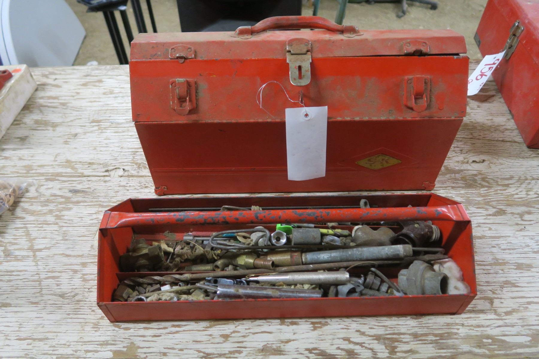 large red flat top metal tool box with misc tools and items
