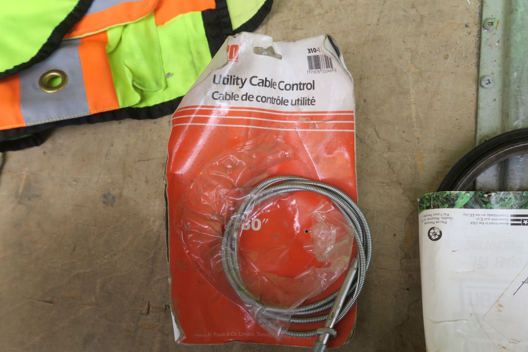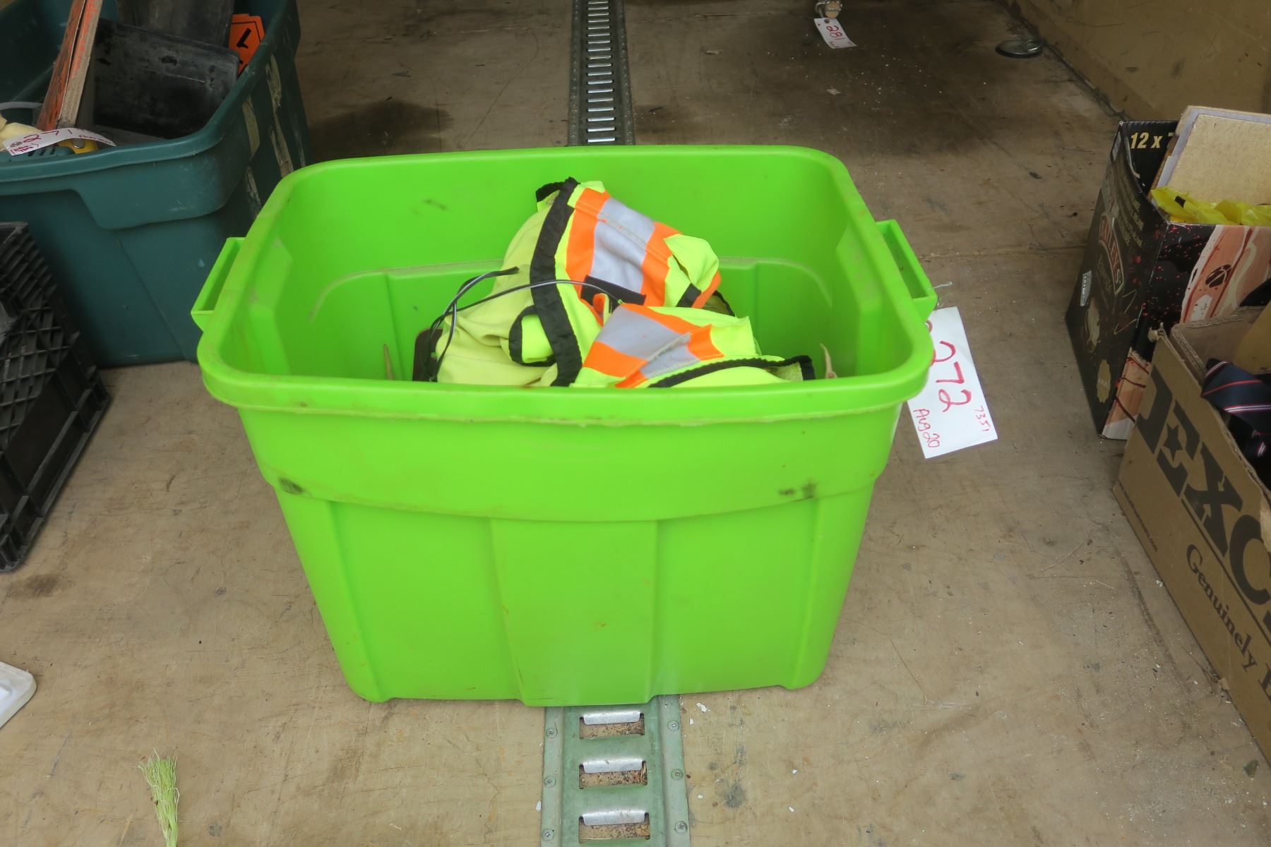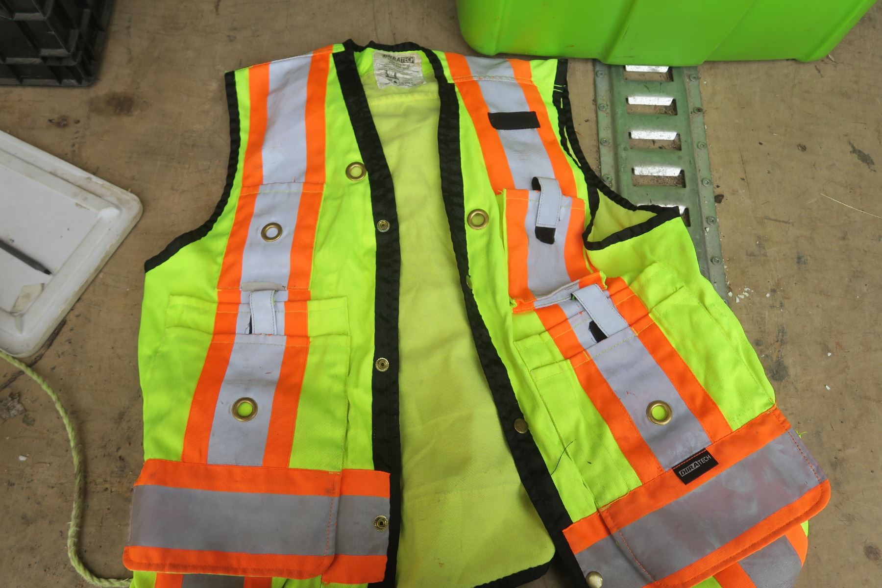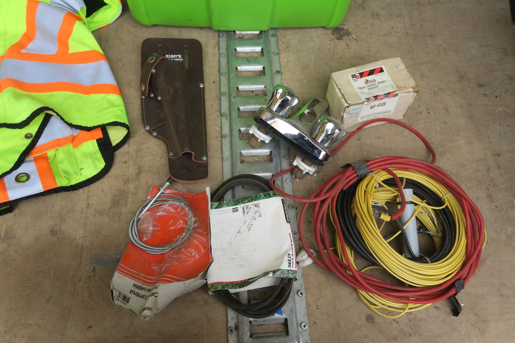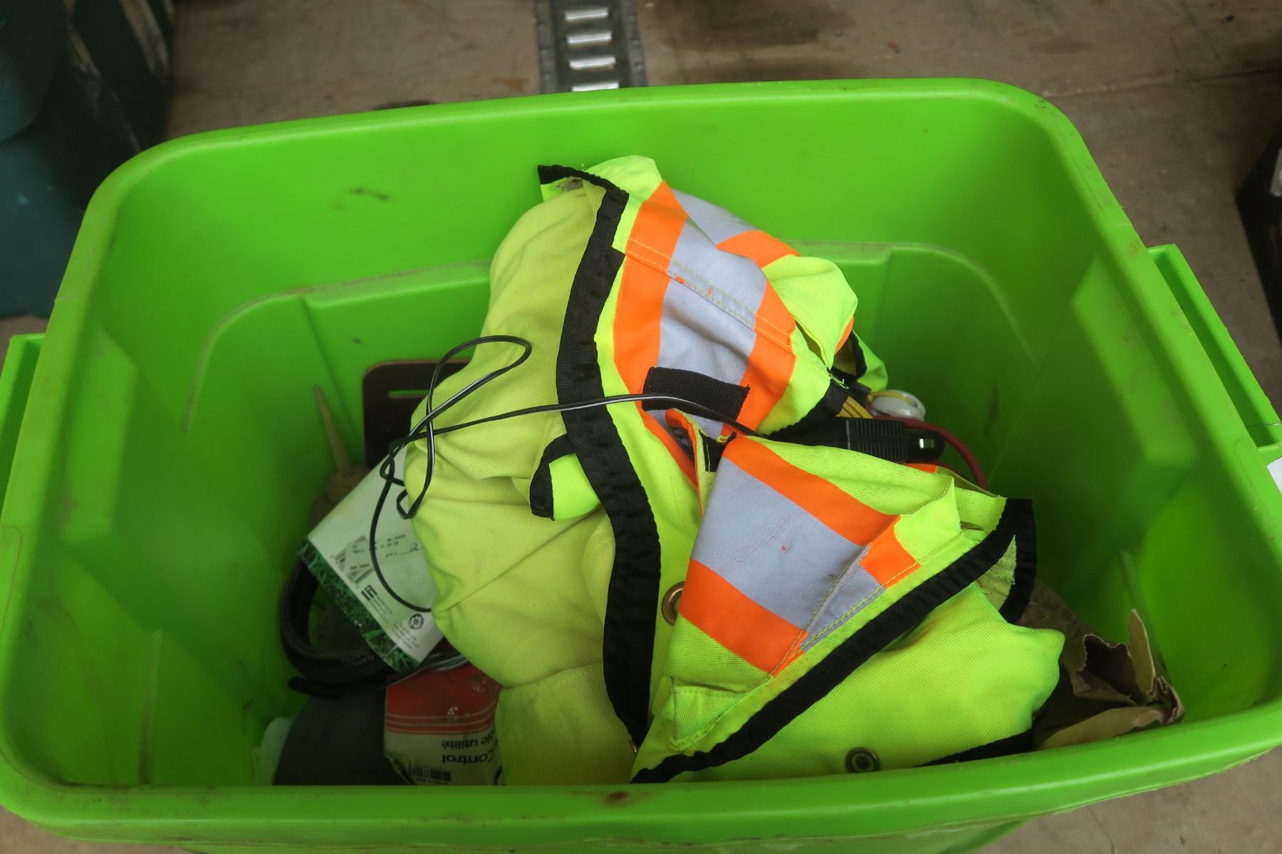 lime green tote of Misc items. Safty vest, assorted hardware.