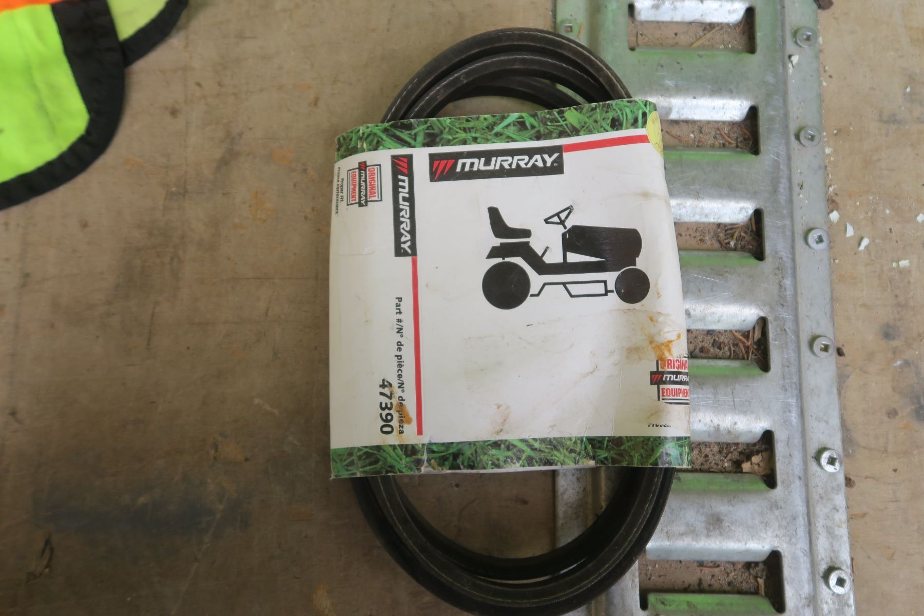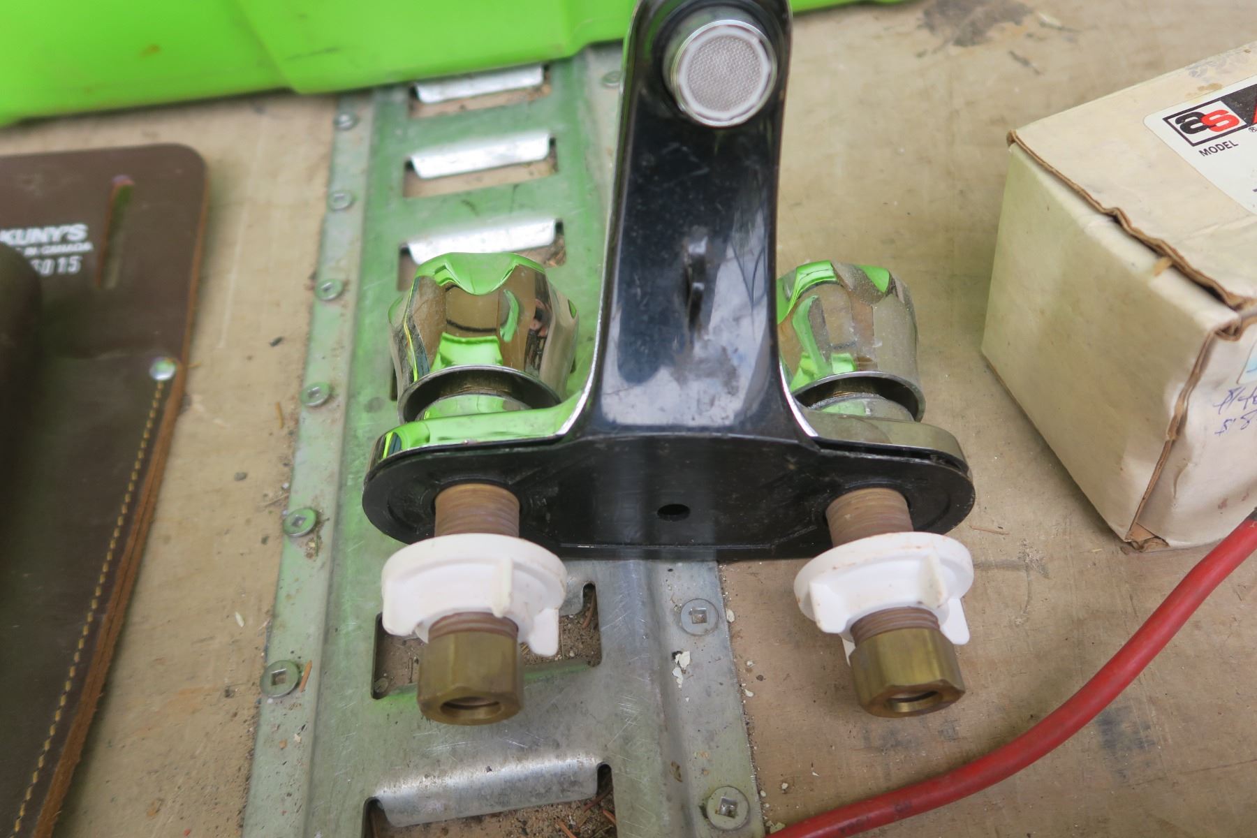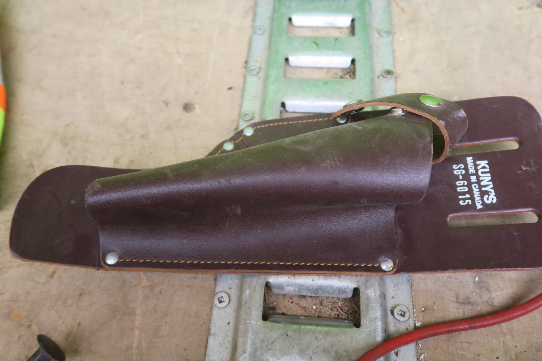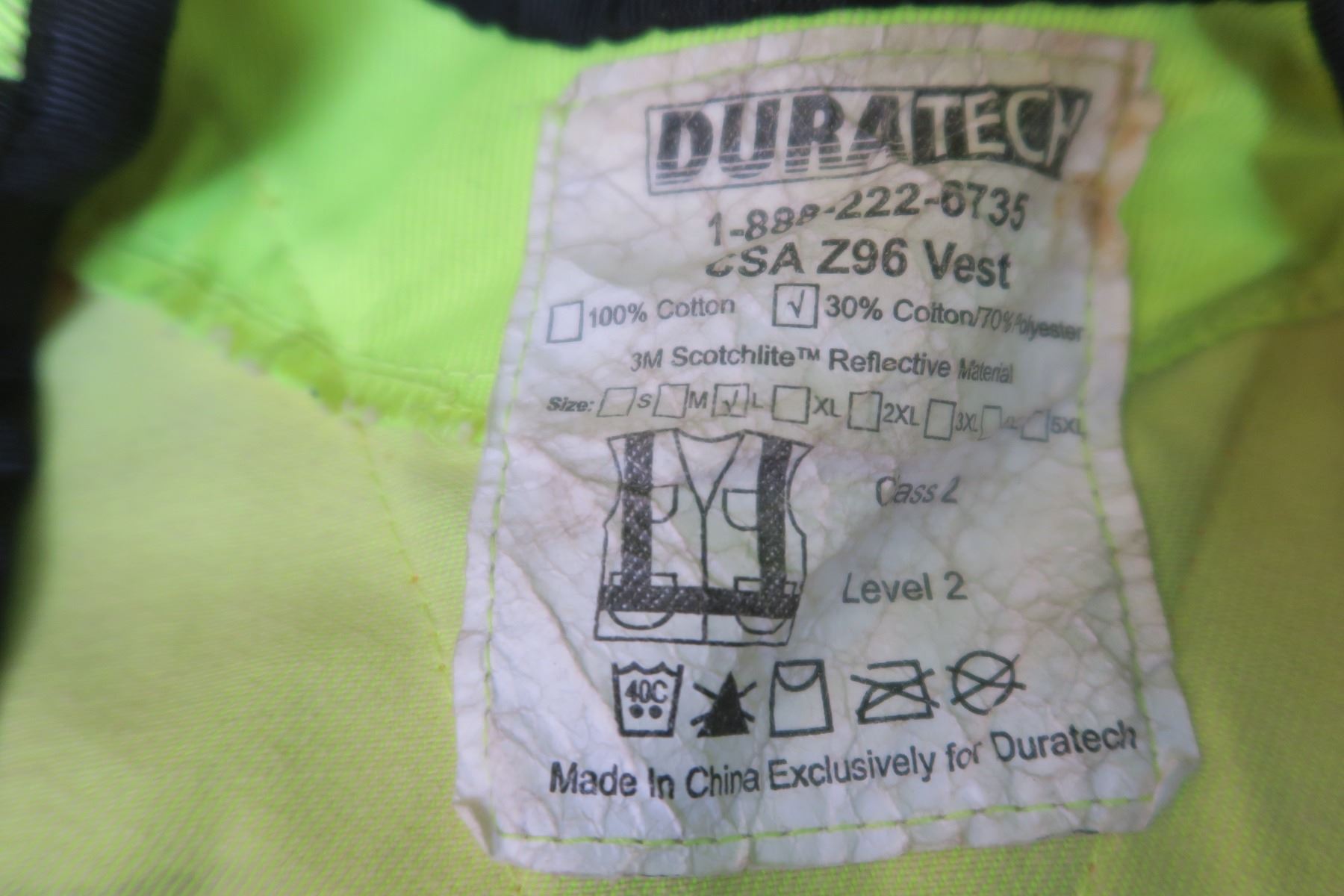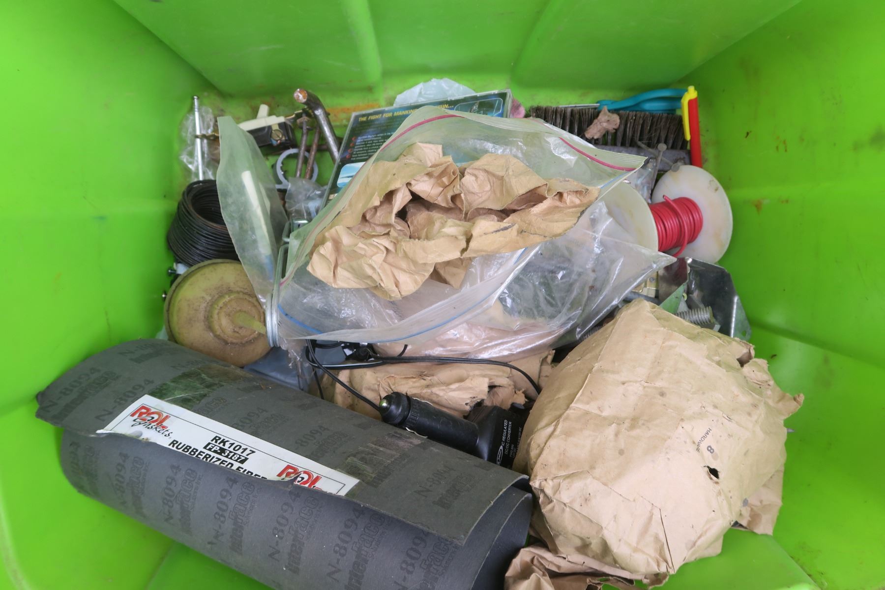 lime green tote of Misc items. Safty vest, assorted hardware.