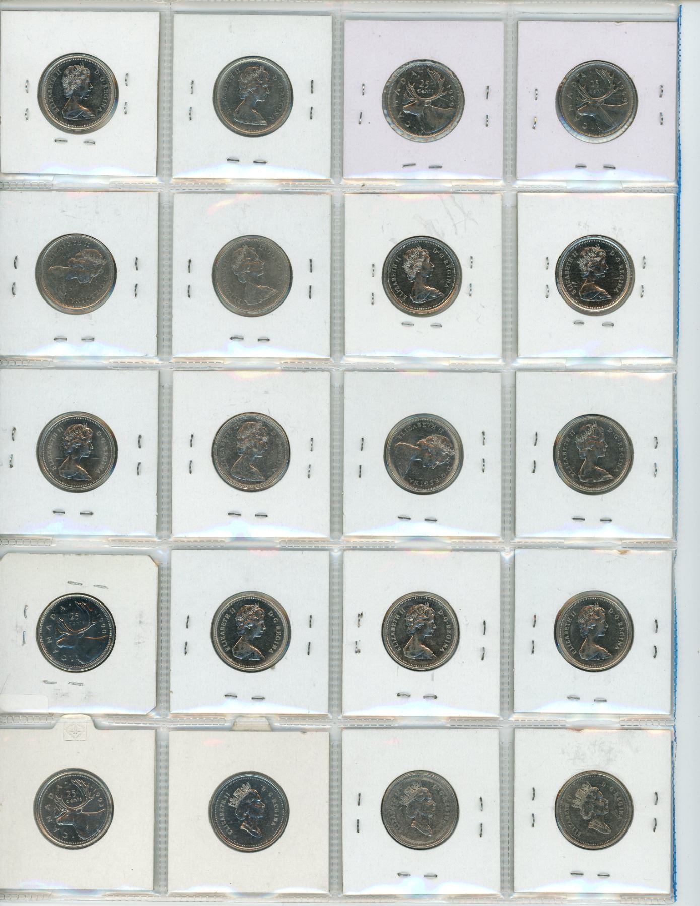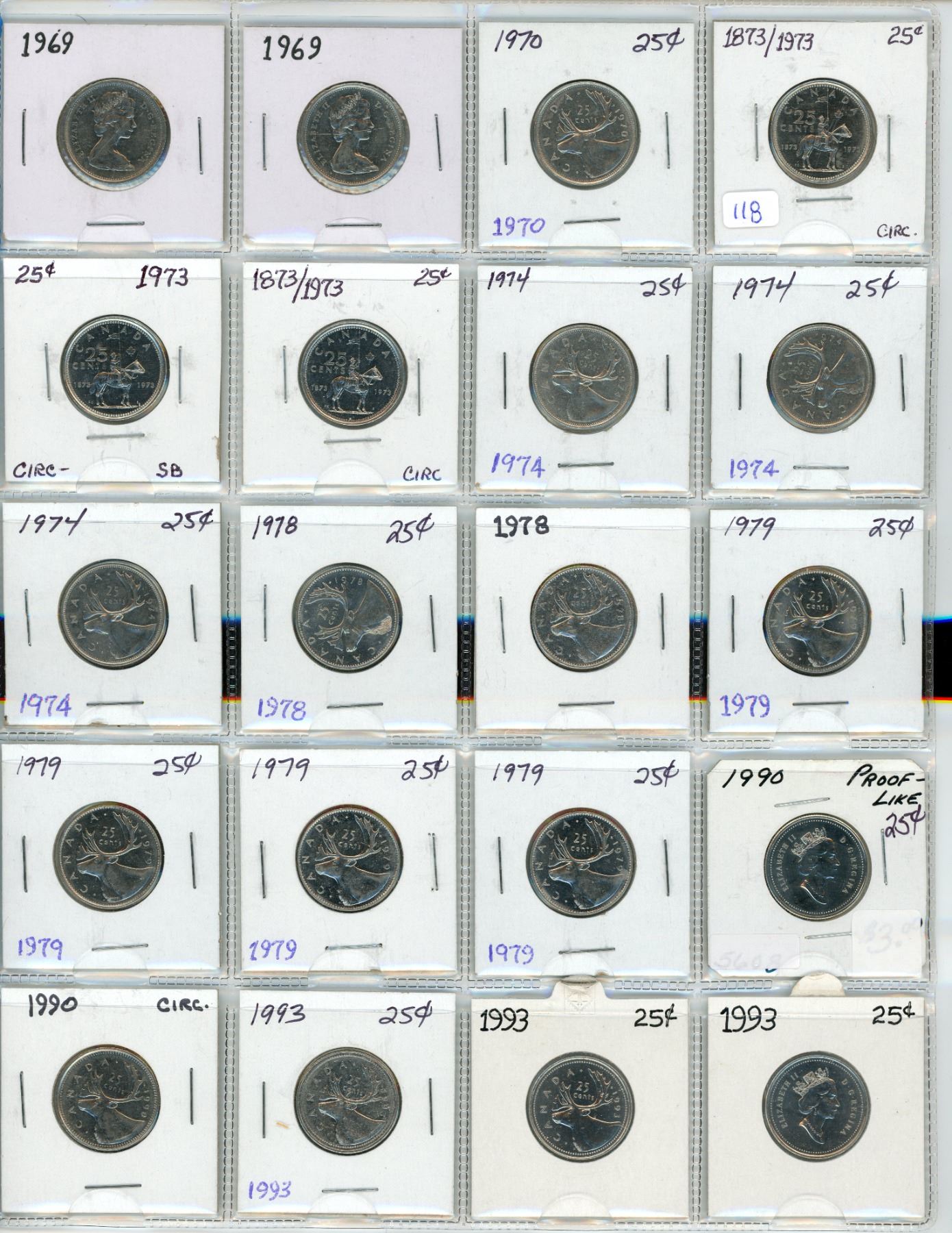 lot of 20 Canada 25 cents 1969-1993 various years & grades