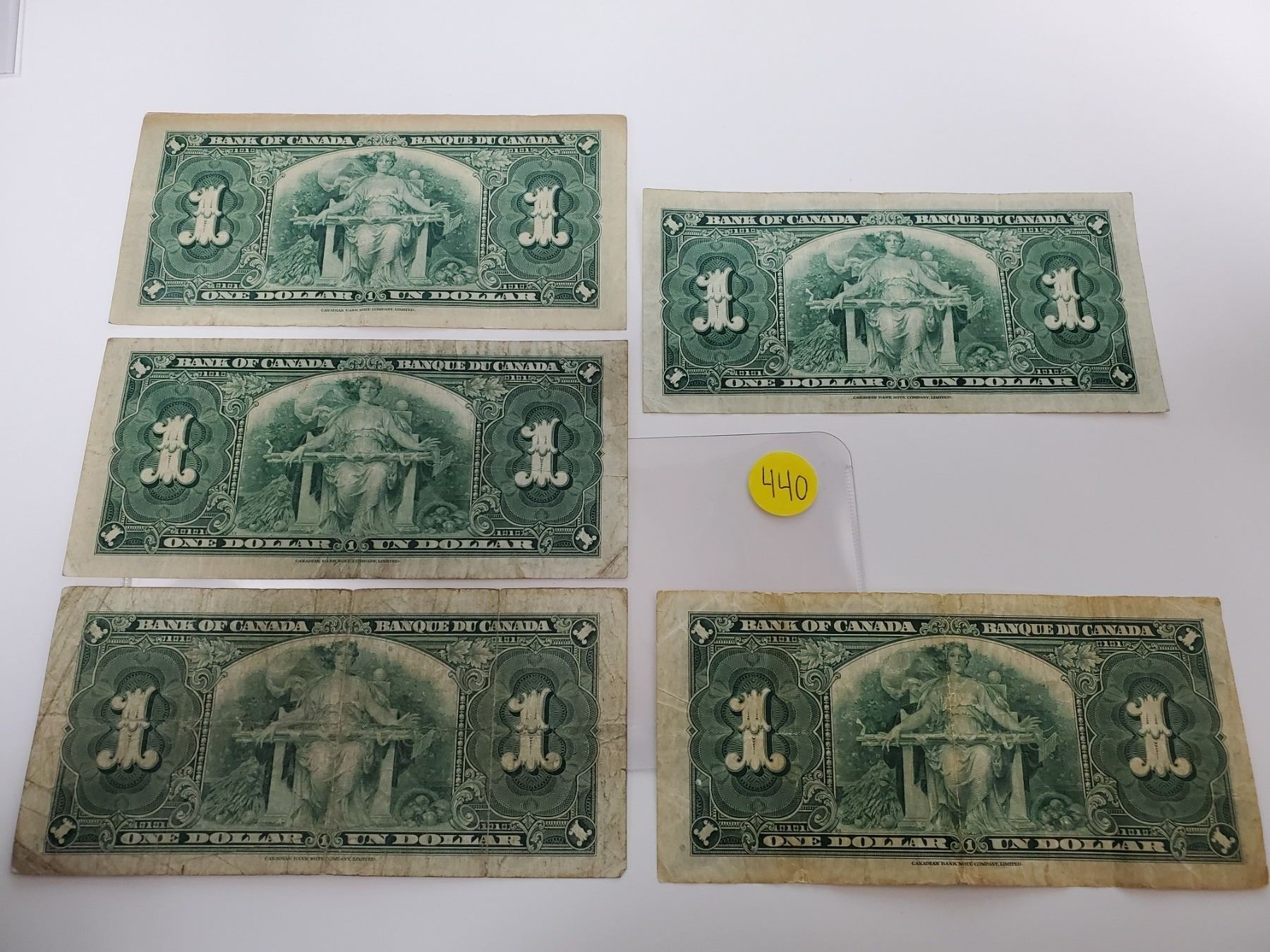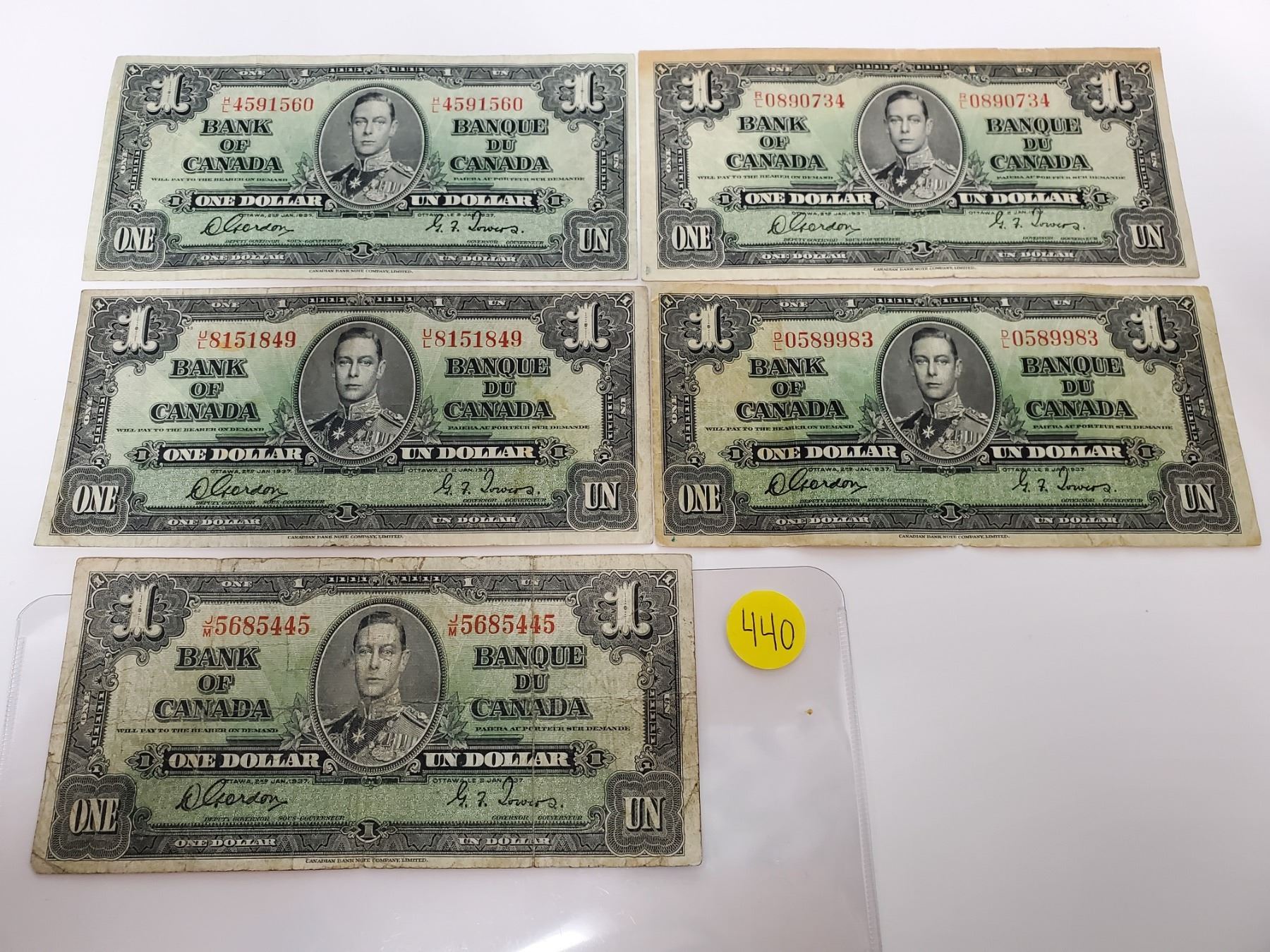lot of 5 Canada 1 Dollar 1937 Bank of Canada $1 Gordon-Towers