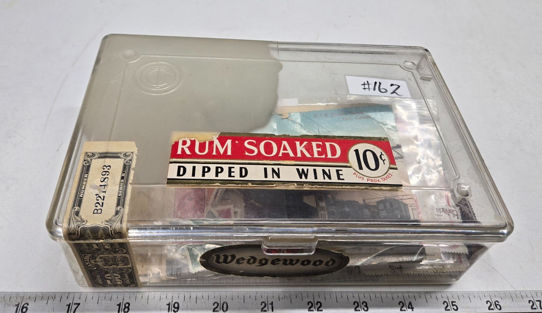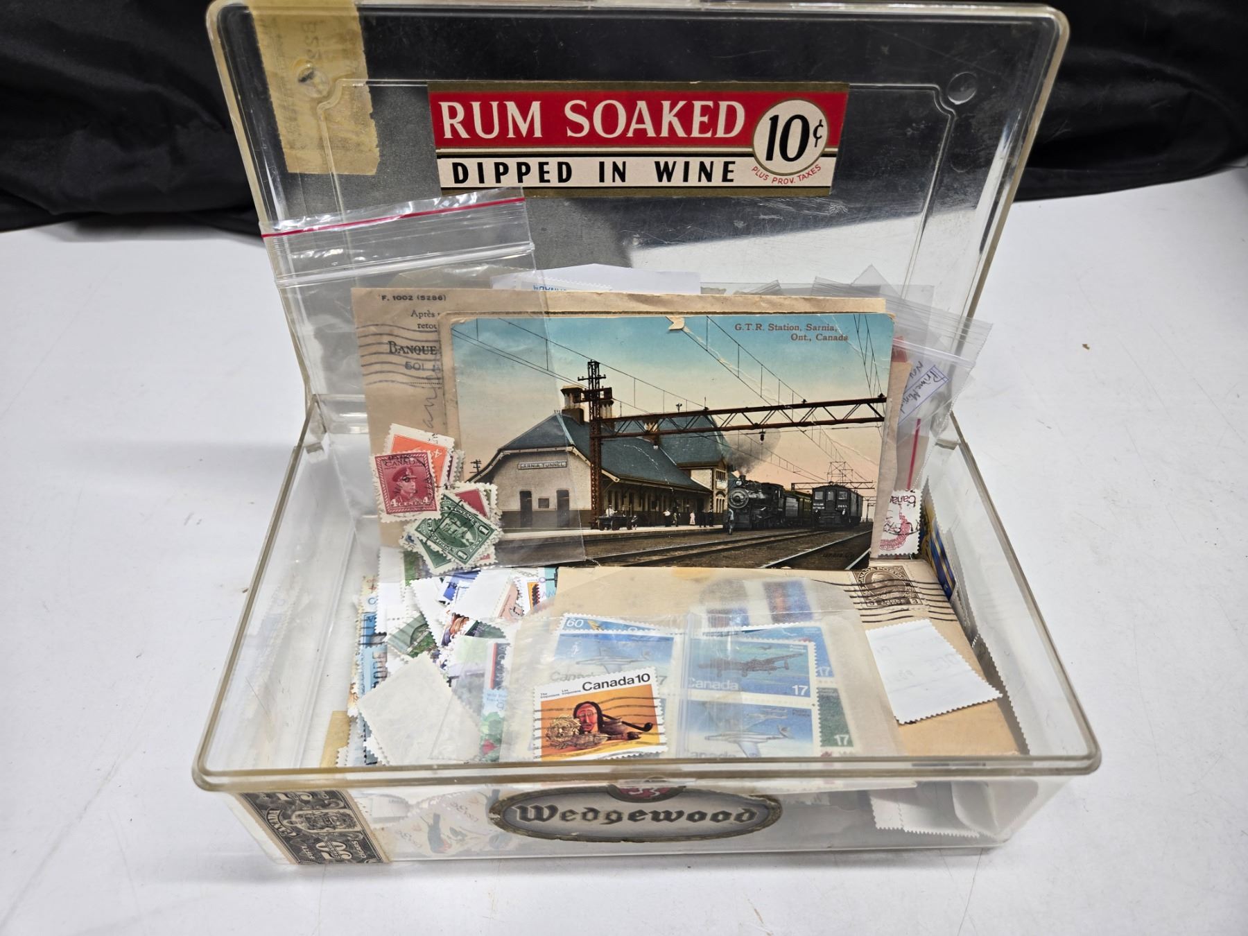 lot of assorted stamps in plastic cigar box