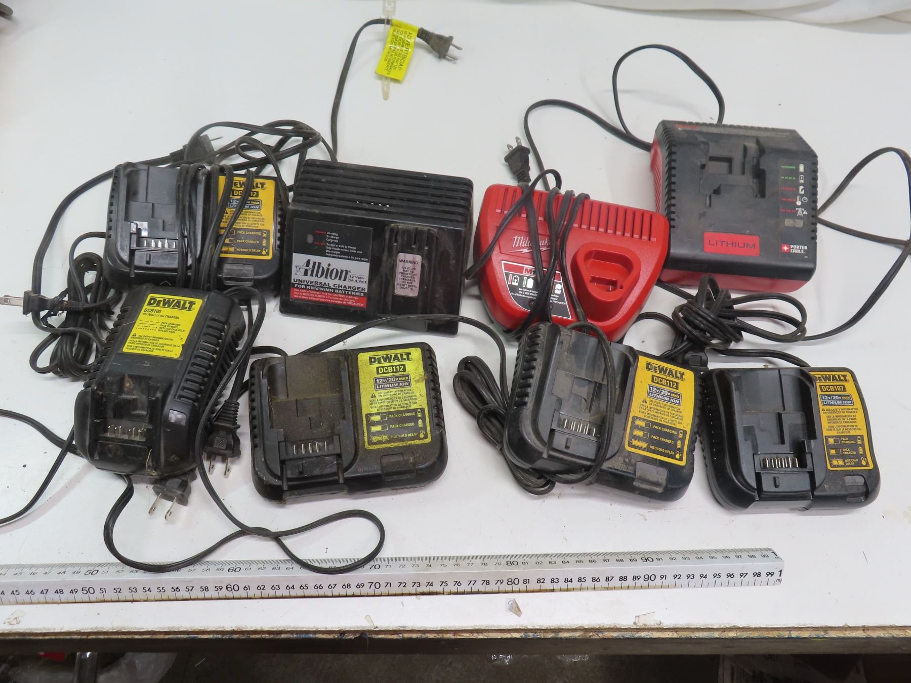 lot of battery chargers - dewalt, milwaukee, albion, porter cable