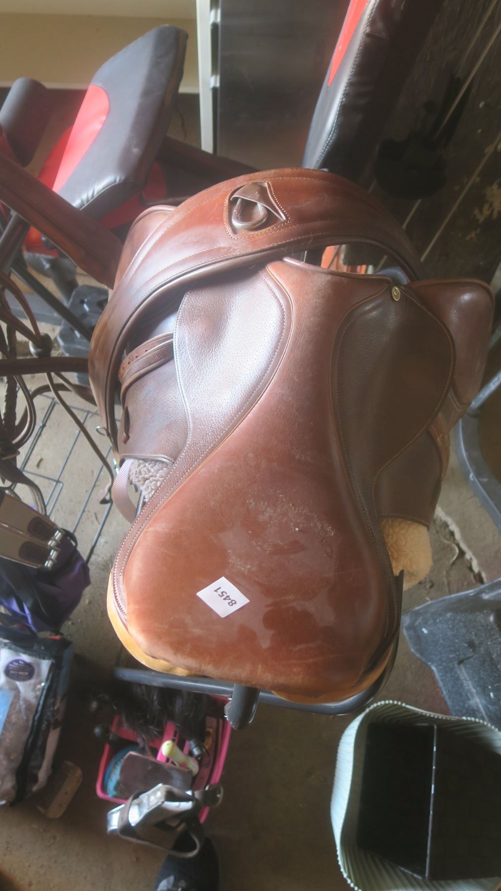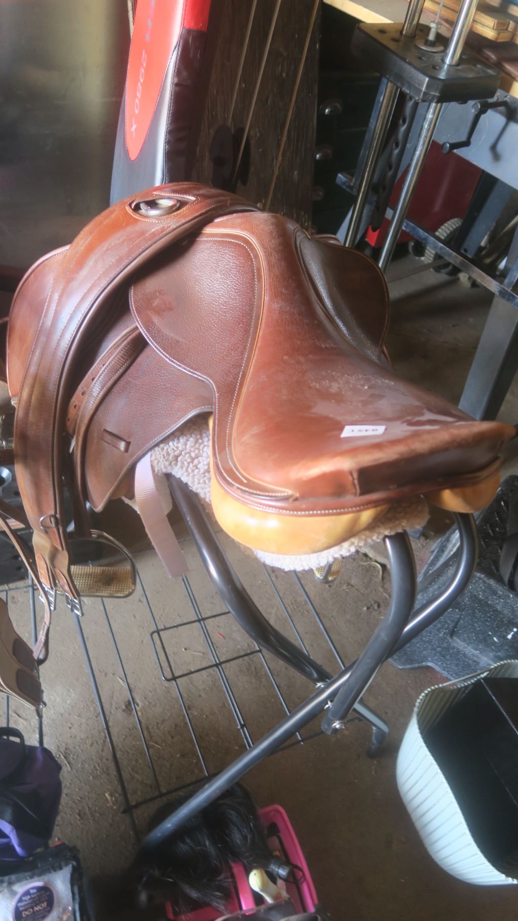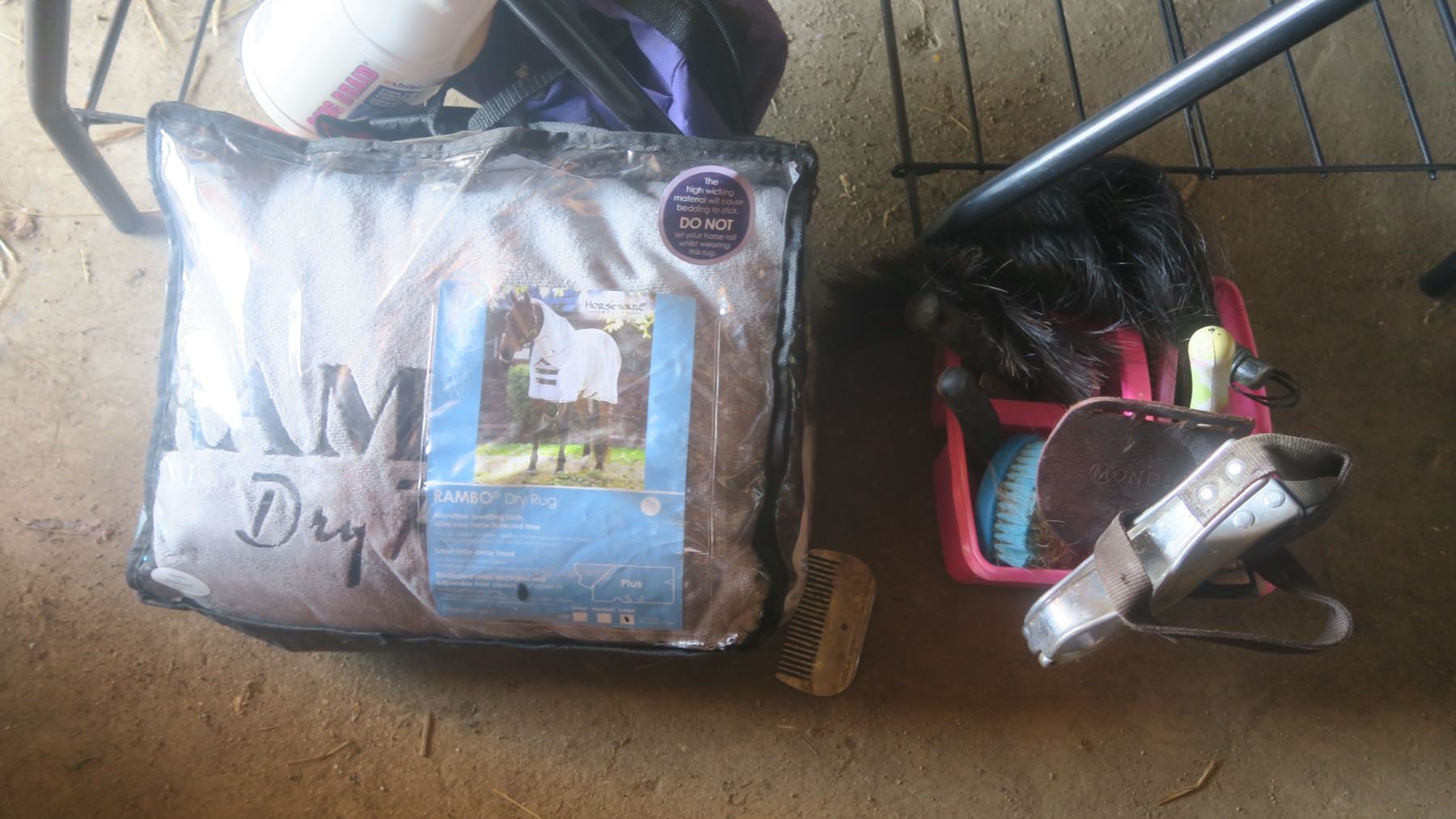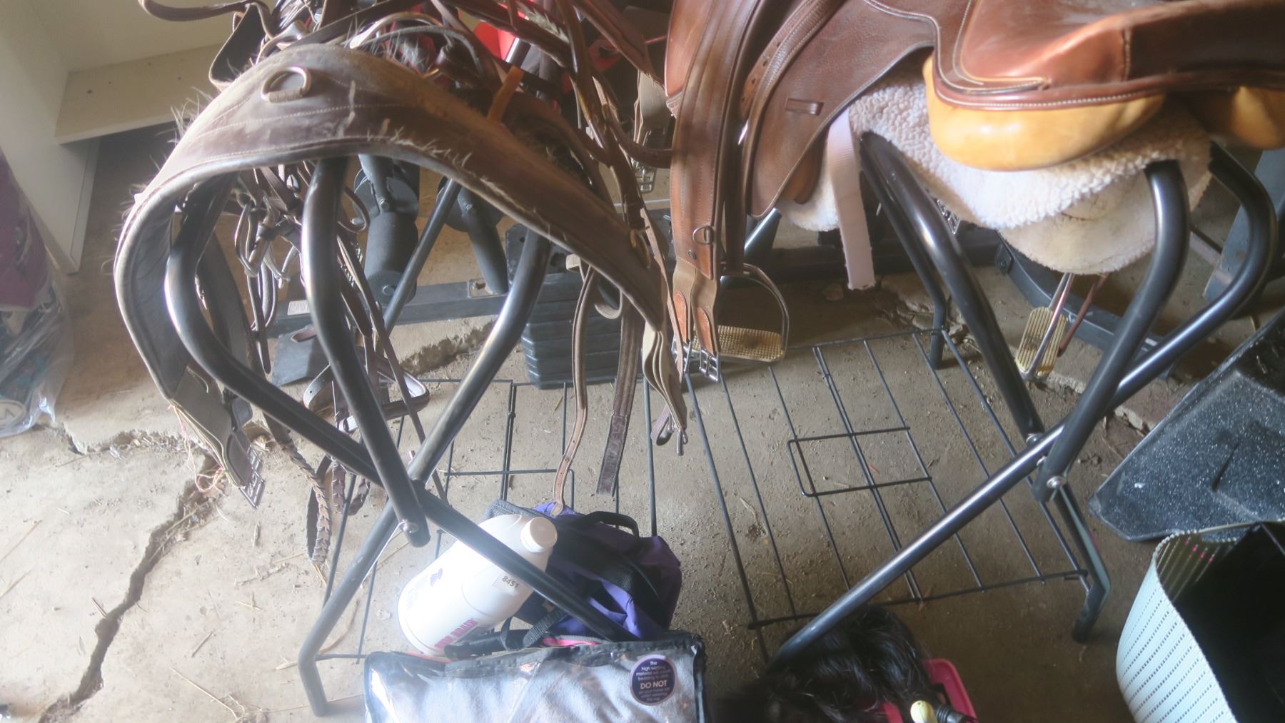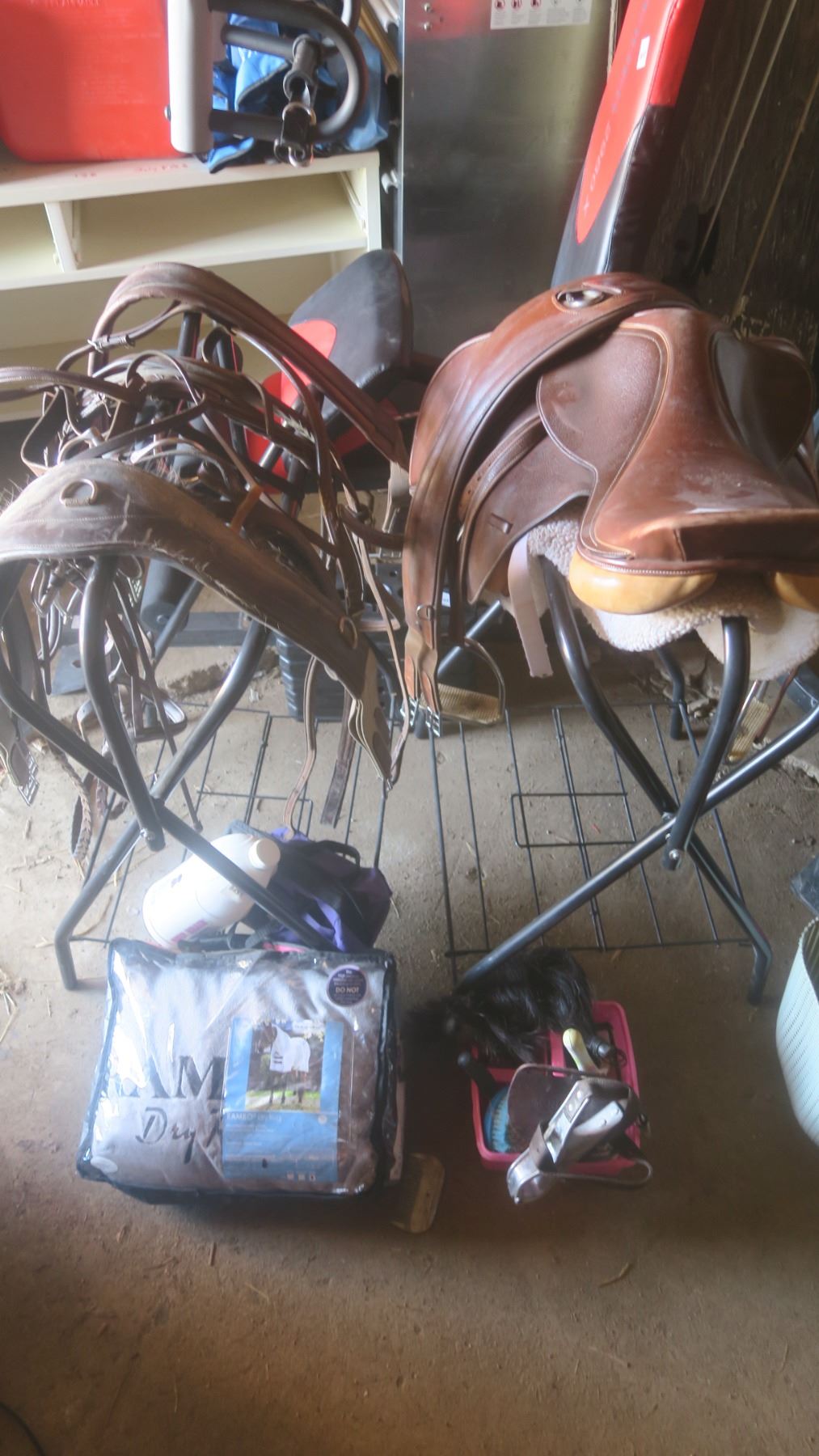 lot of horse supplies - saddle, 2 saddle stands, blanket, brushes, bits, etc.