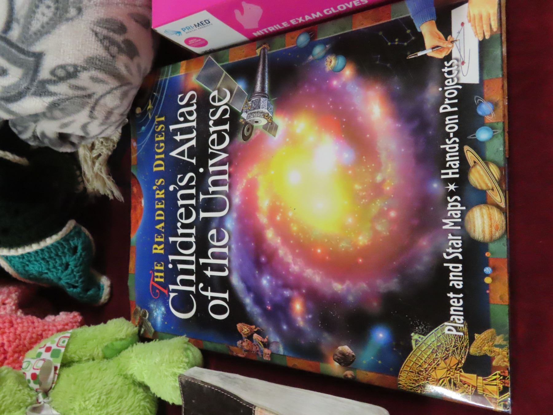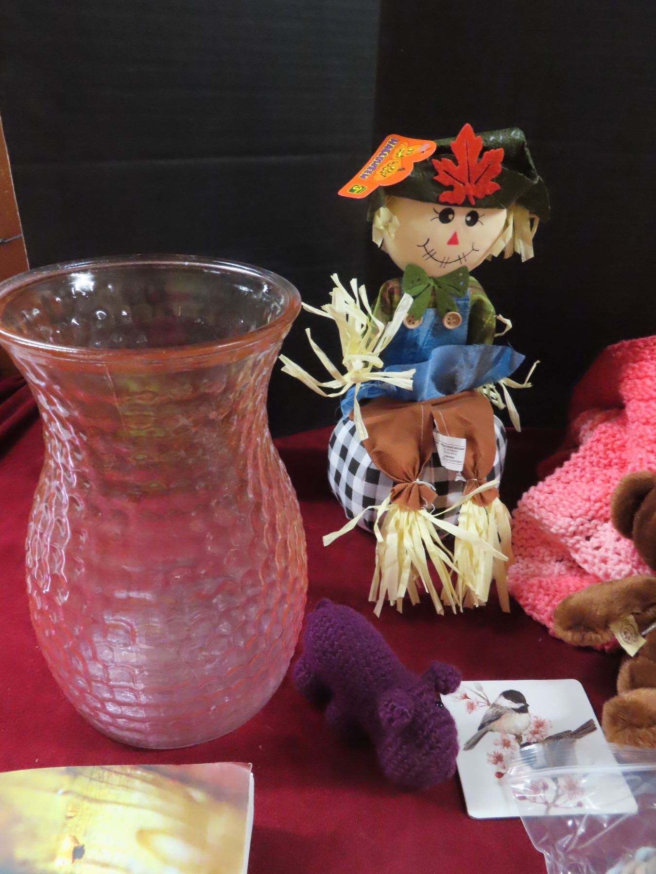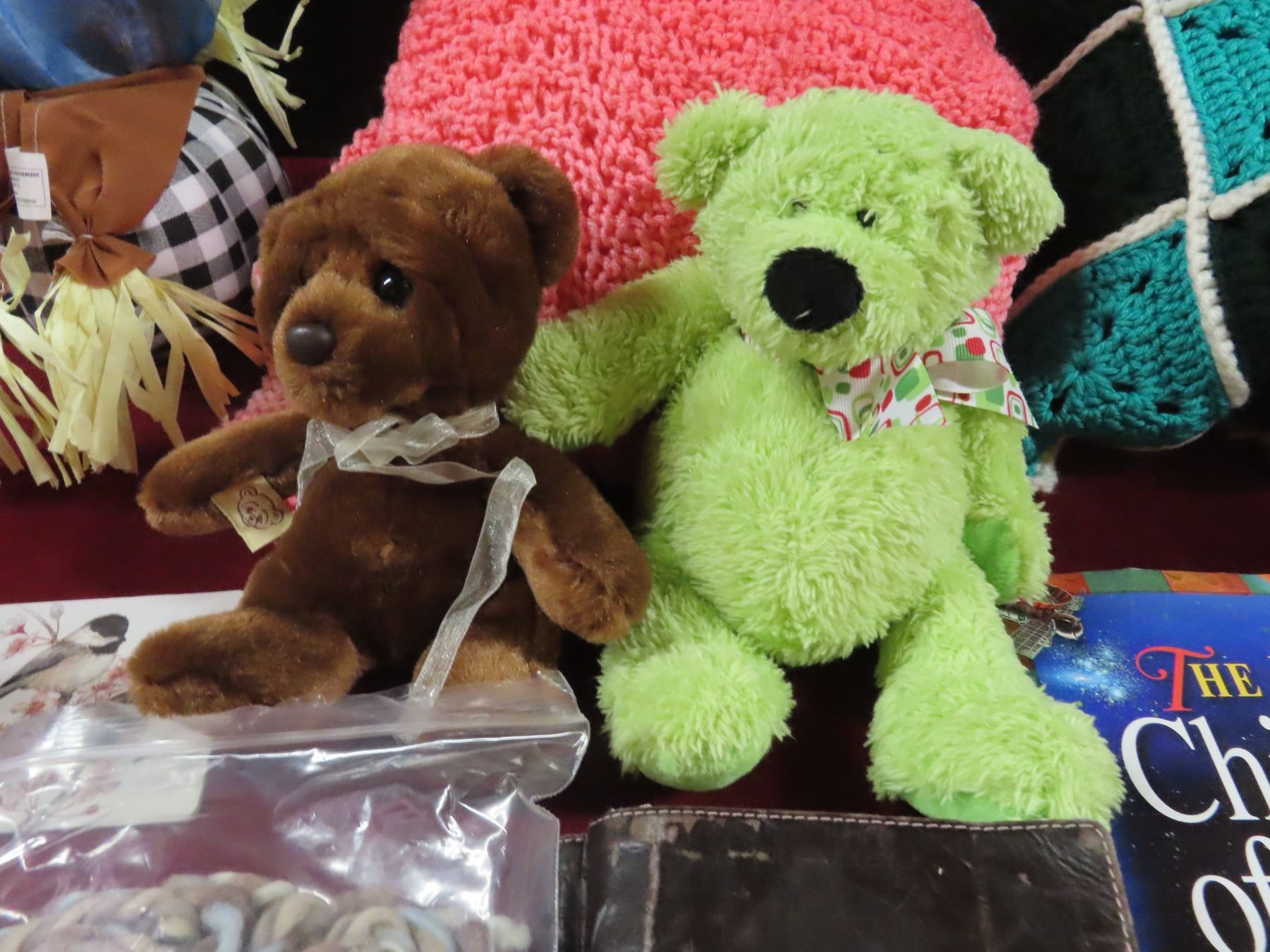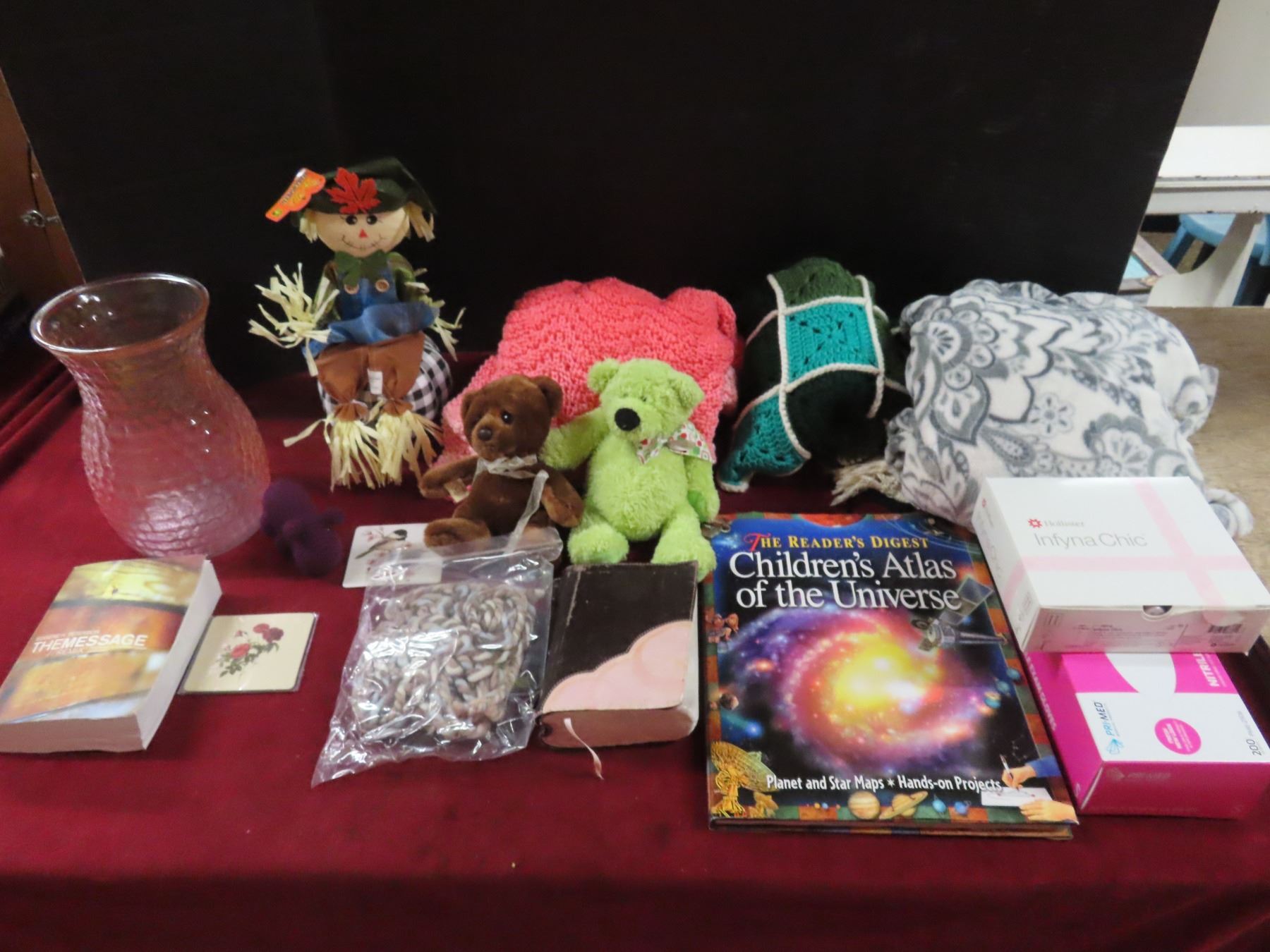 lot of misc blankets , teddy bears , flower vase , childrens atlas