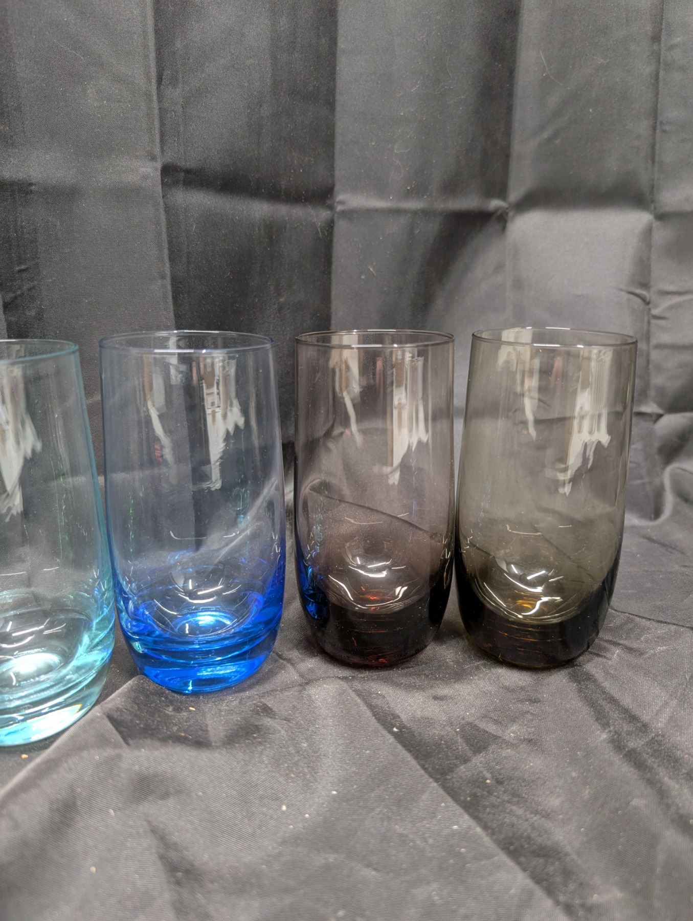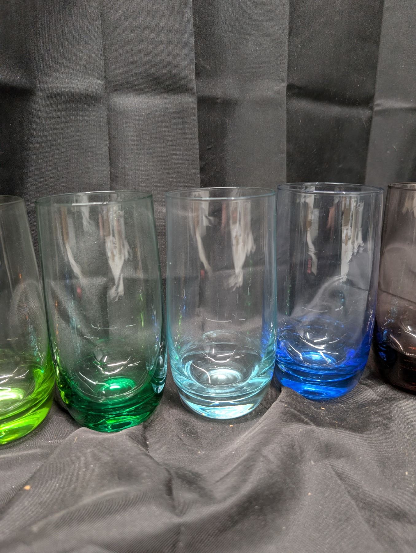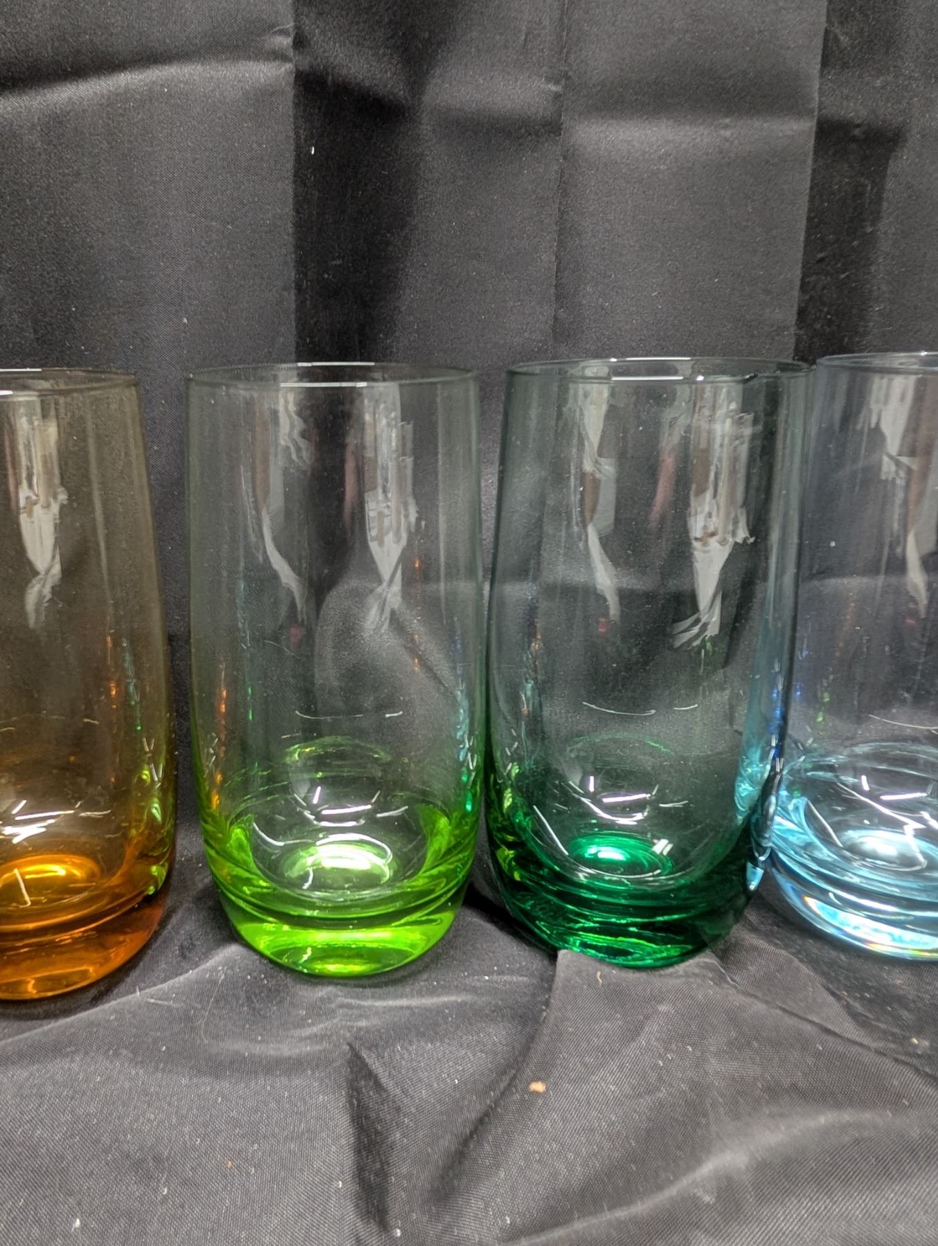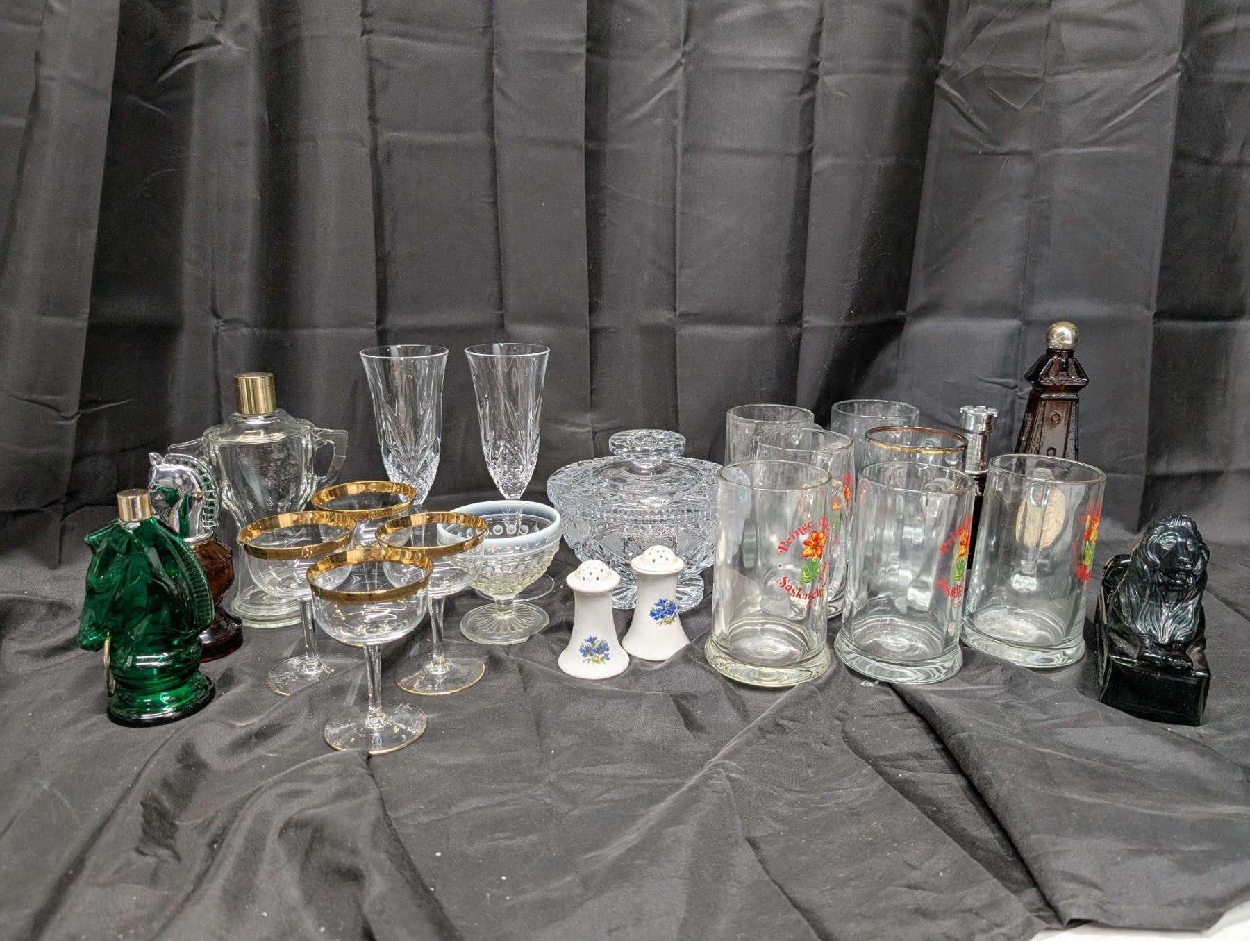 lot of multi colour glass cups, Pints, salt and pepper shakers, glass decor, and etc.