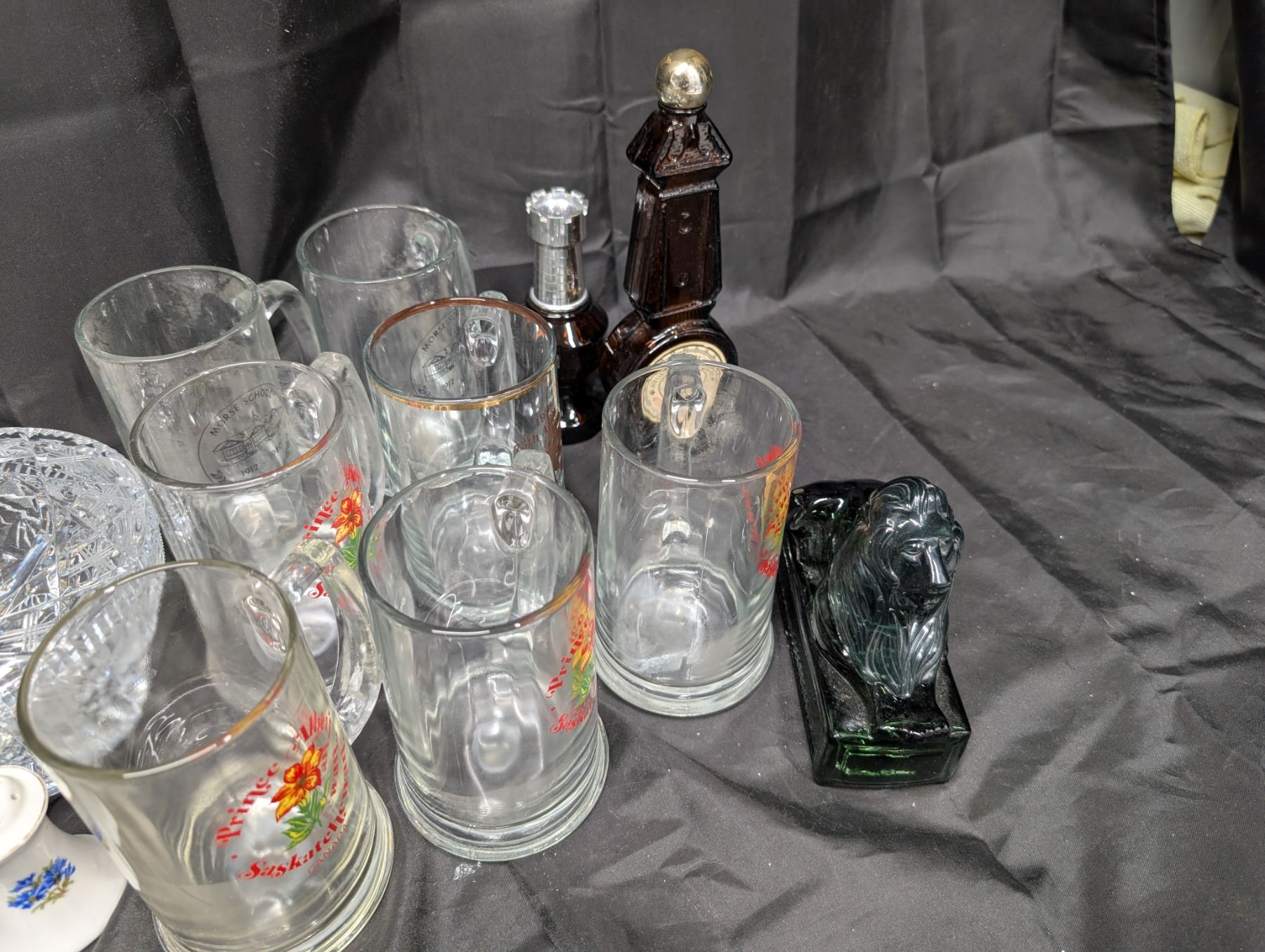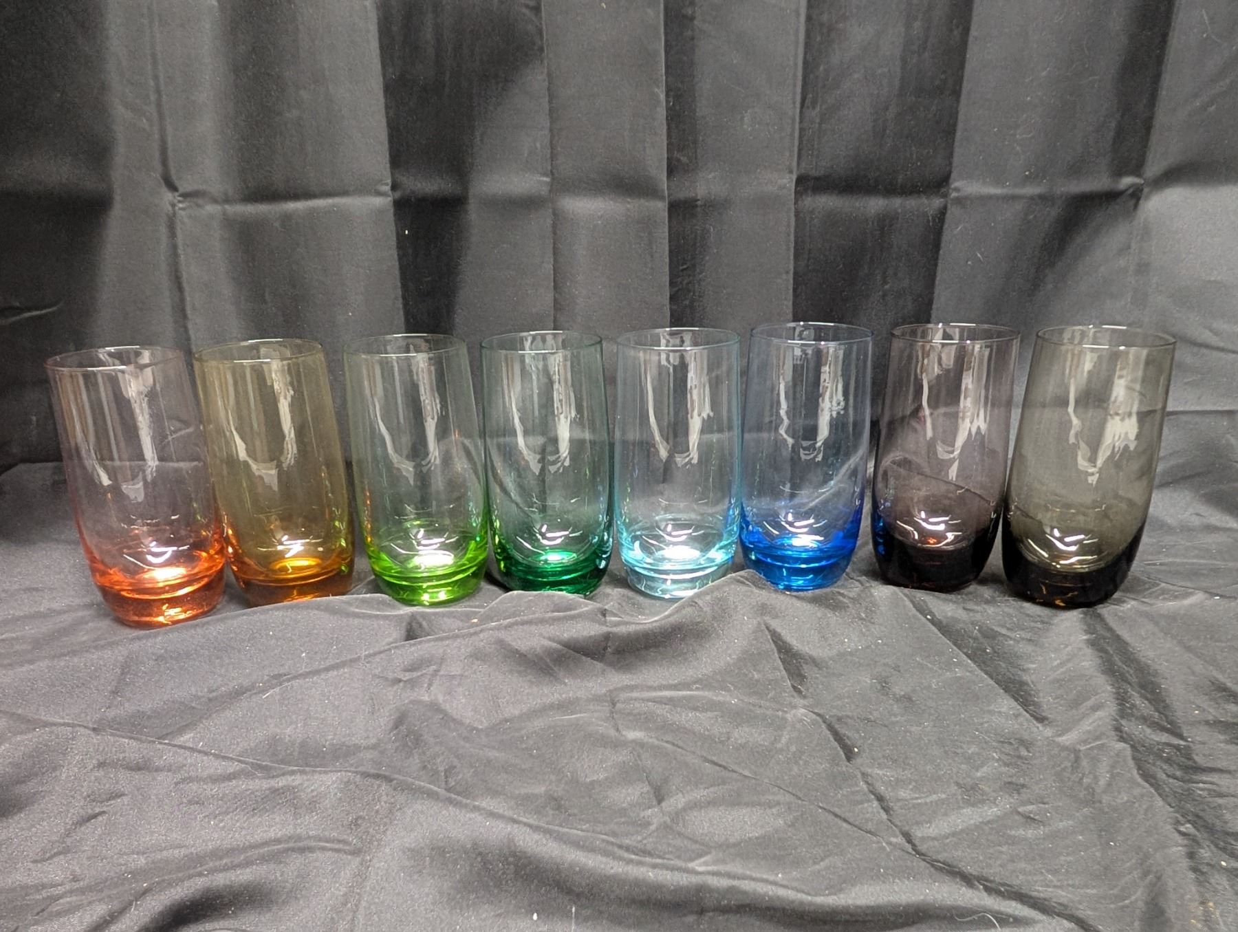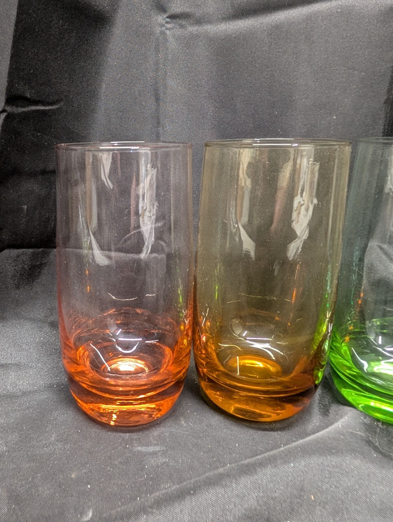 lot of multi colour glass cups, Pints, salt and pepper shakers, glass decor, and etc.