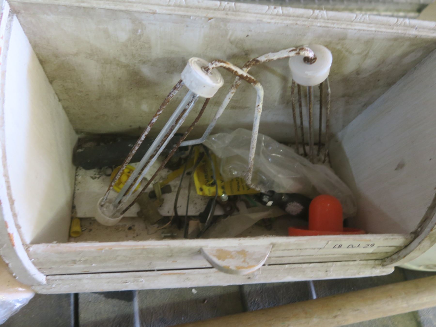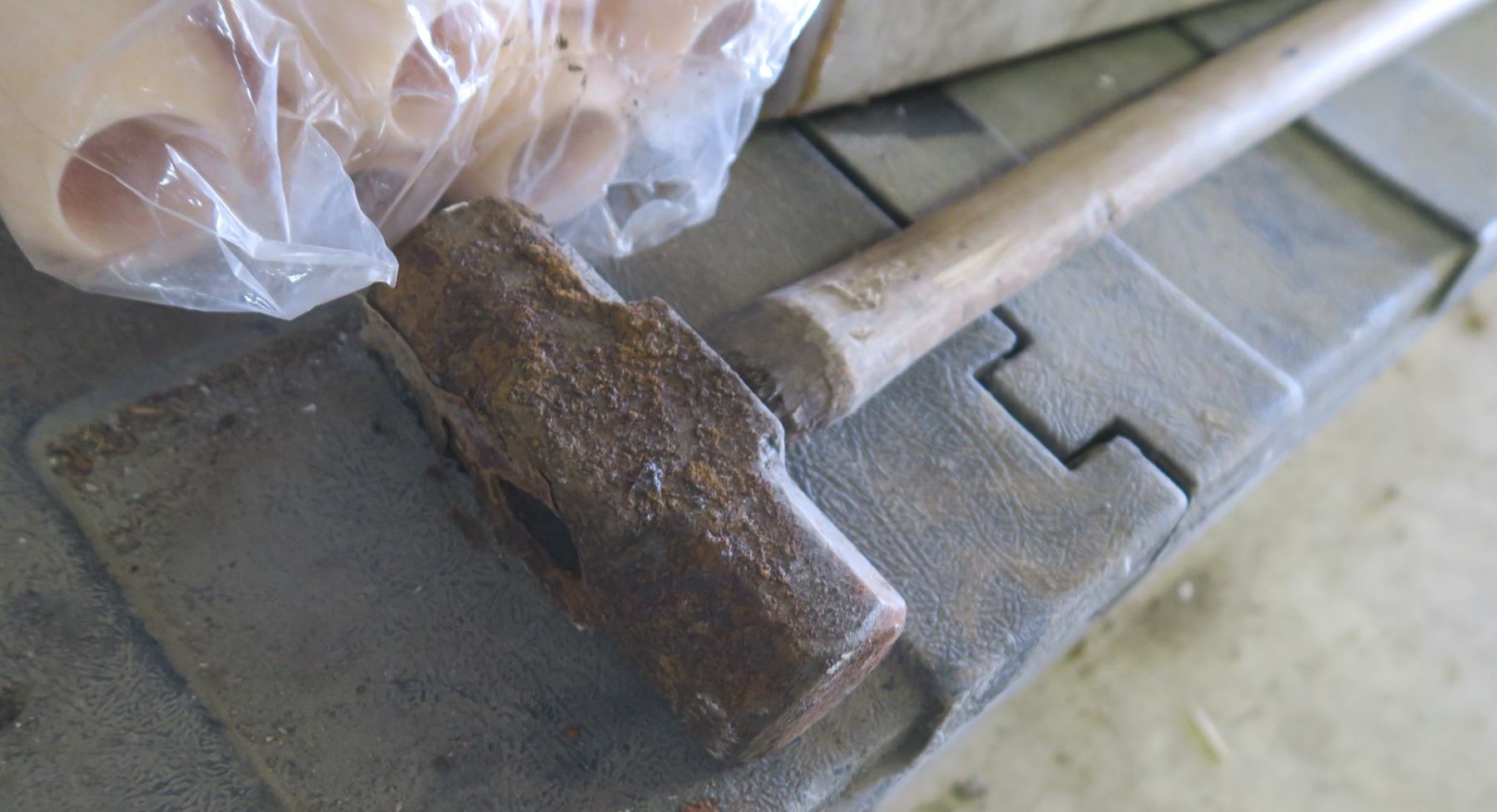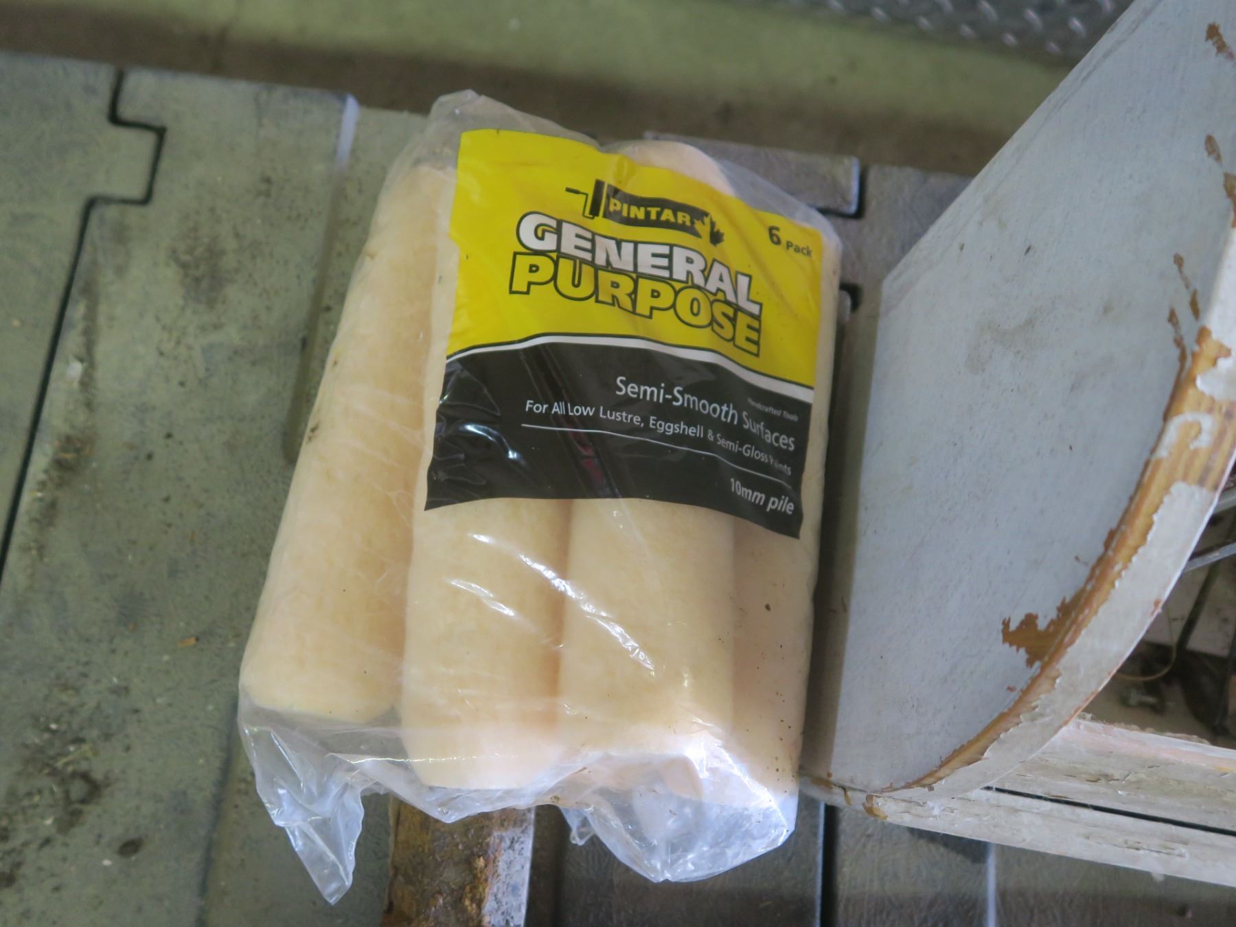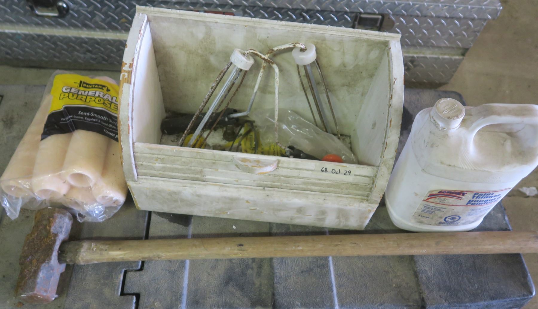 lot of painting supplies and sledge hammer