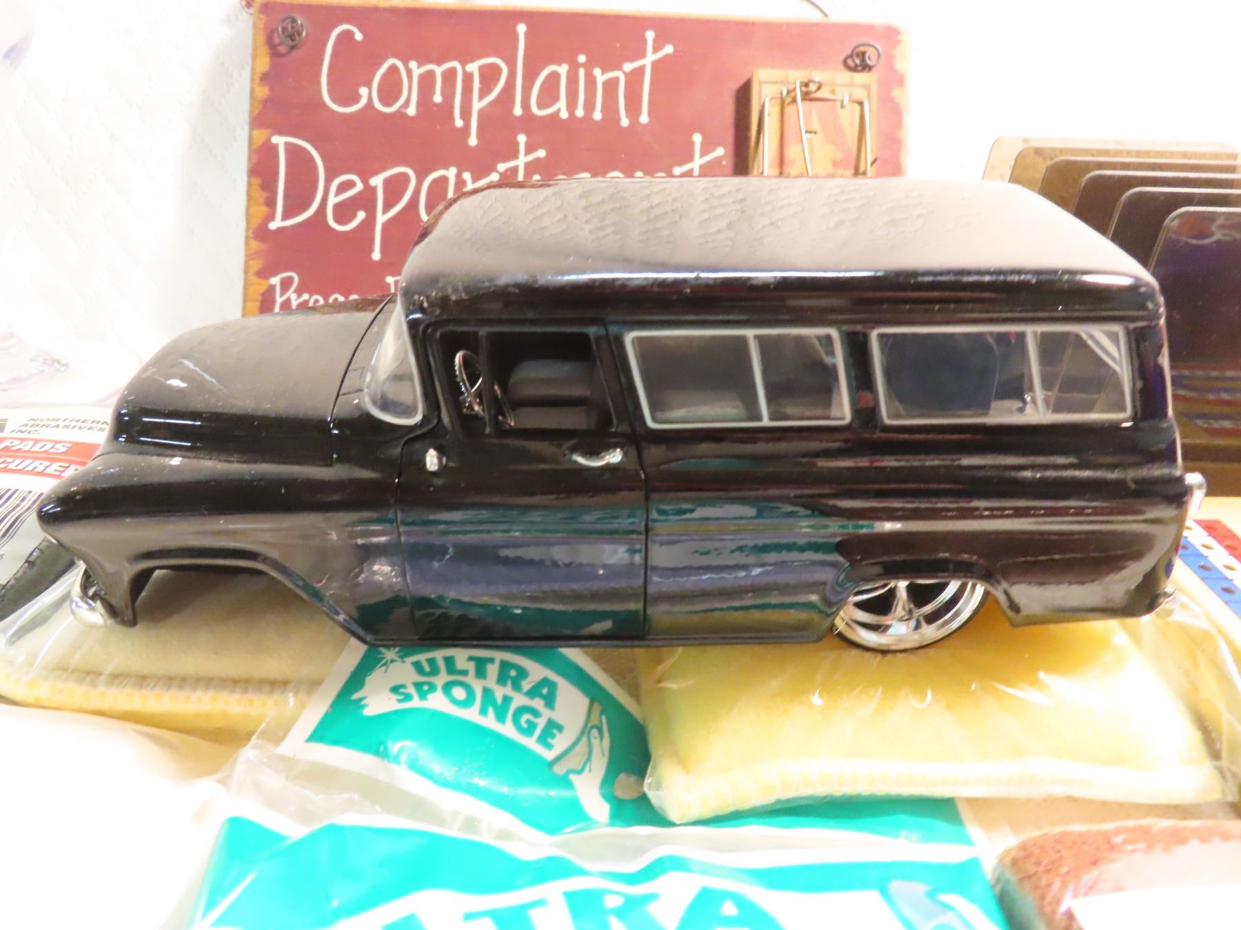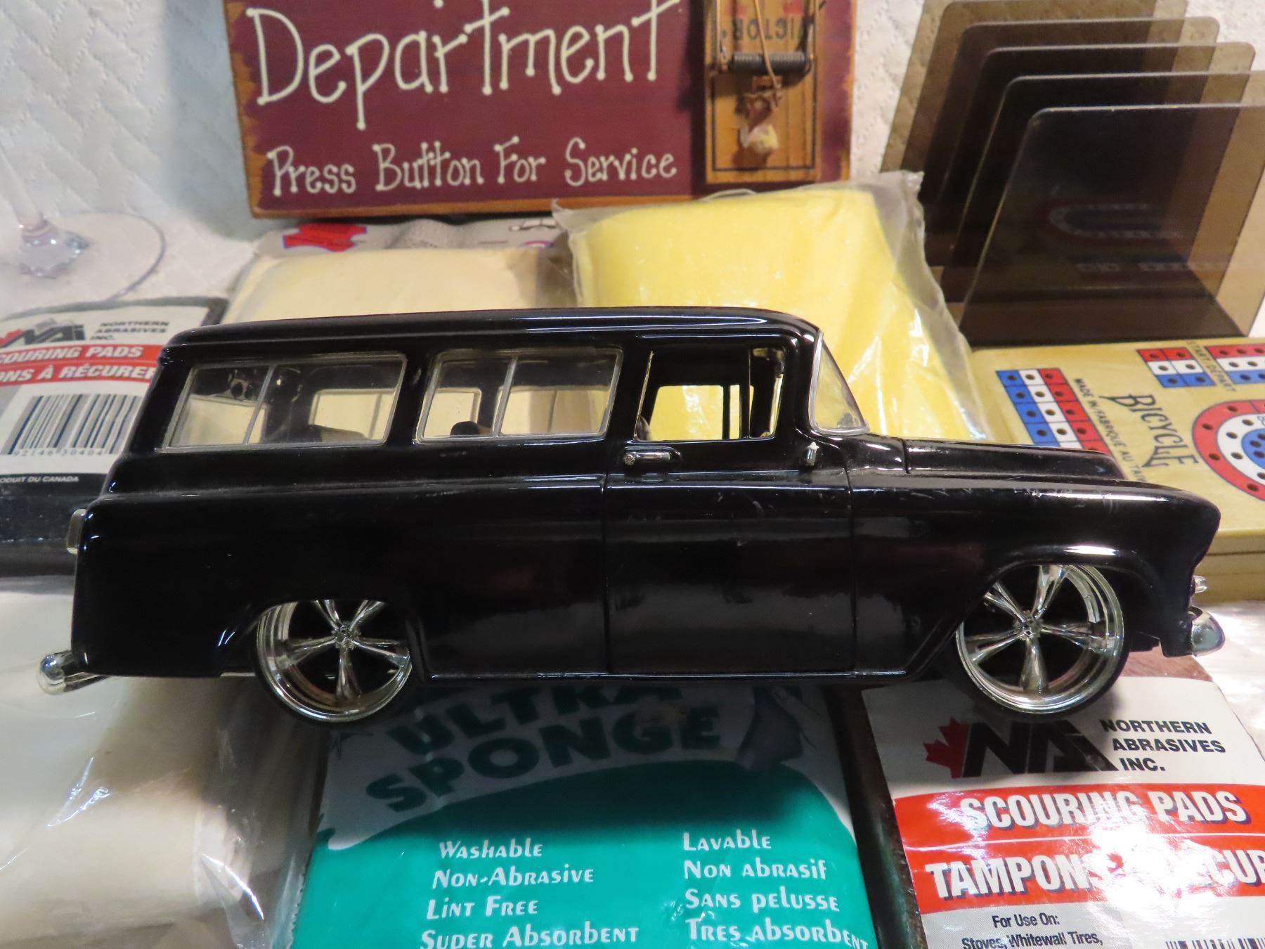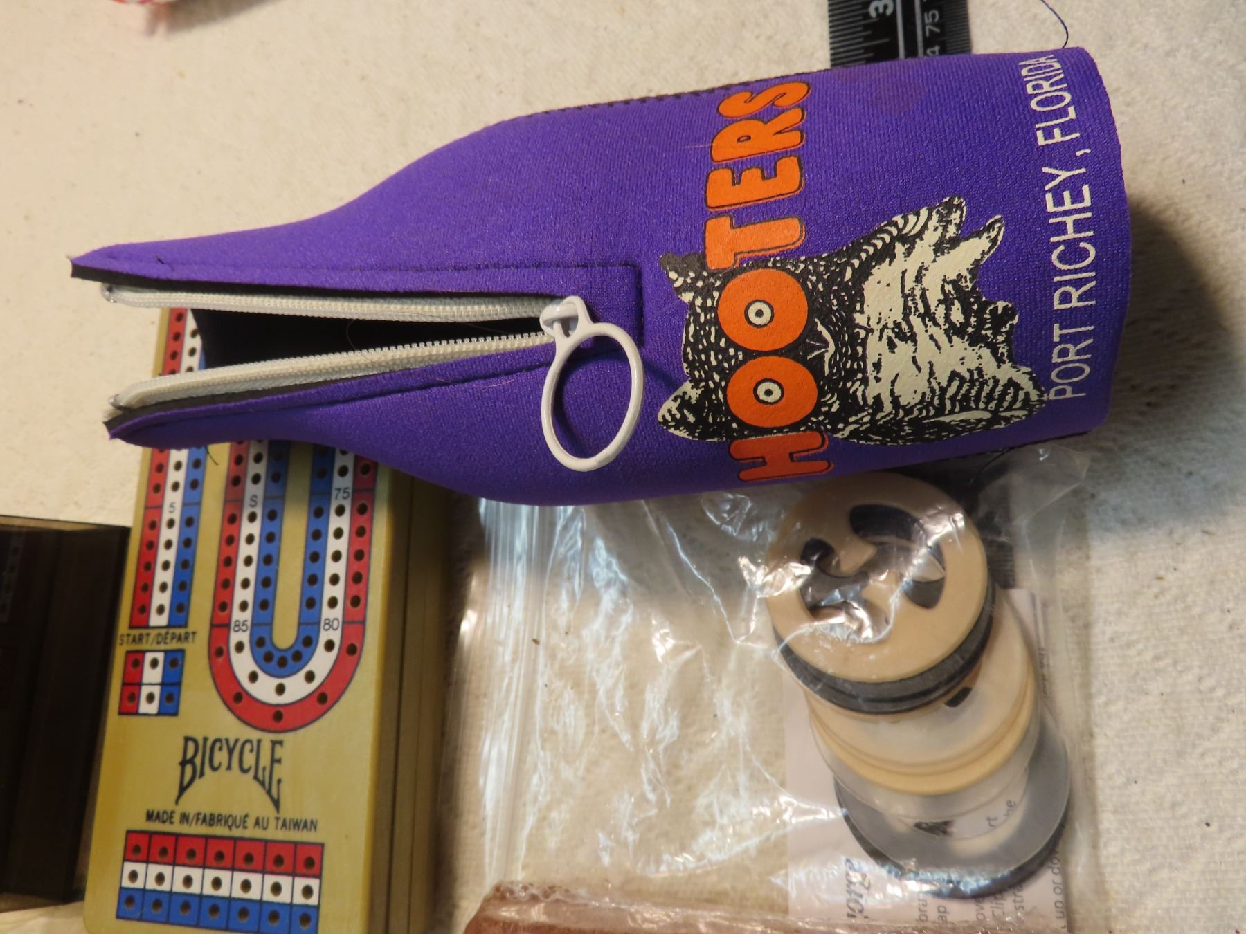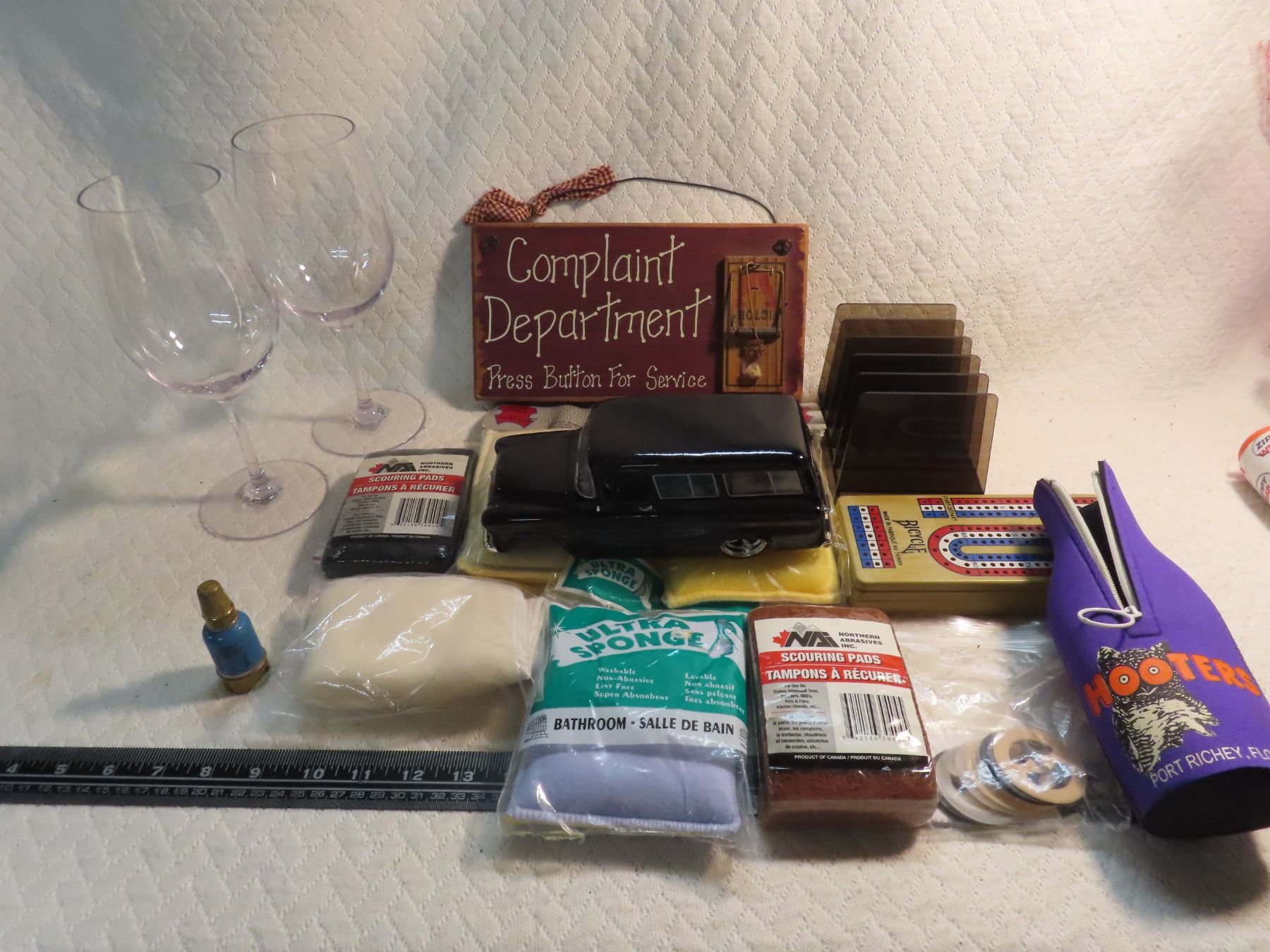 lot of treasures, bra clips, hooters coolie, wine glasses, 57 chevy model, misc.