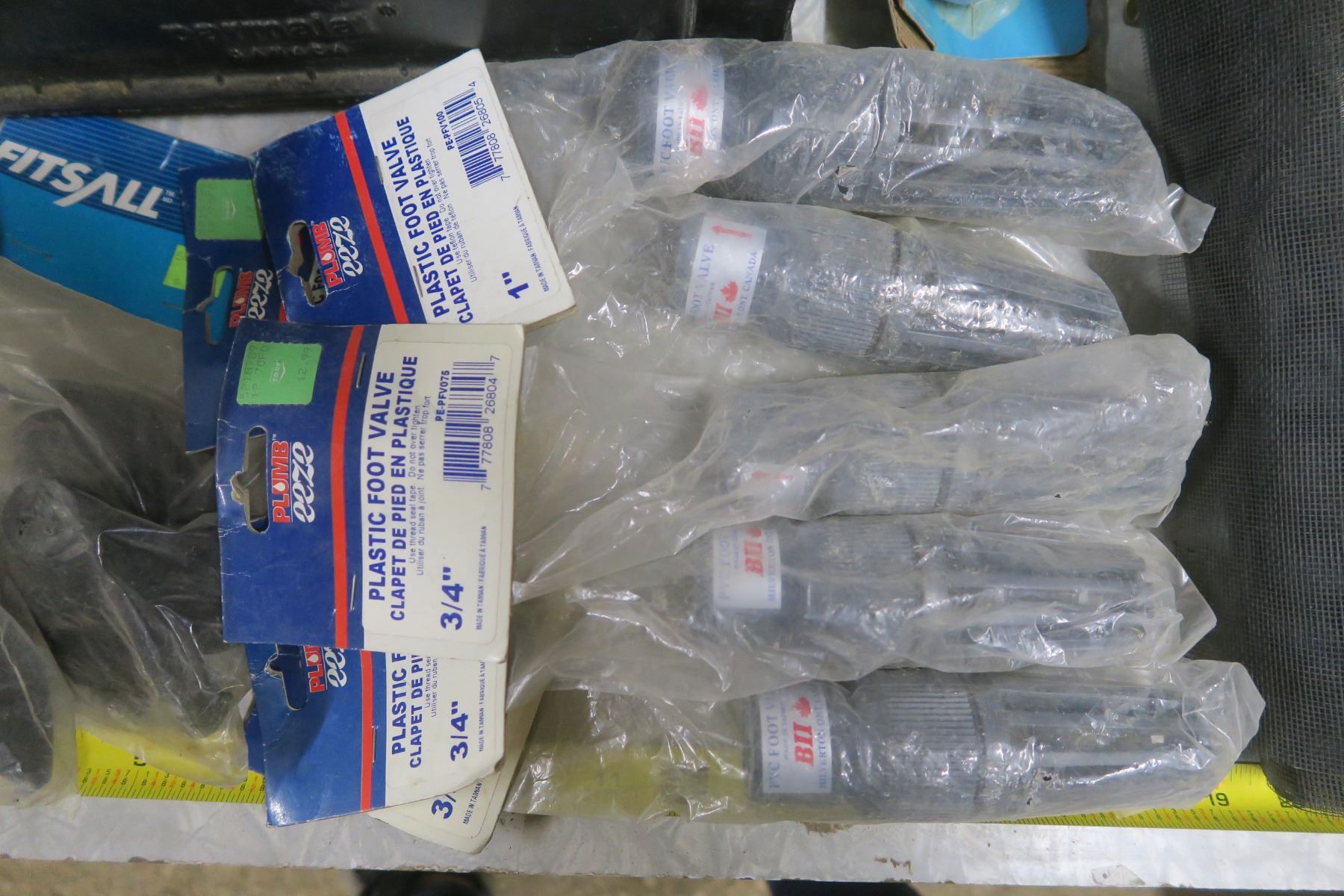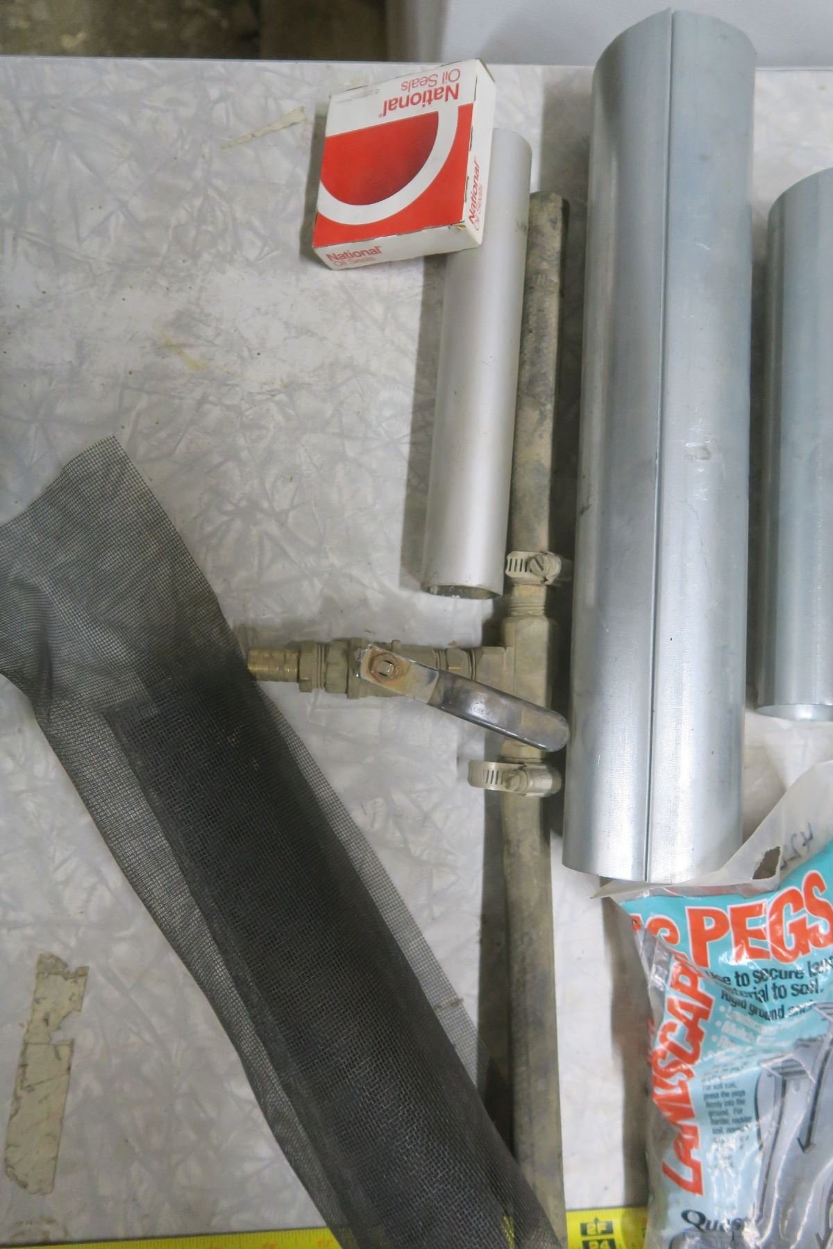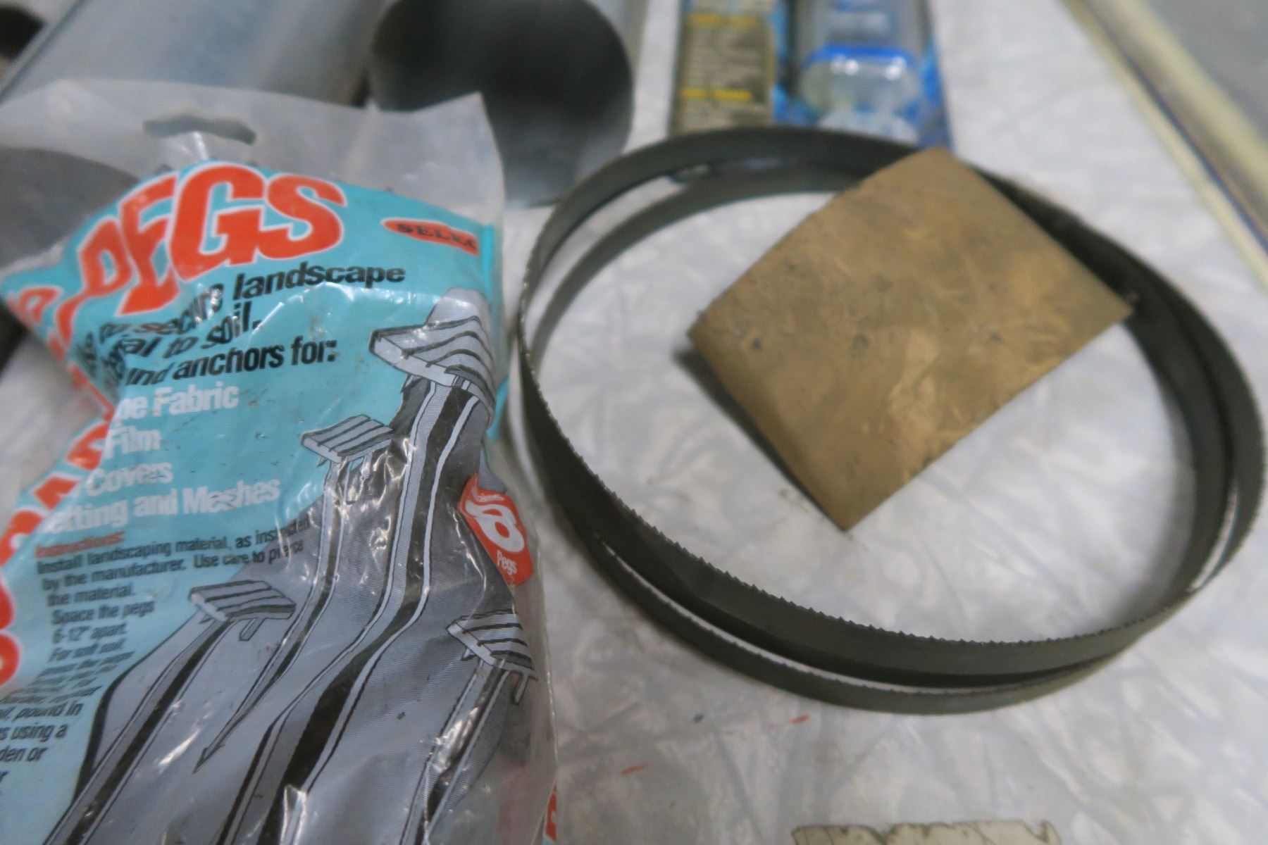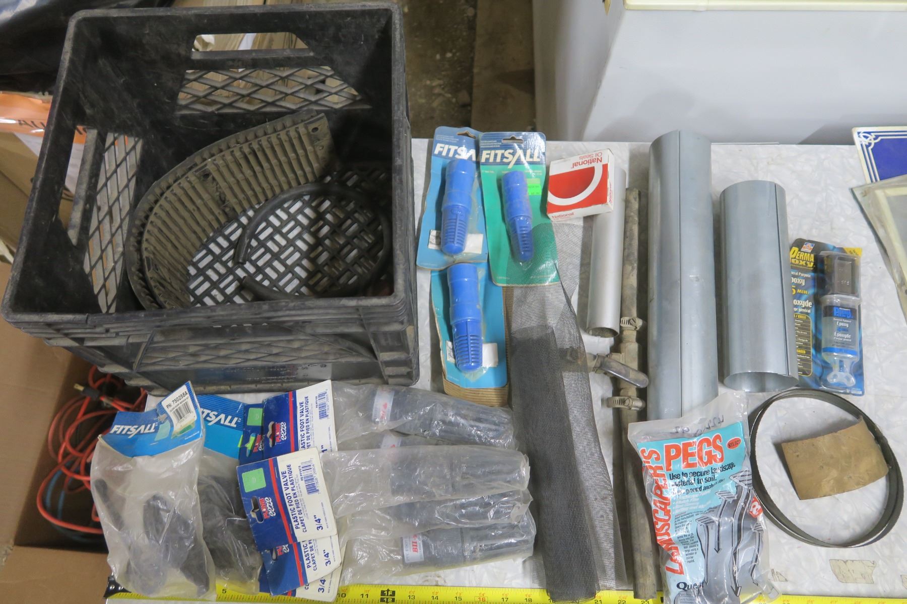 milk crate of assorted hardware, foot valves, sump repair kits, epoxy, band saw blade, etc.