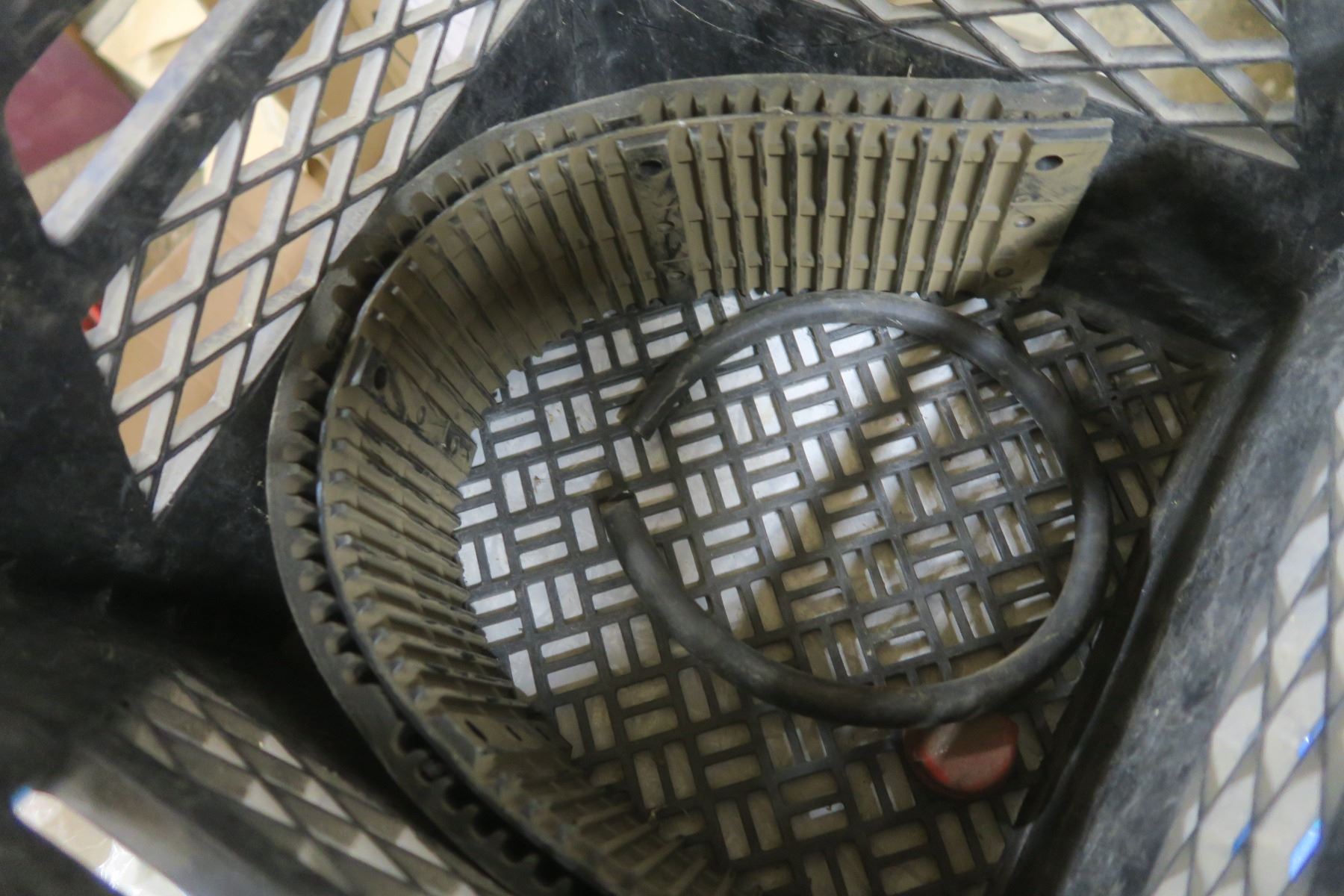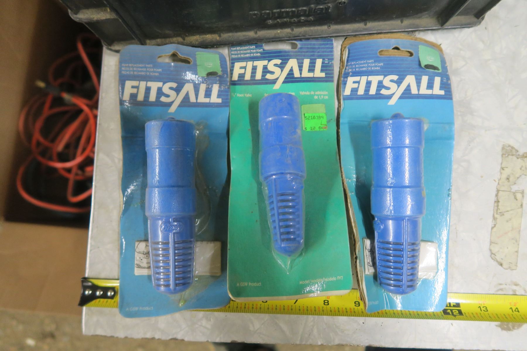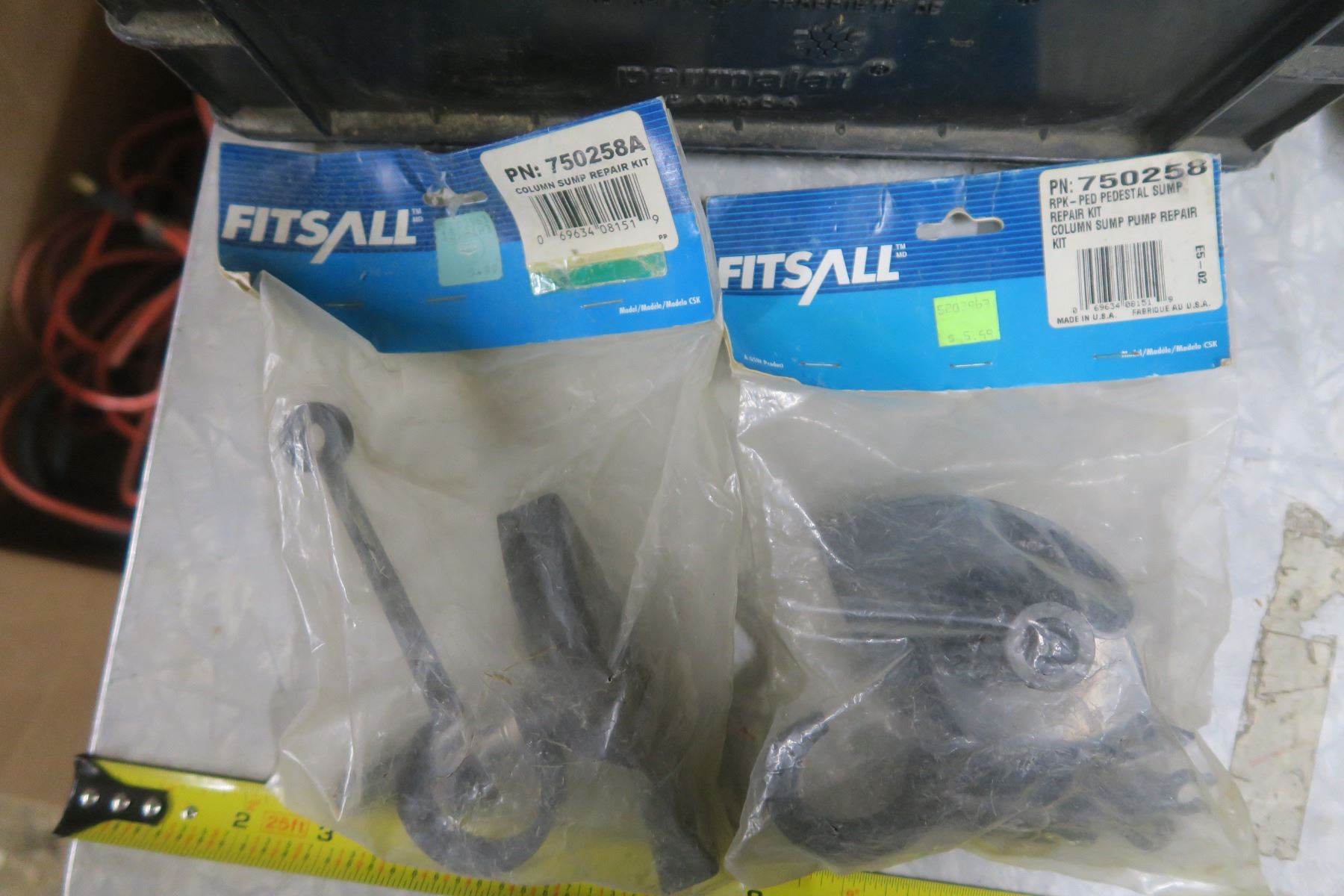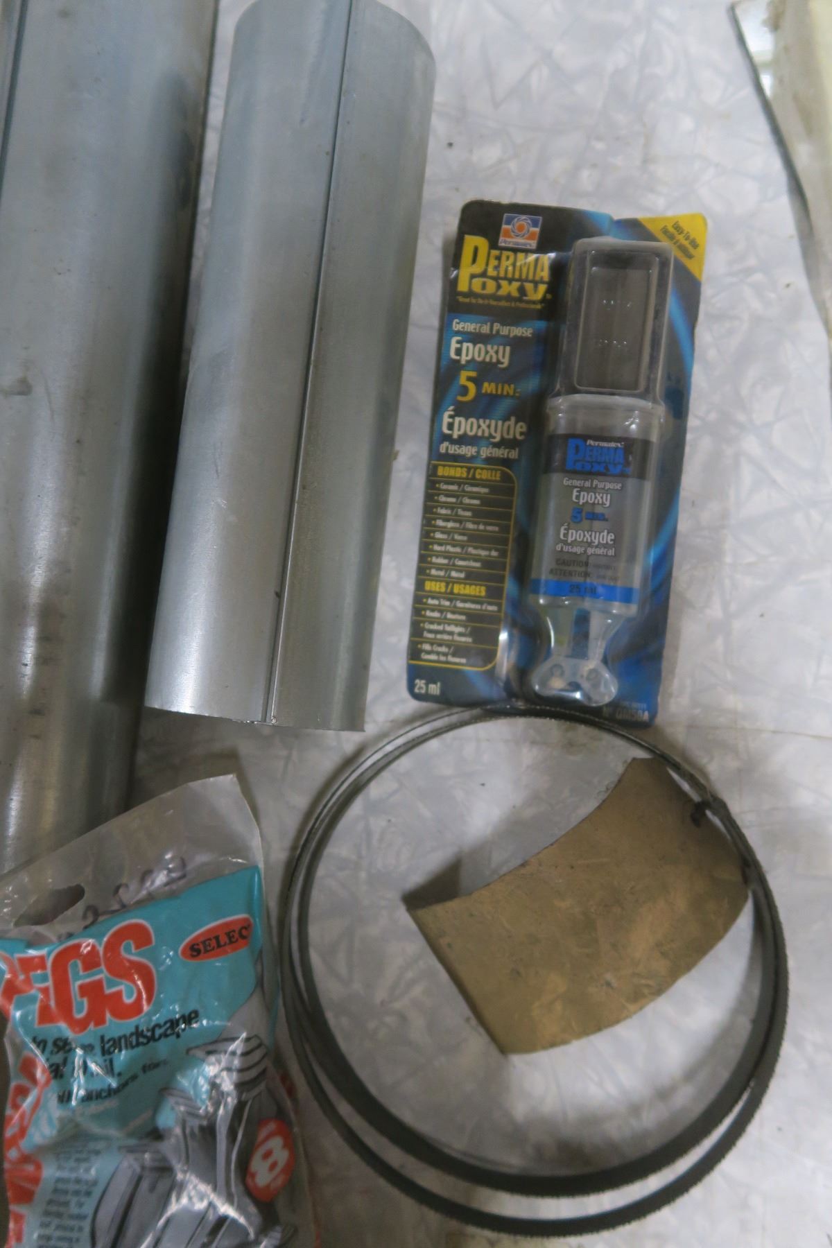 milk crate of assorted hardware, foot valves, sump repair kits, epoxy, band saw blade, etc.