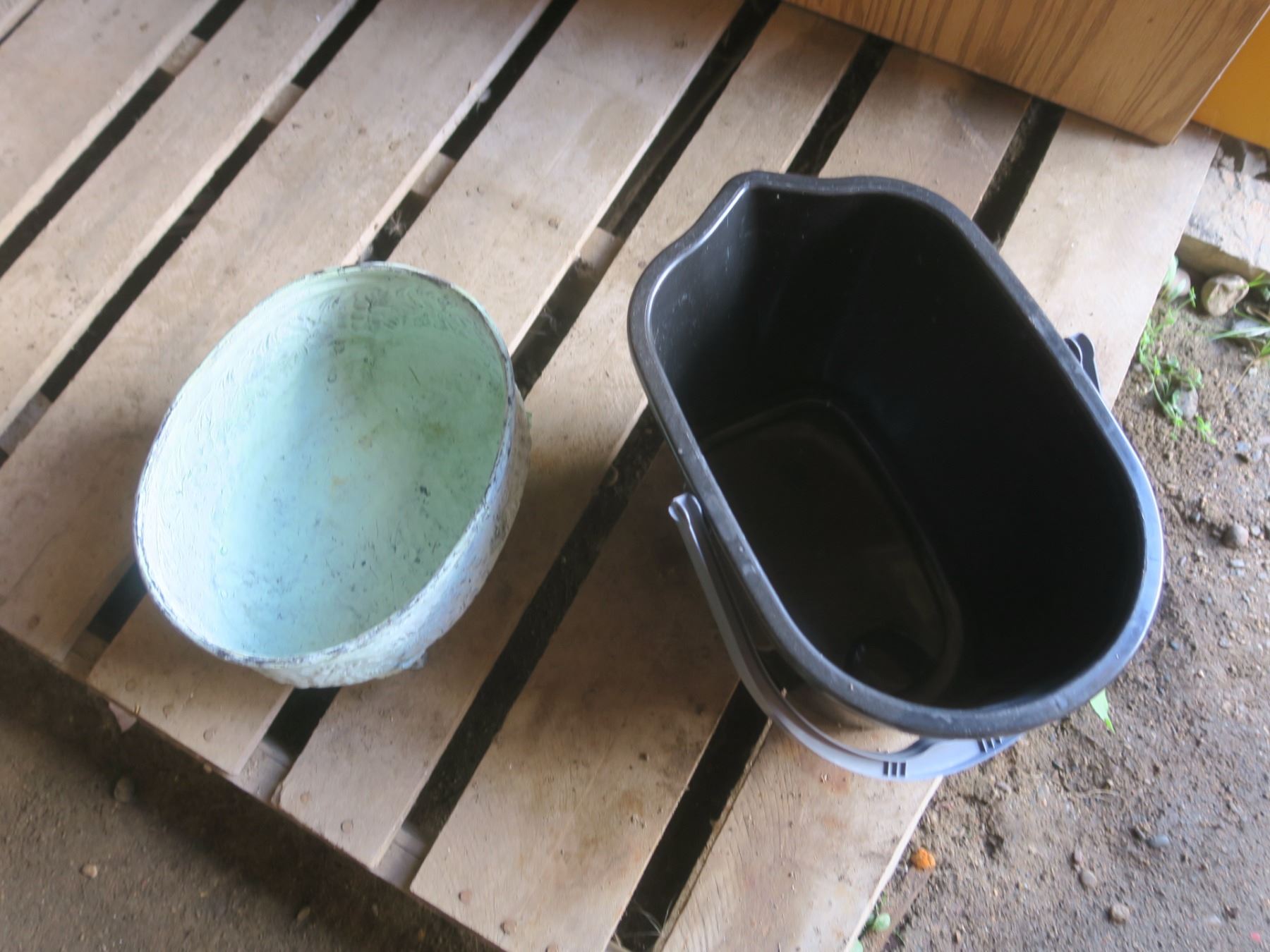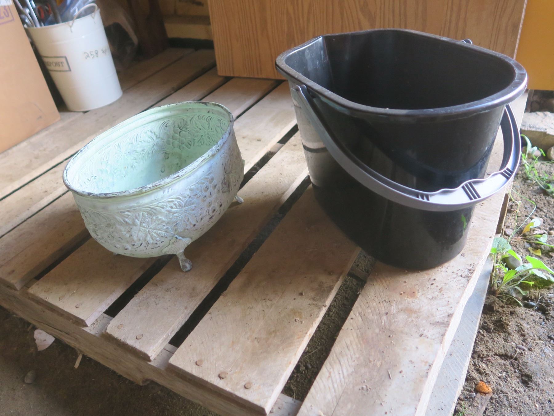 mop bucket and metal bowl