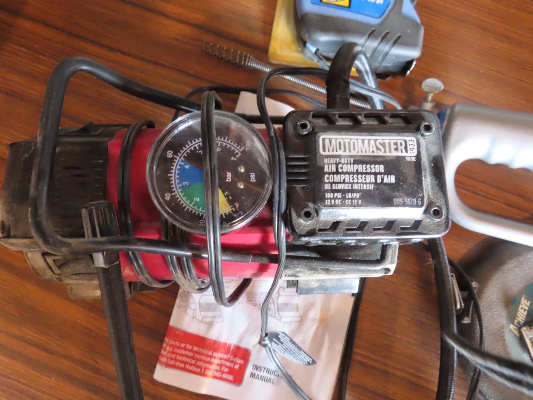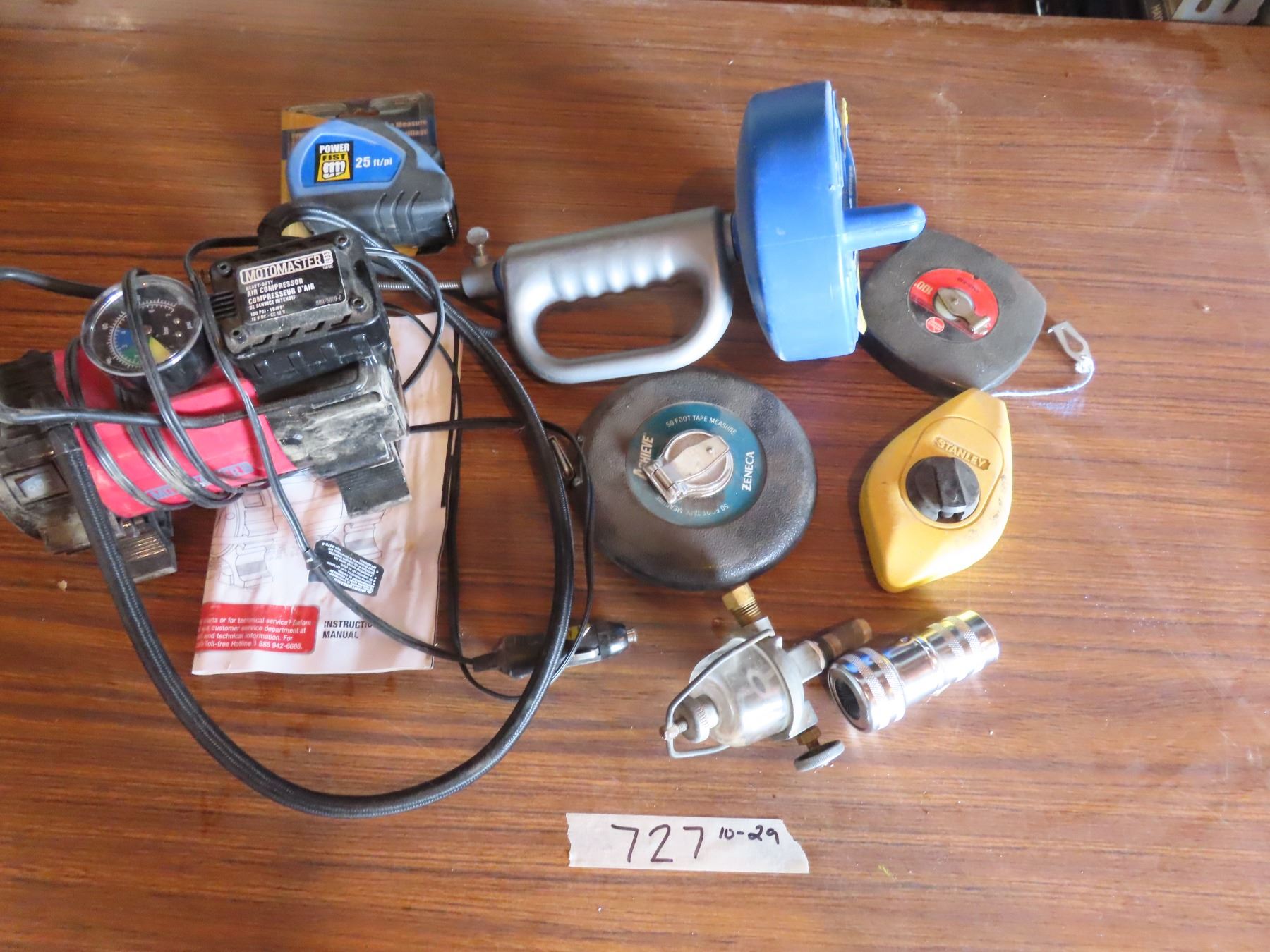 multiple tapes 50' 100' and chalk line new plumbing snake , compressor