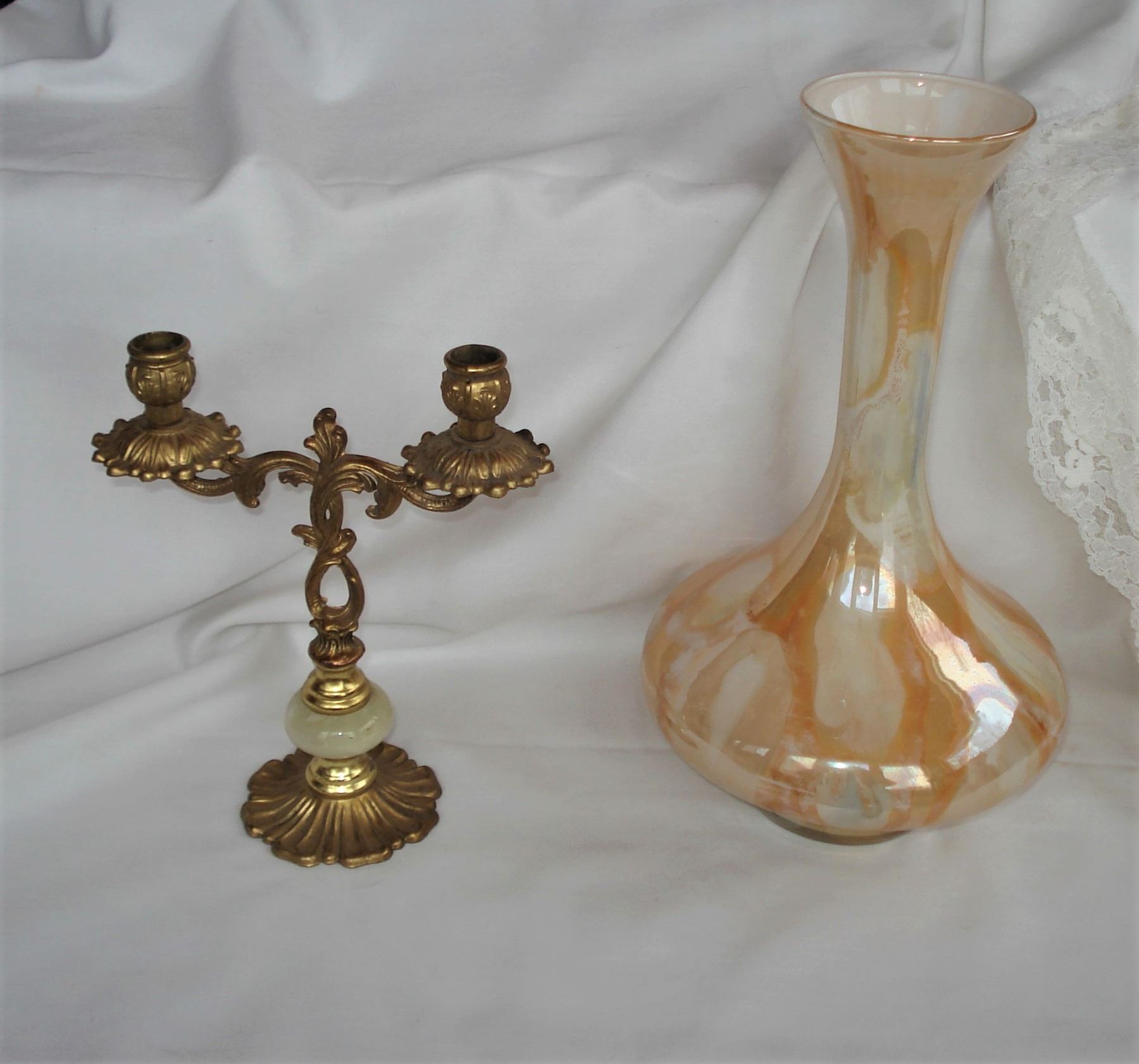 old Candelabra and marbleized iridescent vase