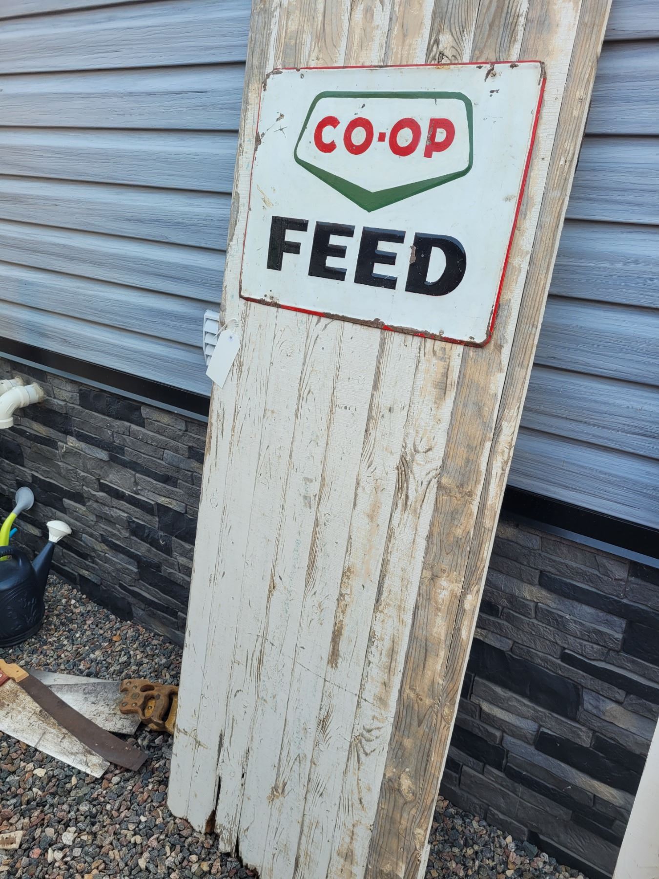 old shed door 74.5" x 27"w with CO-Op Feed metal sign 24" x 18"