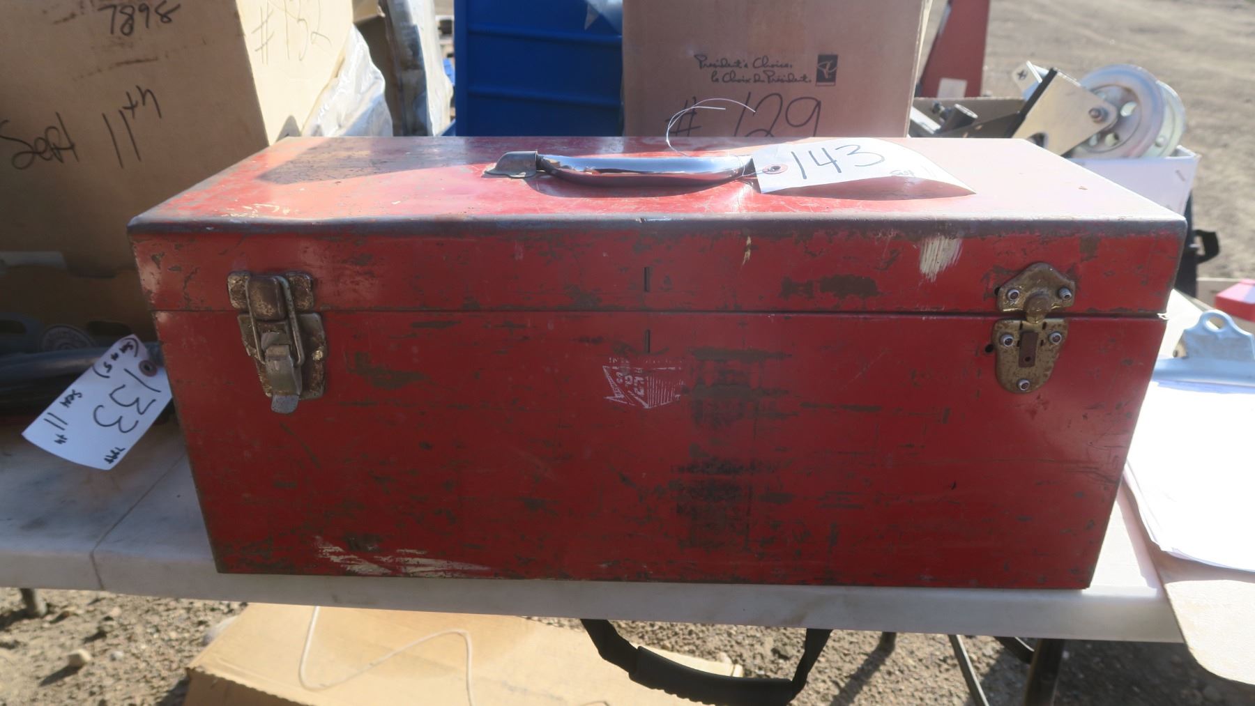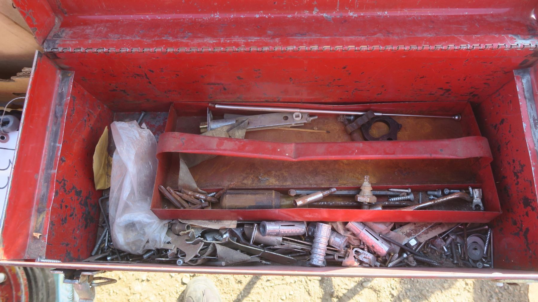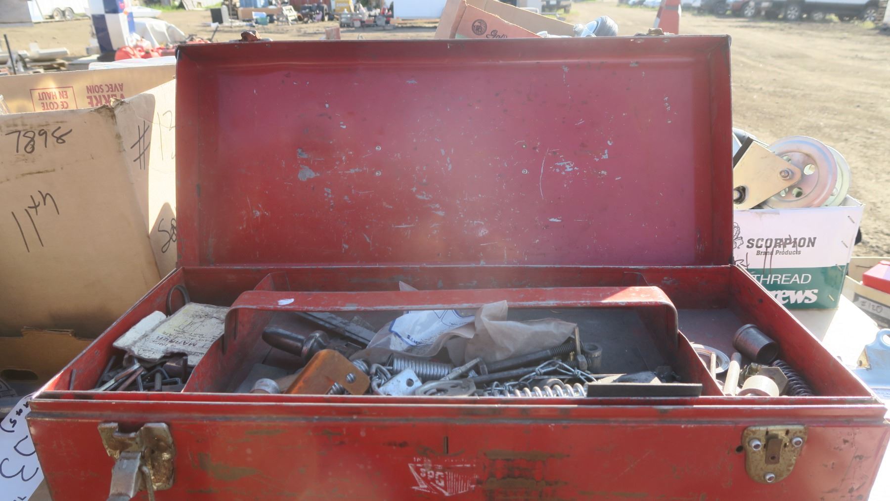 older red metal tool box with one broken latch, misc. items inside.