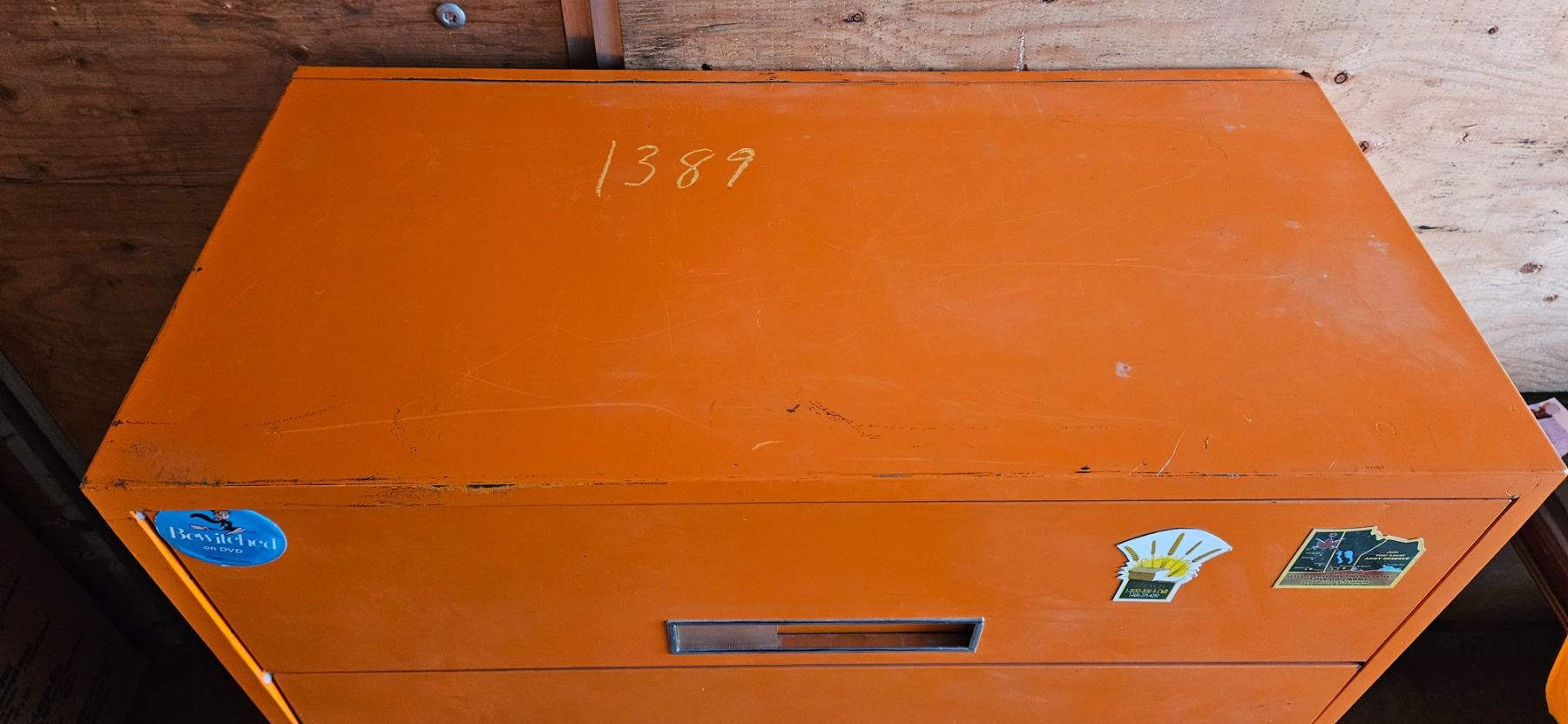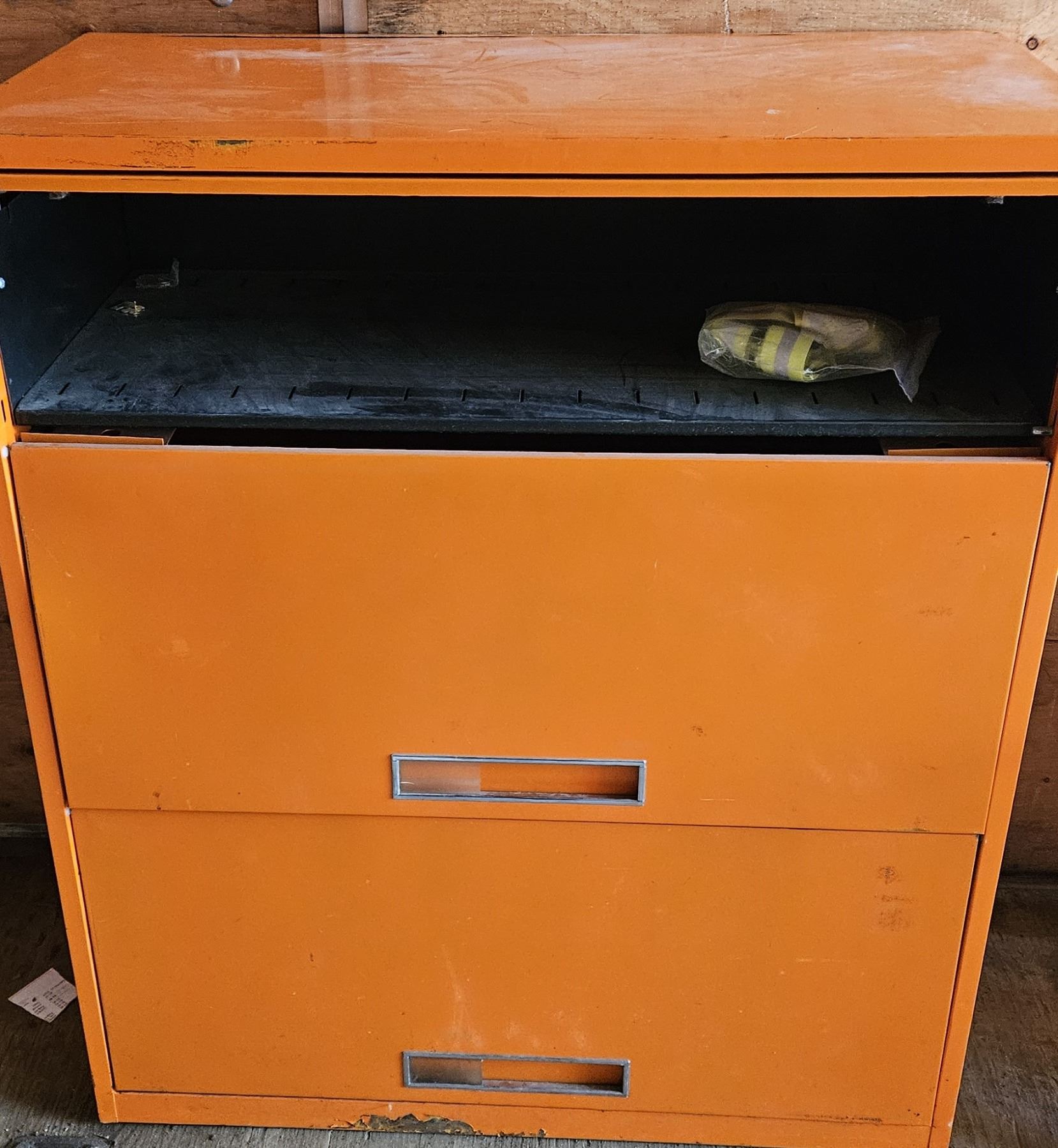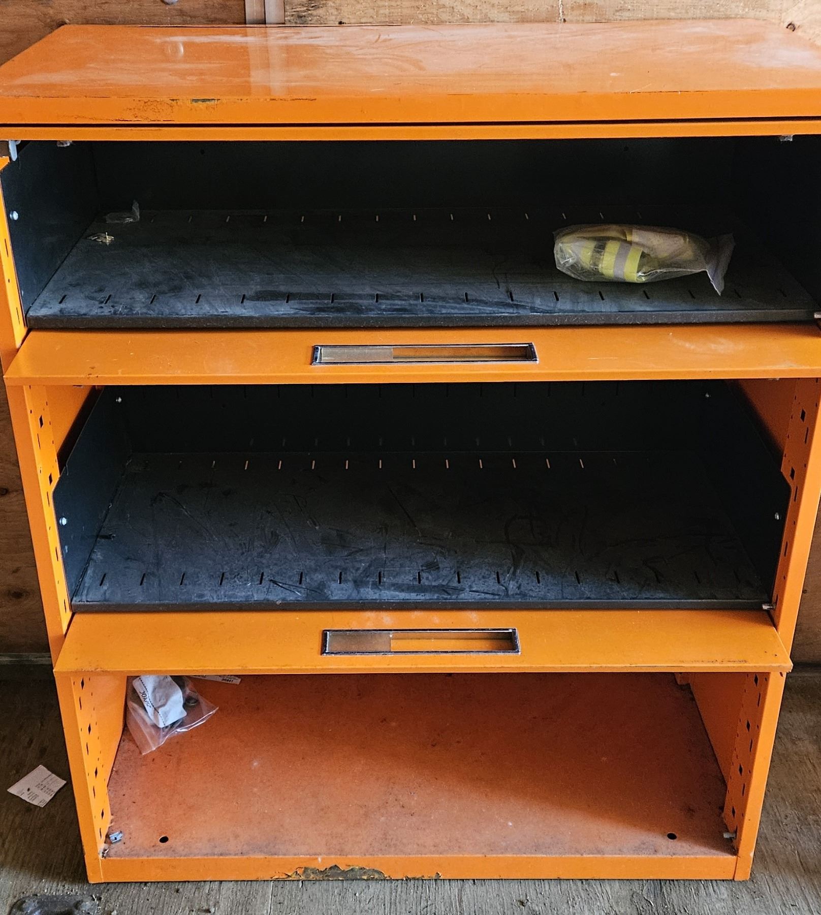 orange metal cabinet with 3 up sliding doors and HI-Vis vest - 36"x18"x42"H