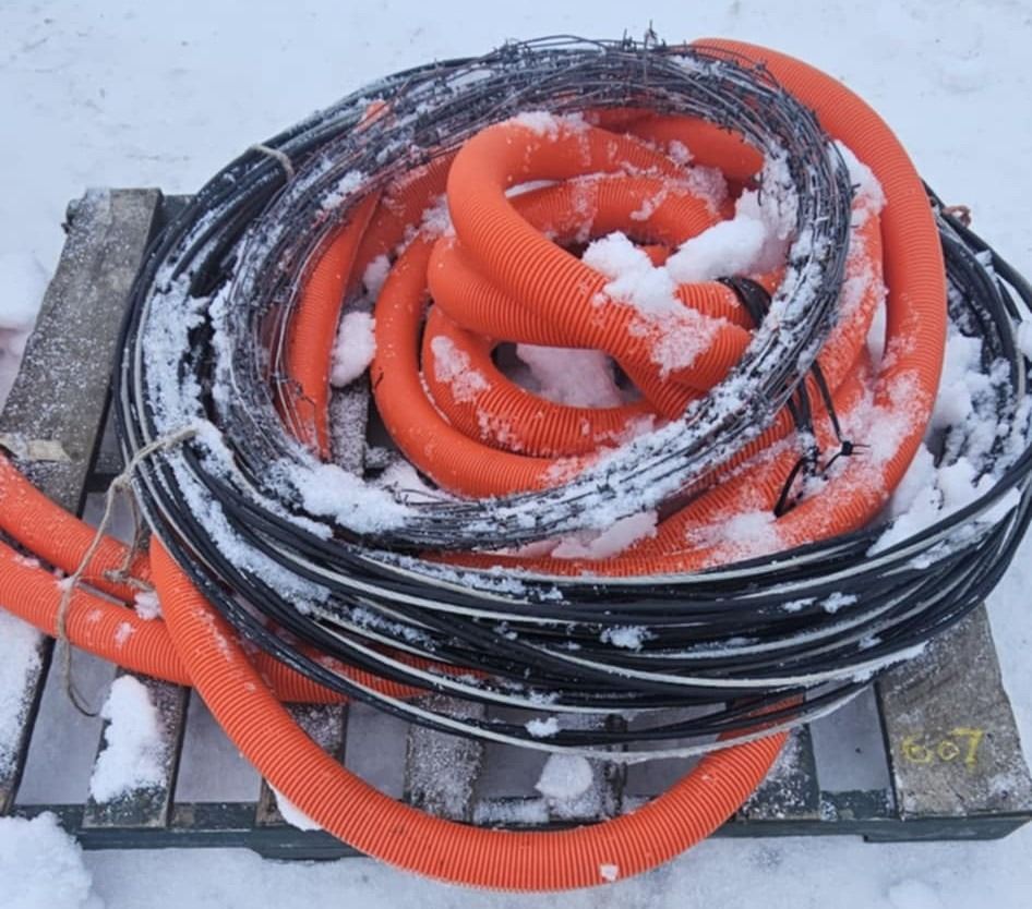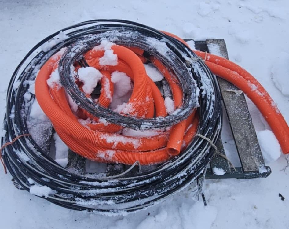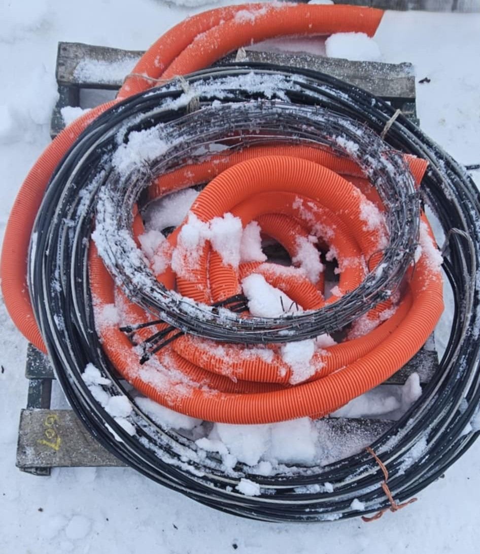 orange tubing, barb wire bundle and a bundle of wire
