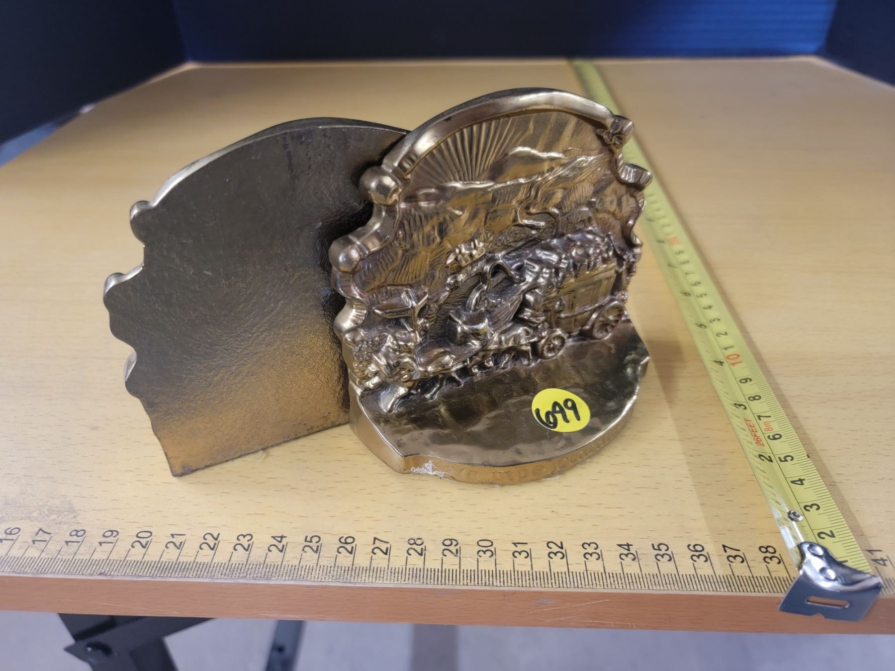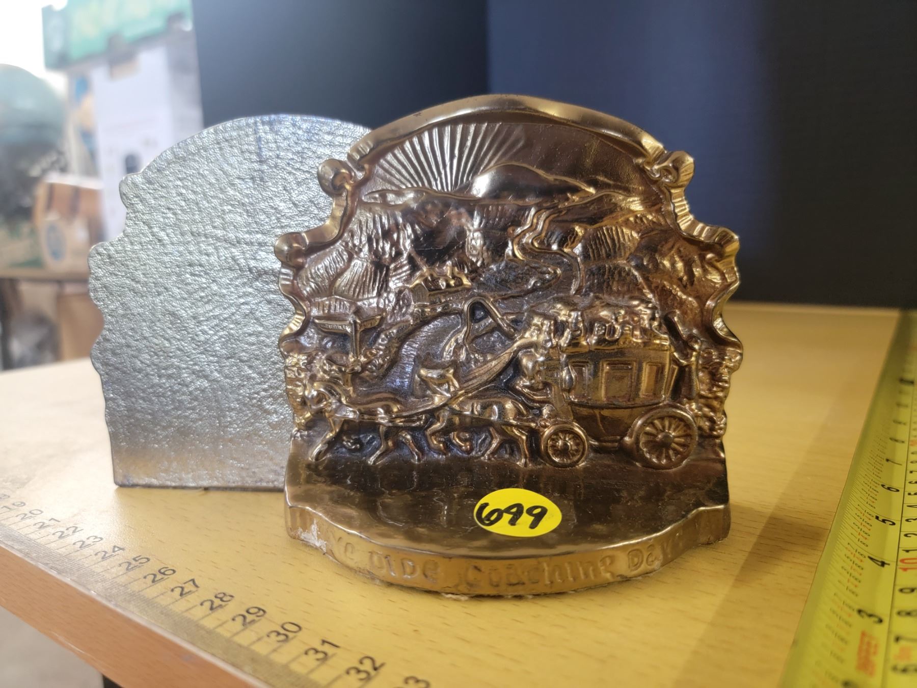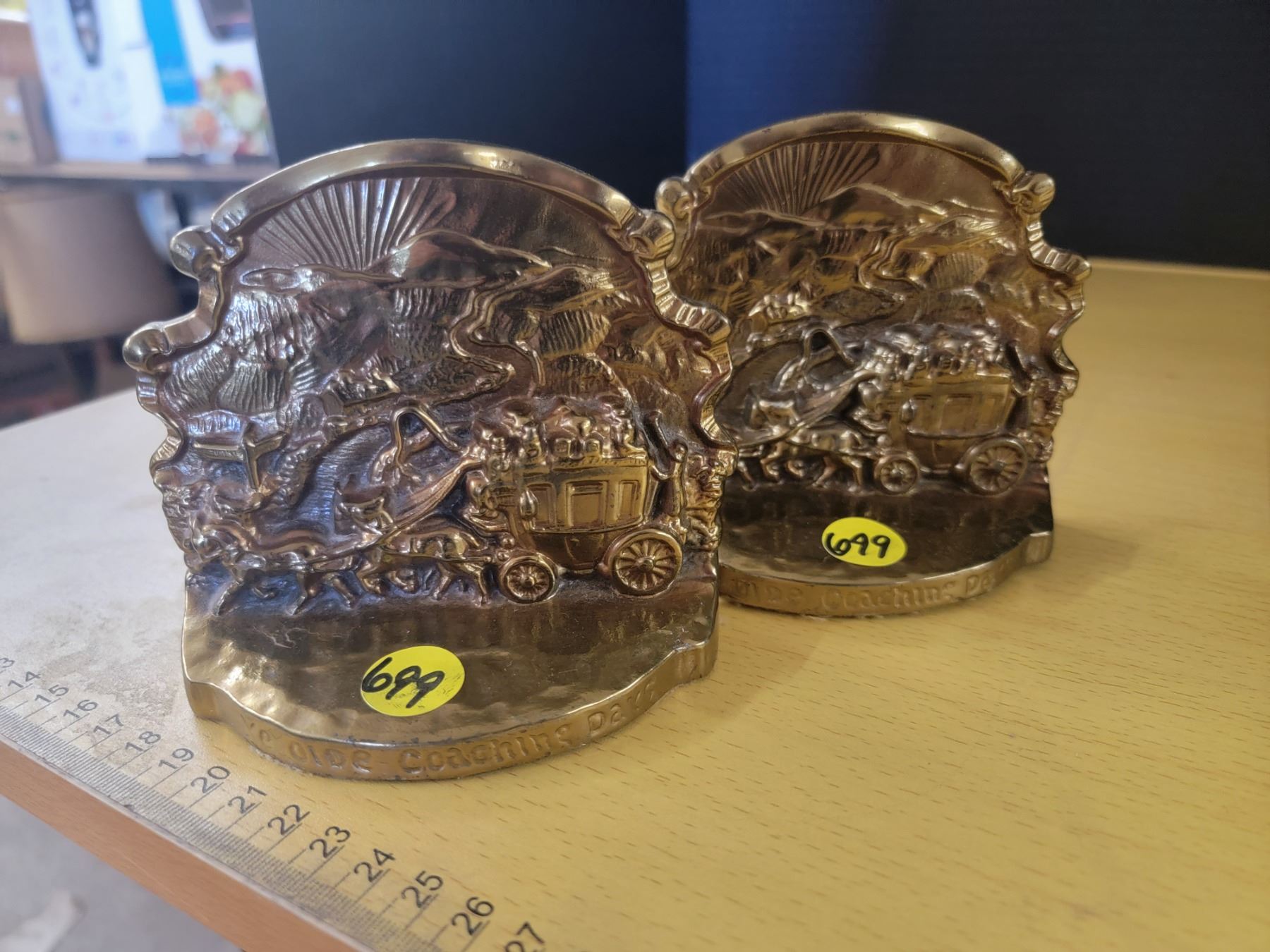 pair of brass bookends "Ye Olde Coaching Days" 4.5"x4"