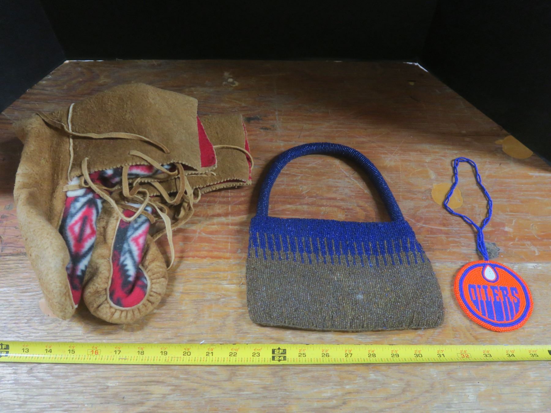 pair of mukluks, beaded purse and beaded Oilers decoration