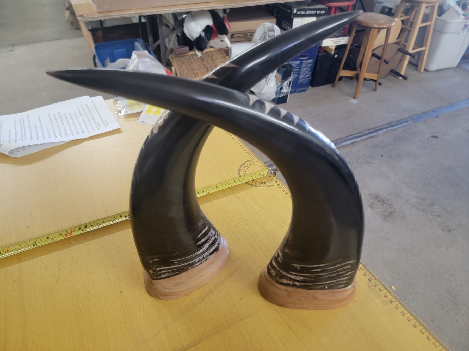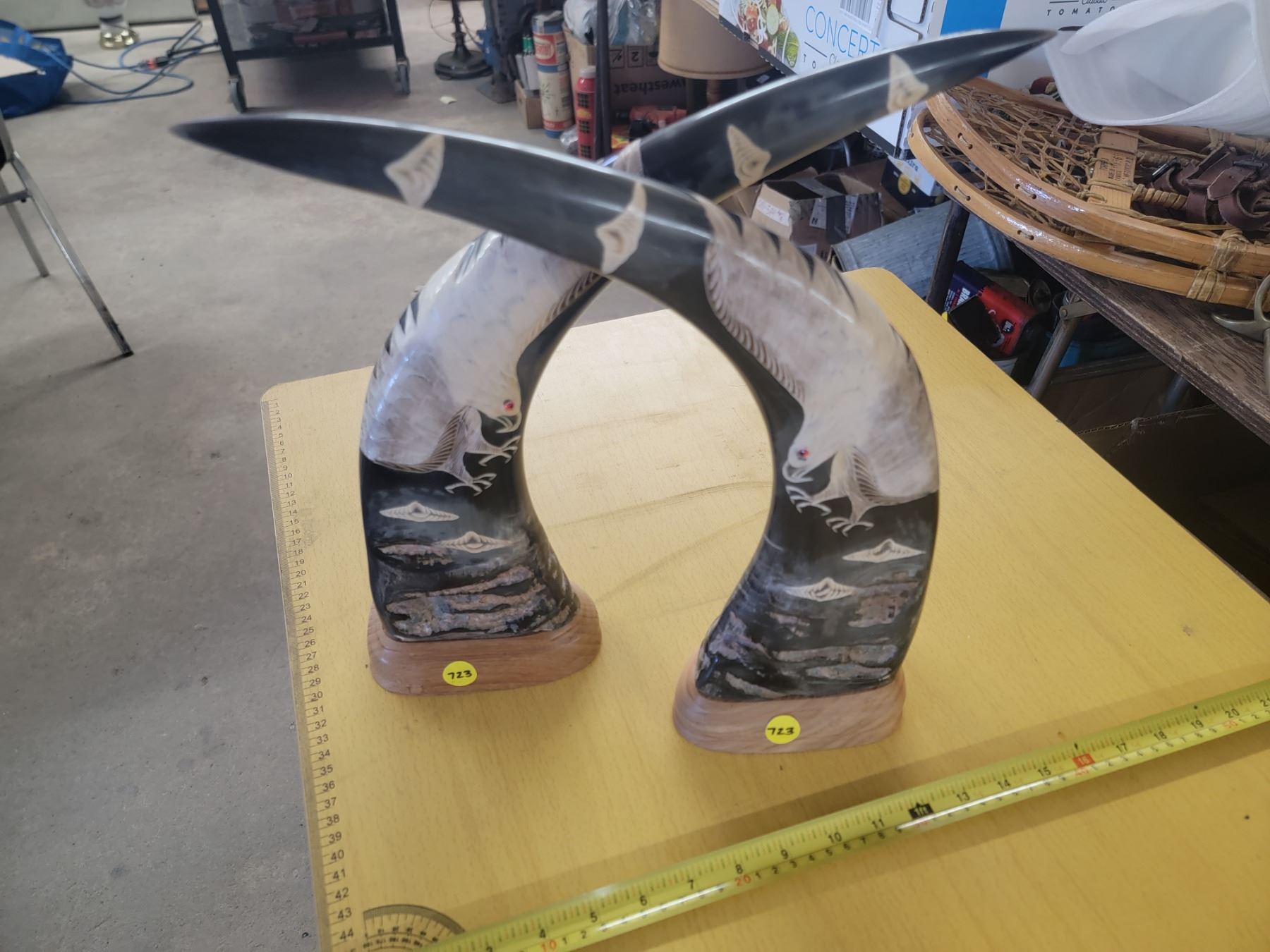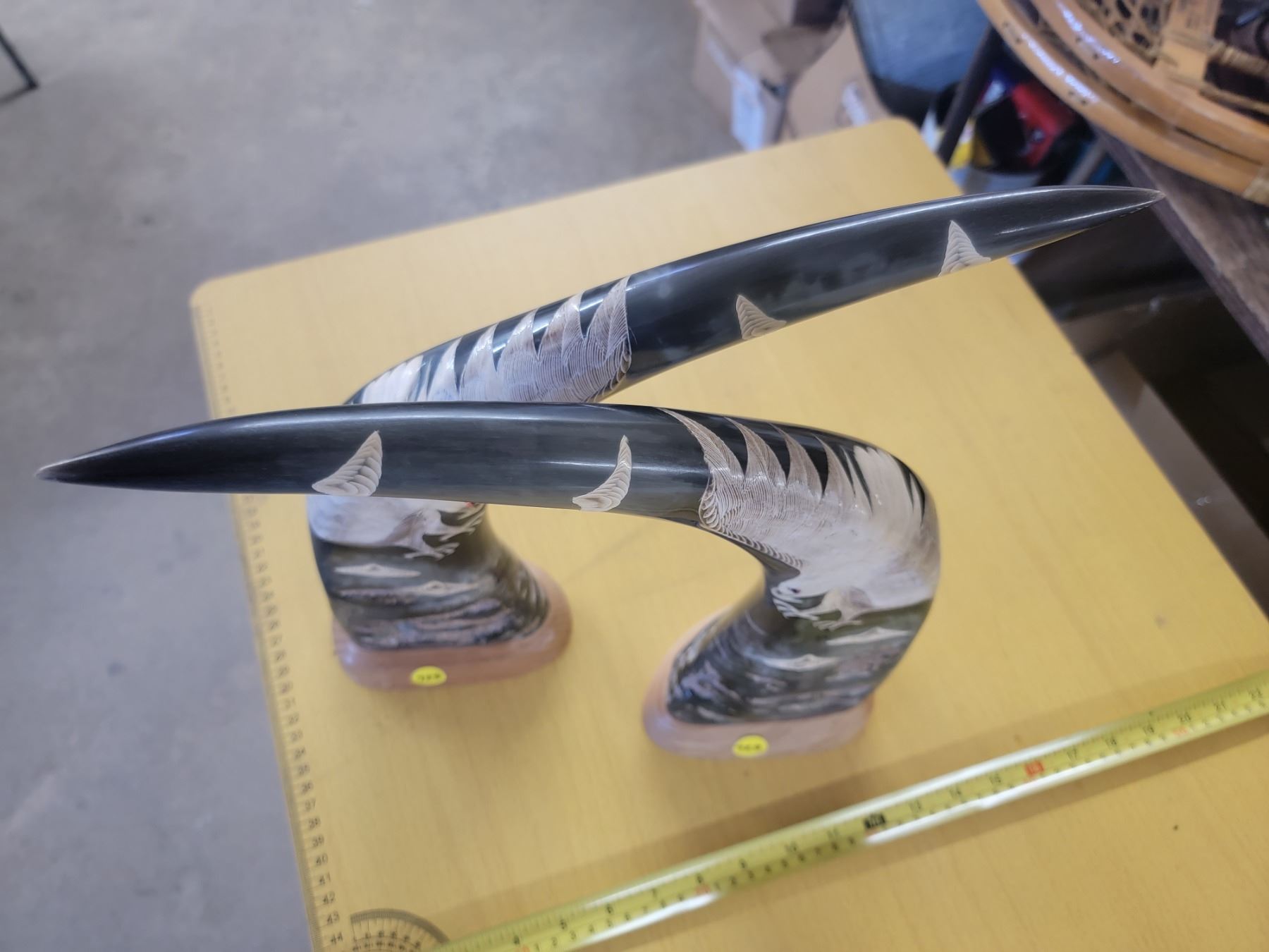 pair of water buffalo horns w/ very detailed hand carved eagles on wood bases 20"