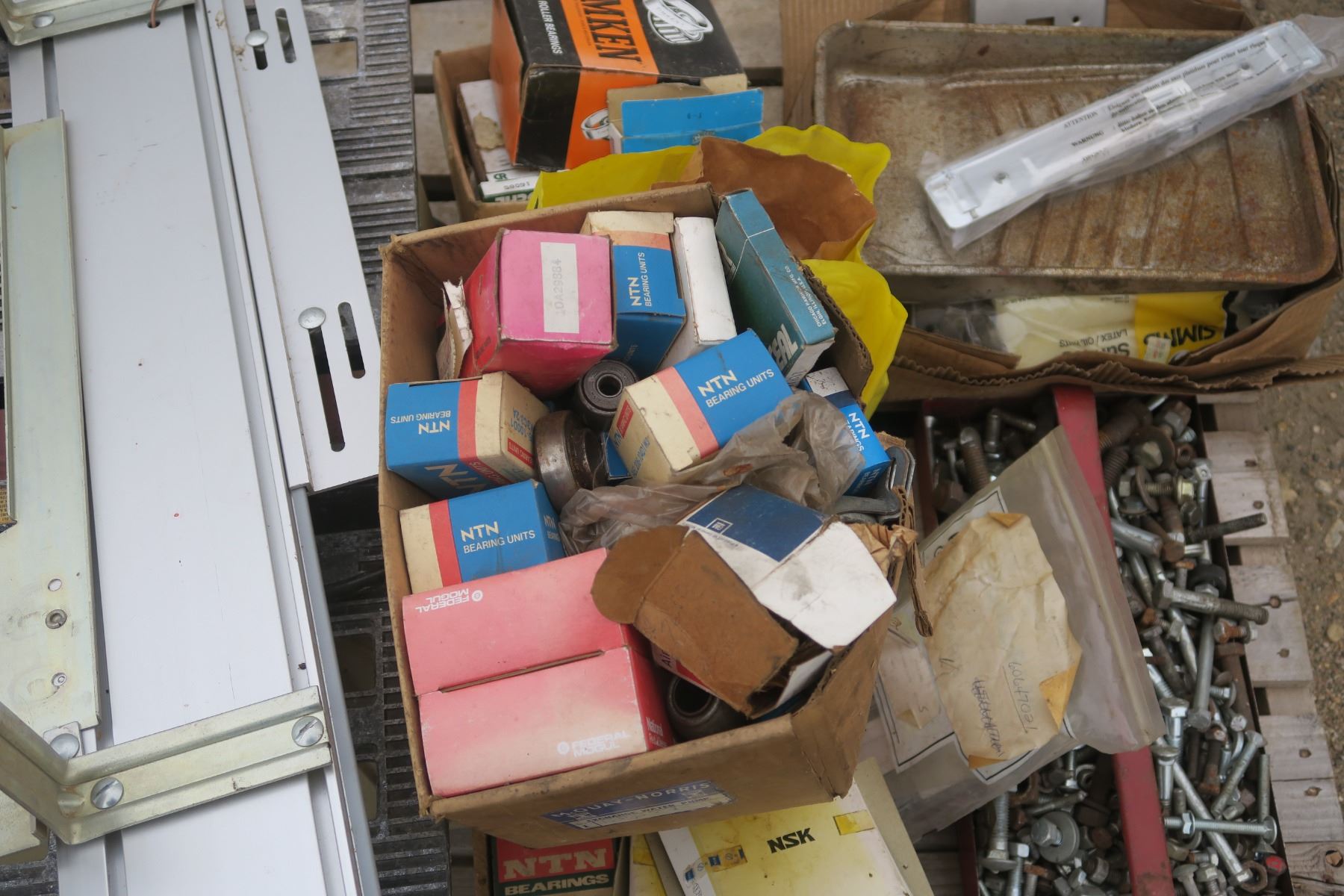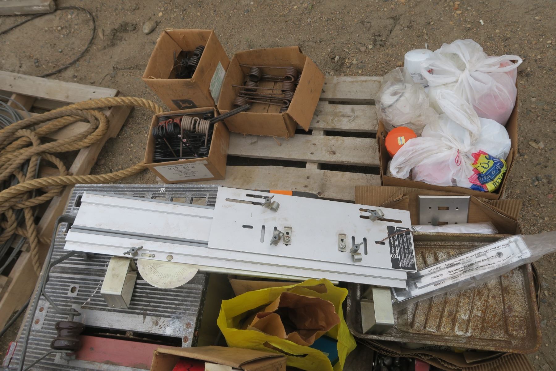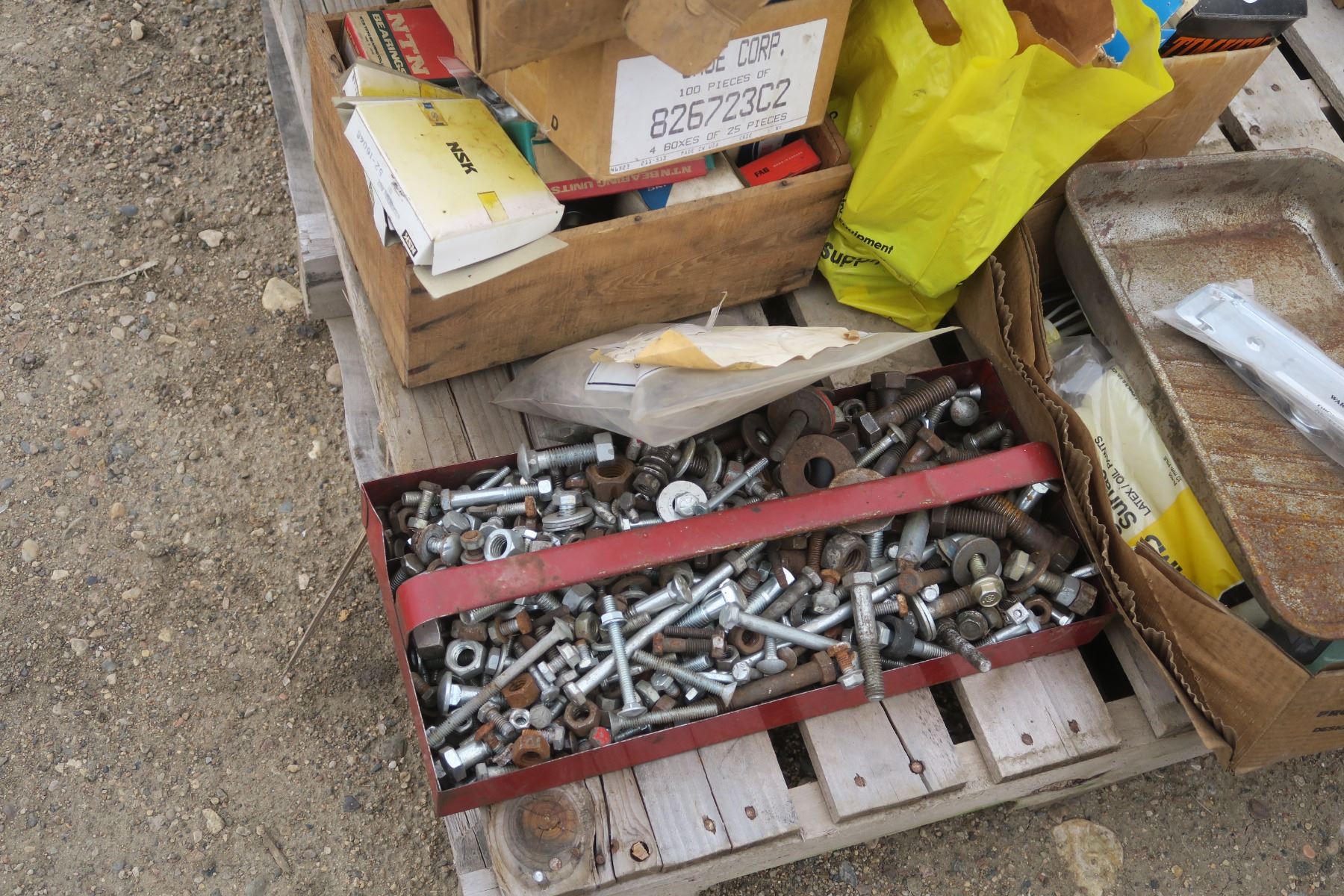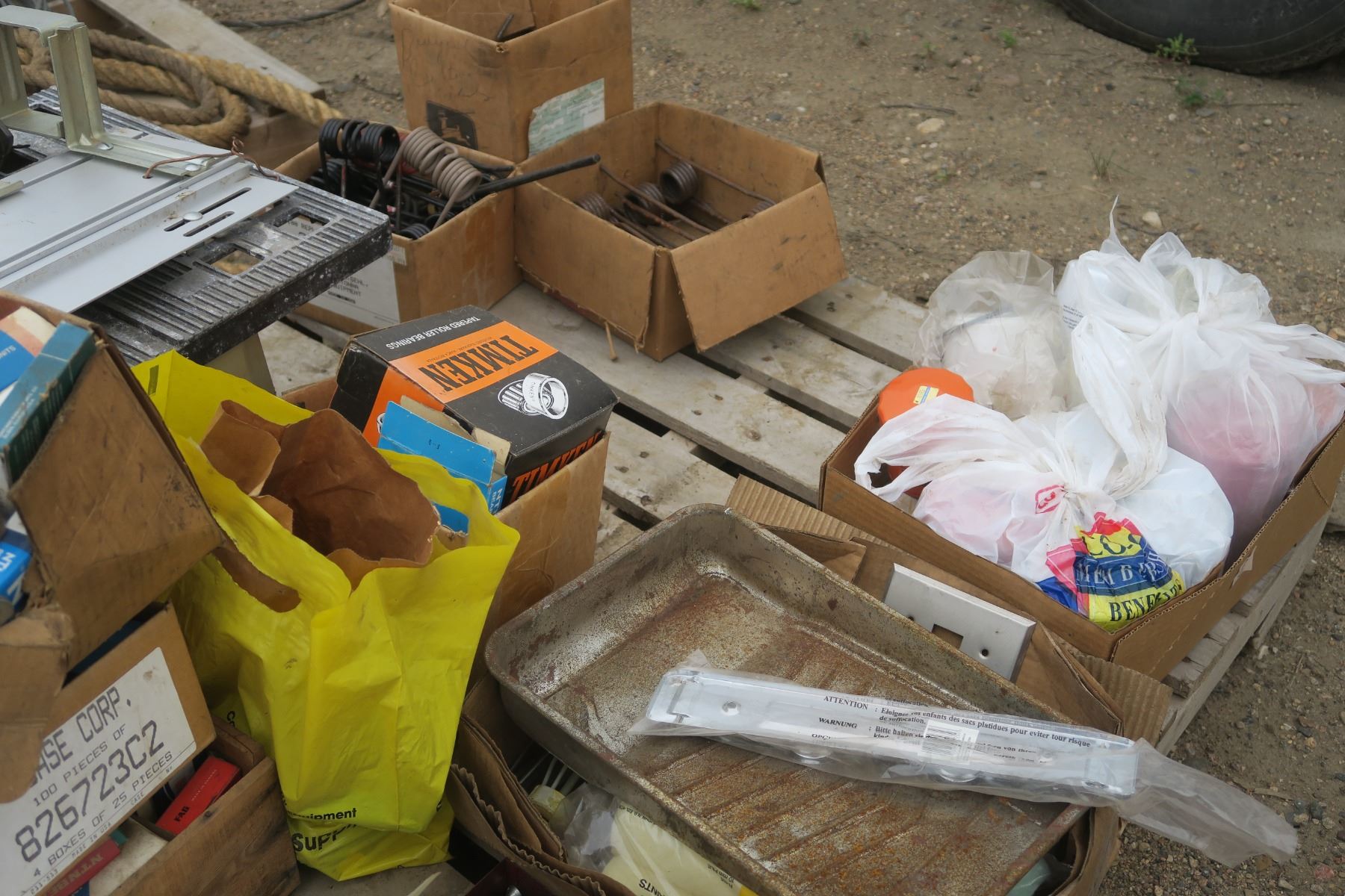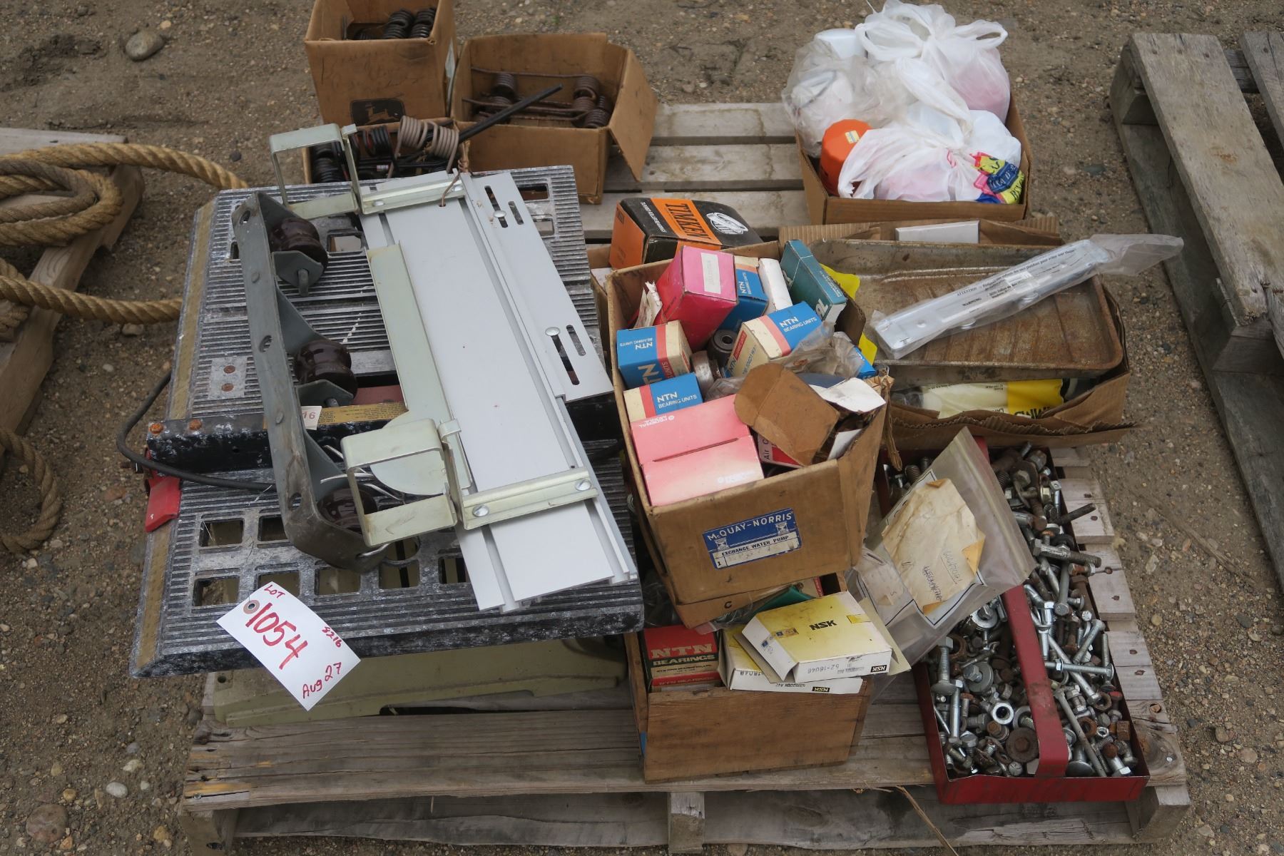 pallet of misc, bearings, tools , ag parts,filters, table saw.
