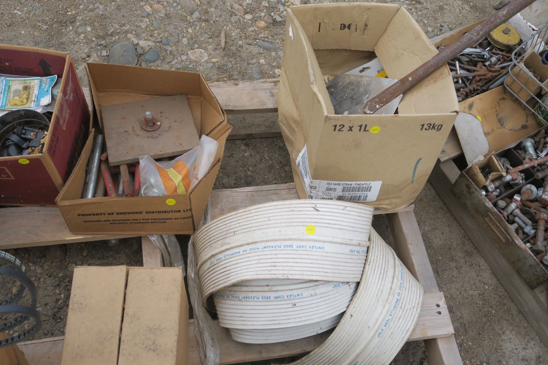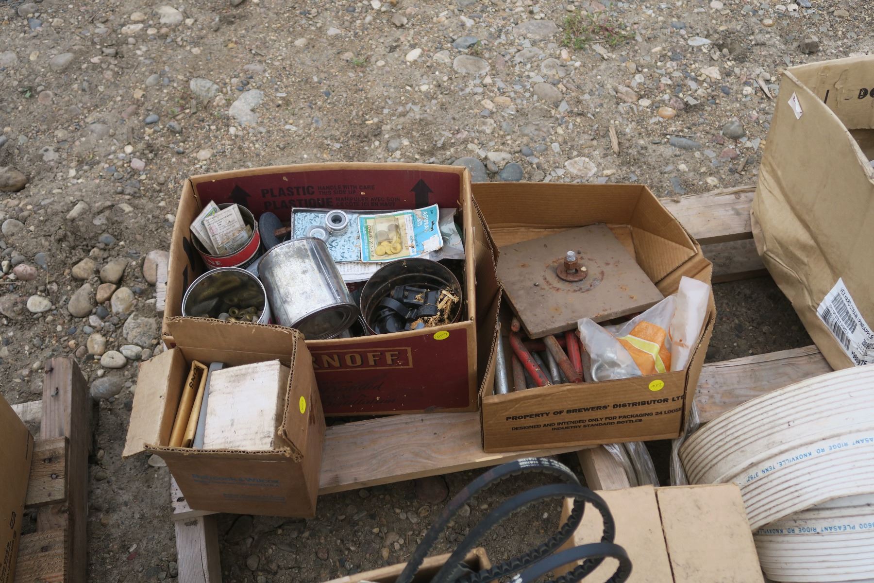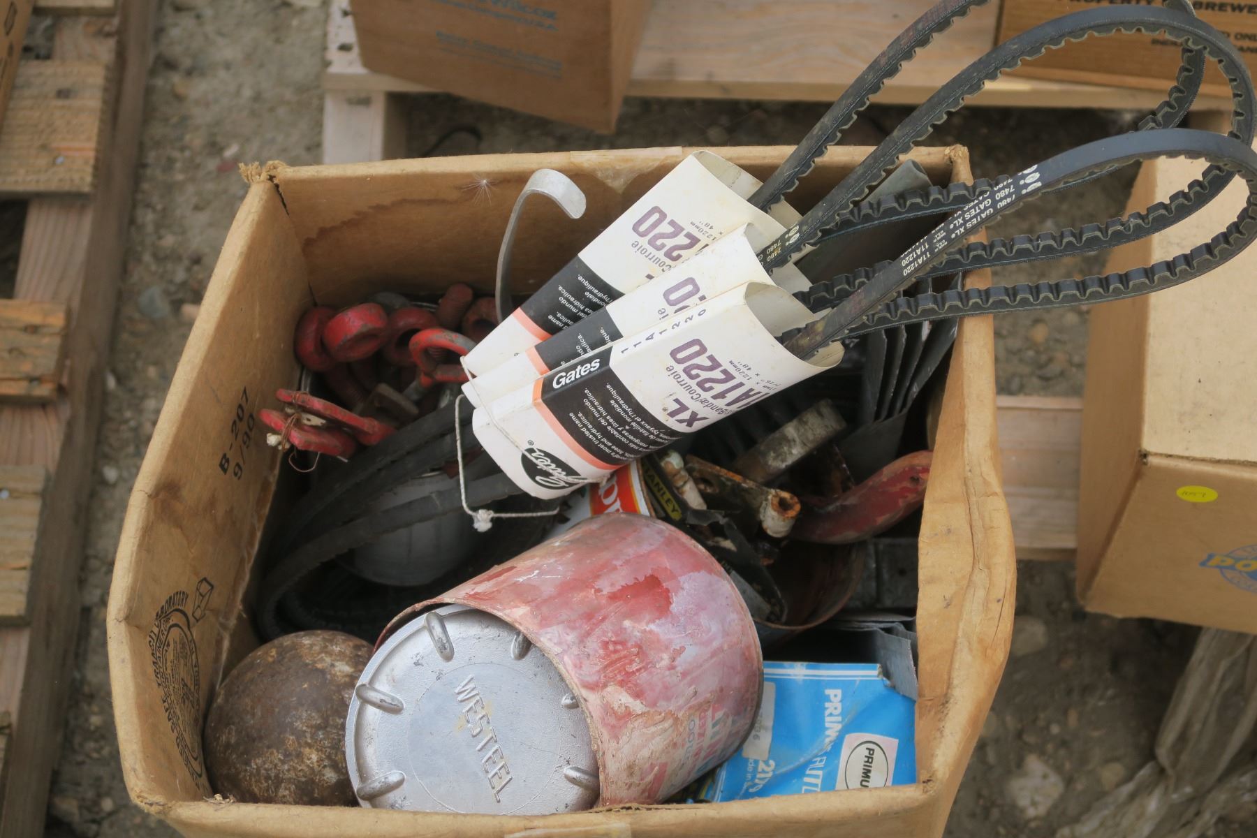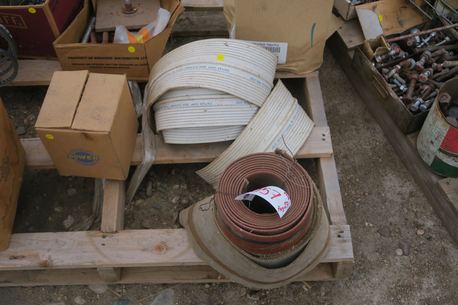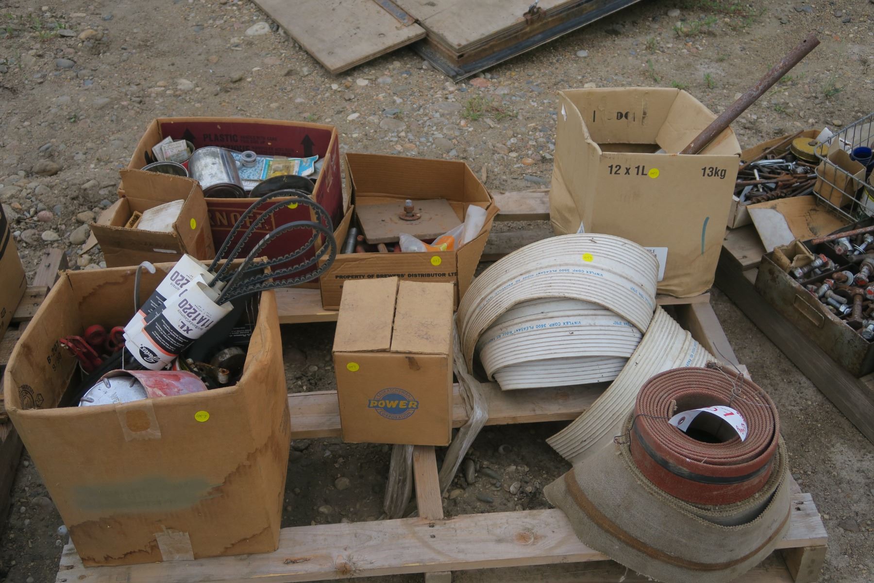 pallet of misc, belts, power meter, fastners, bolts.