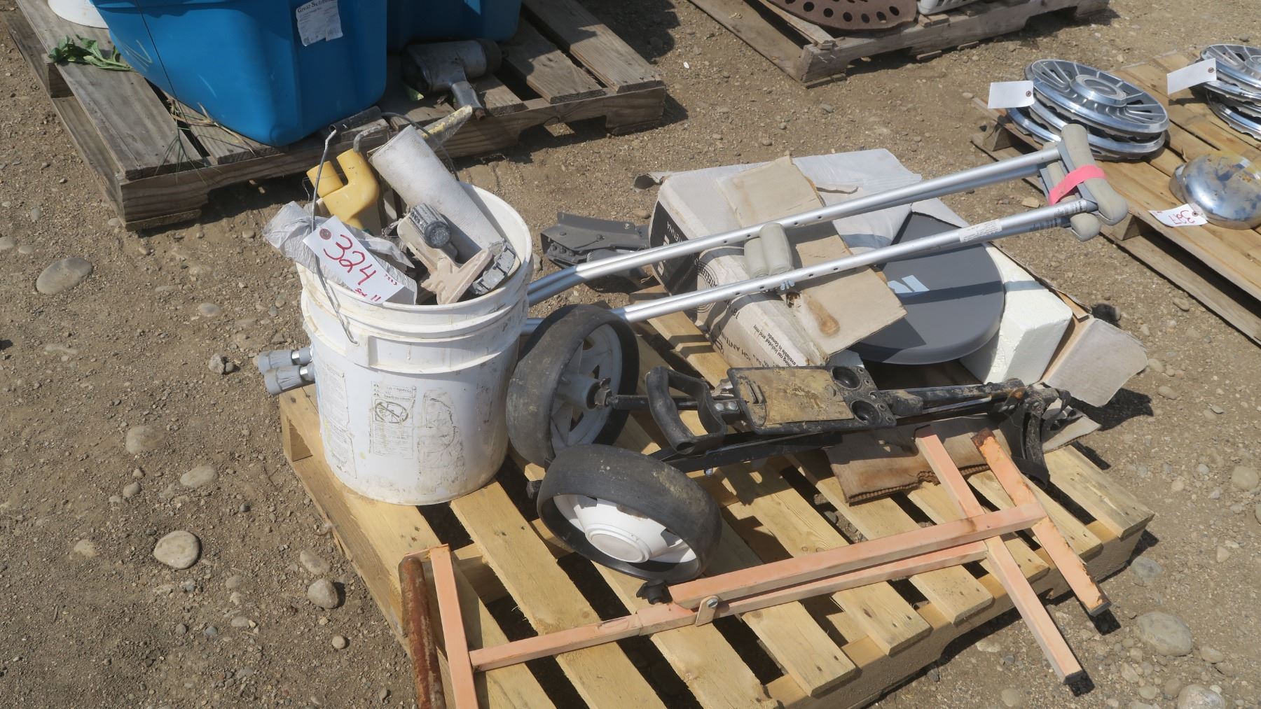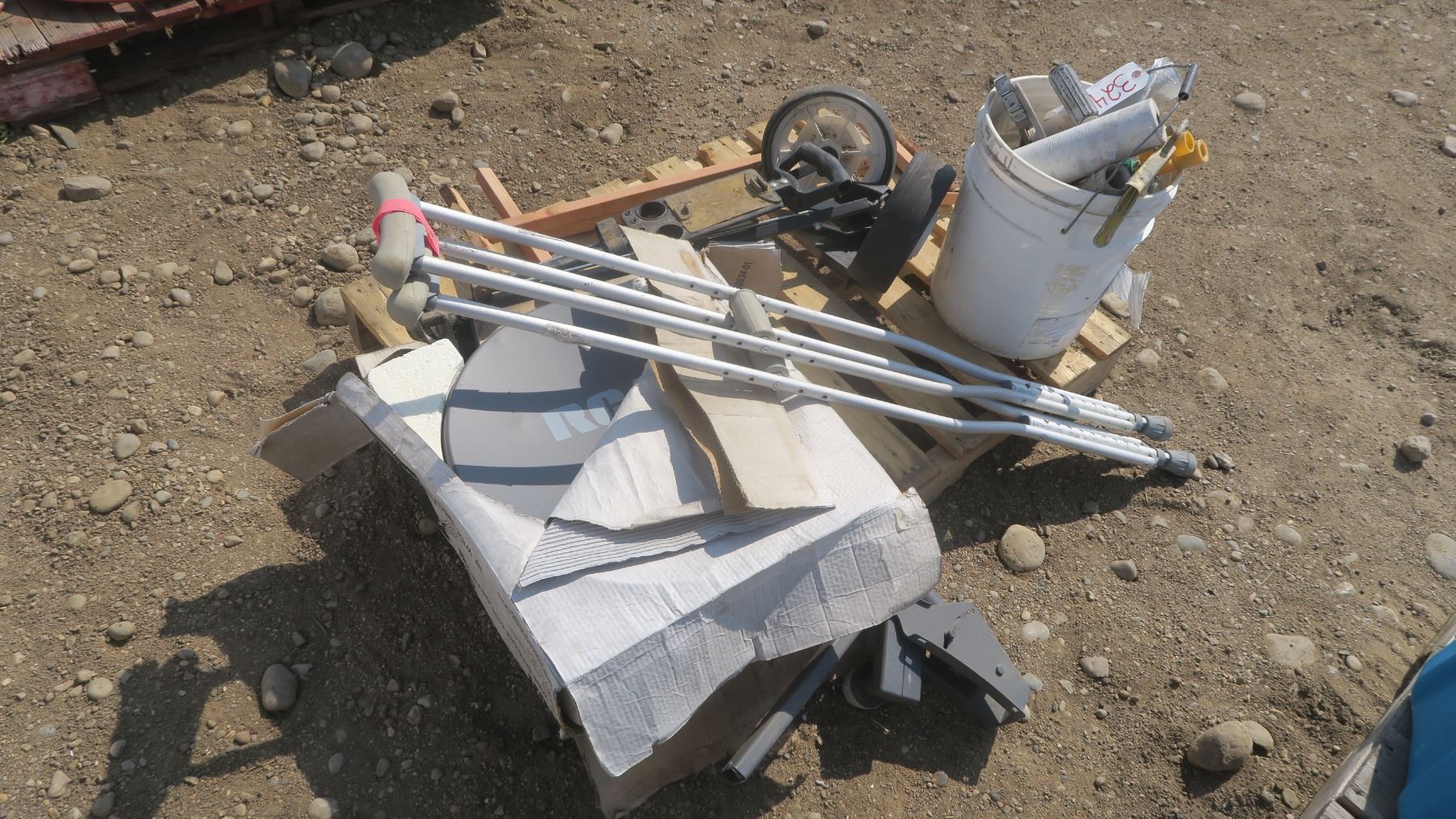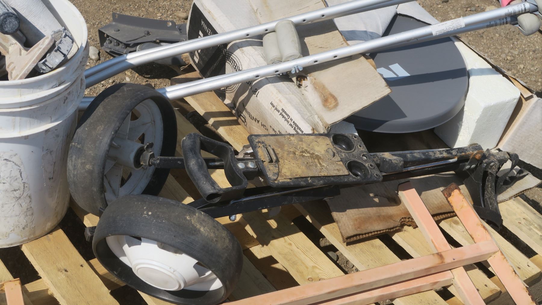 pallet of misc. items, golf caddy, roller stand, tools, RCV satellite dish