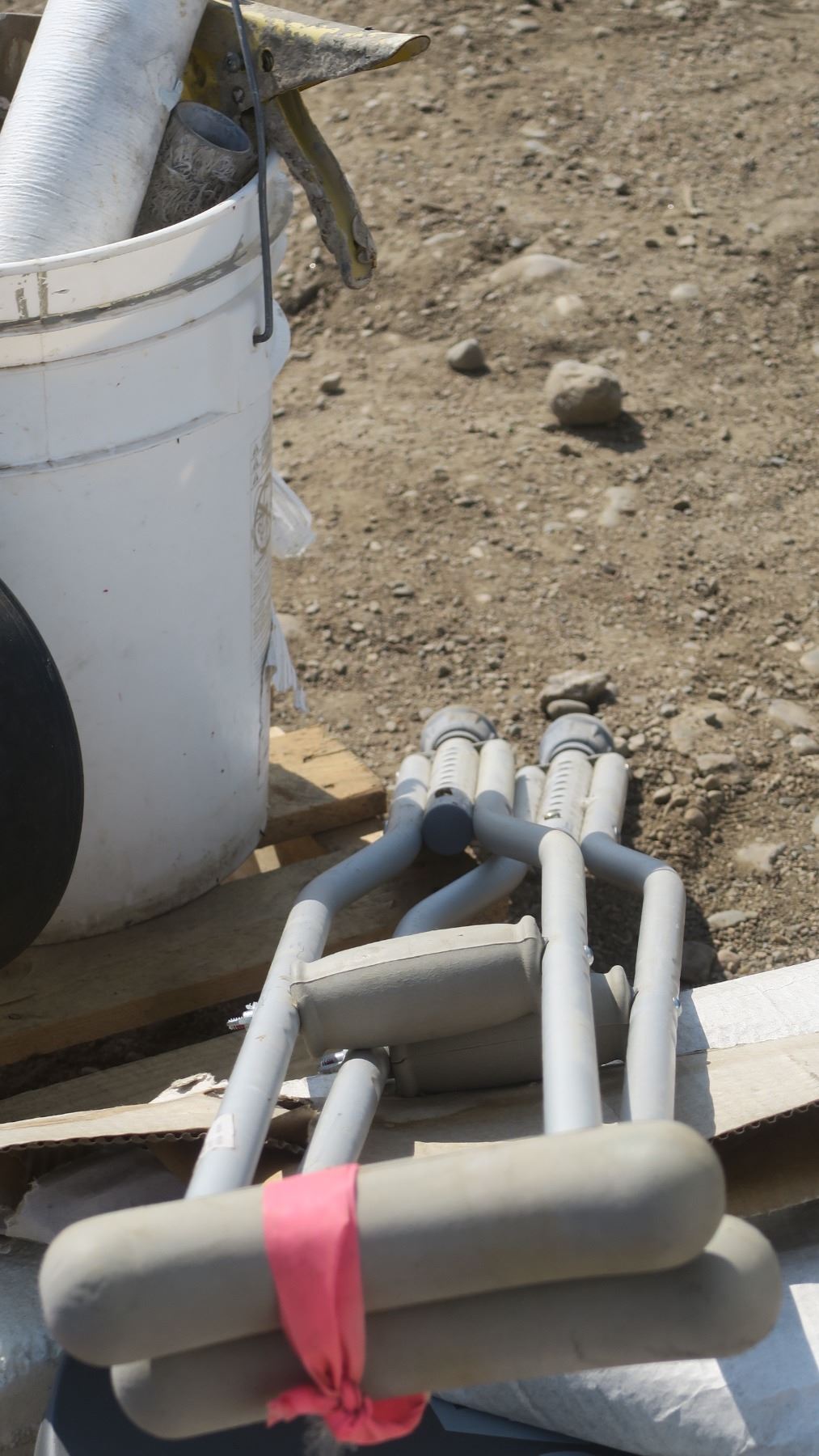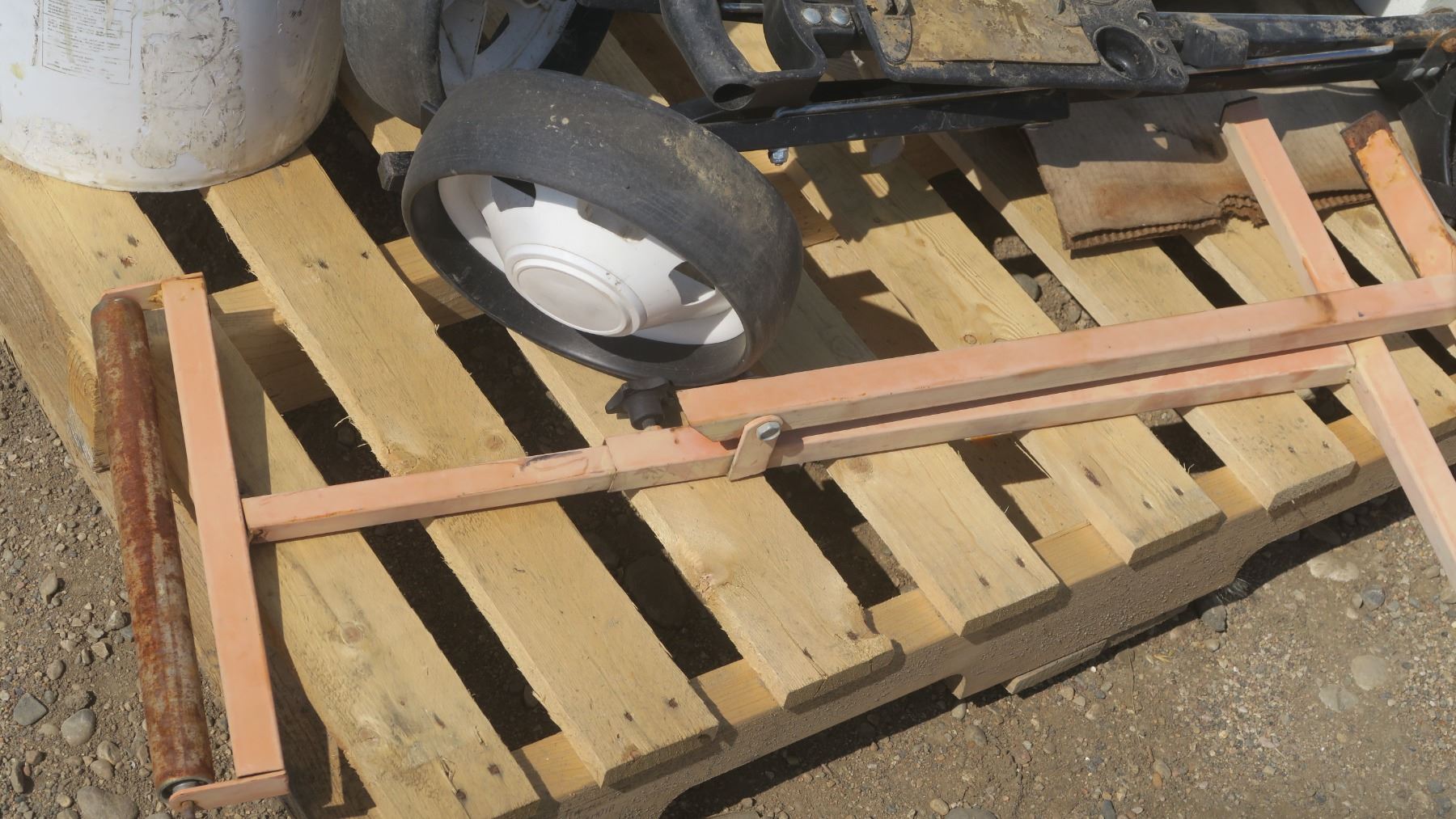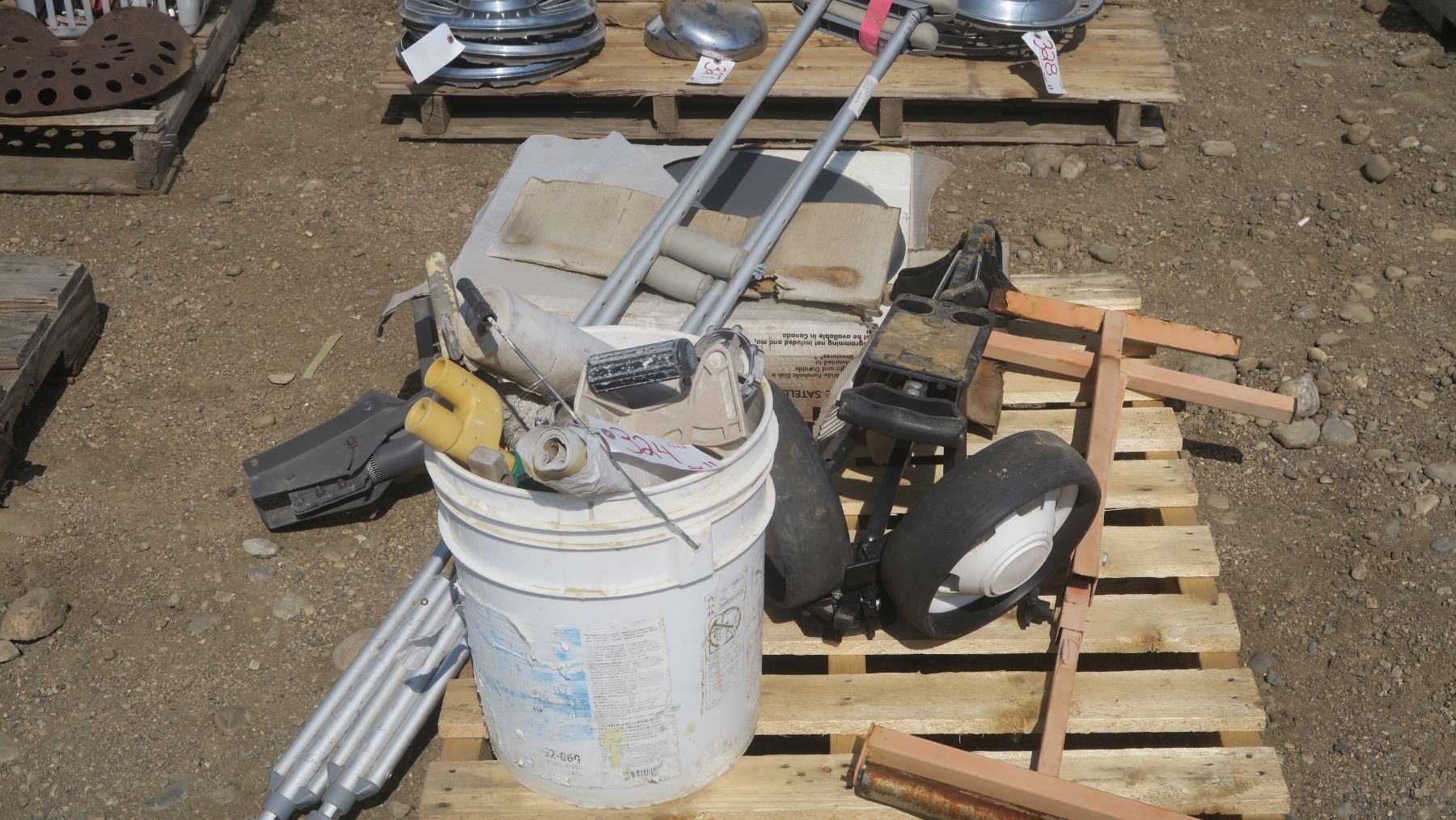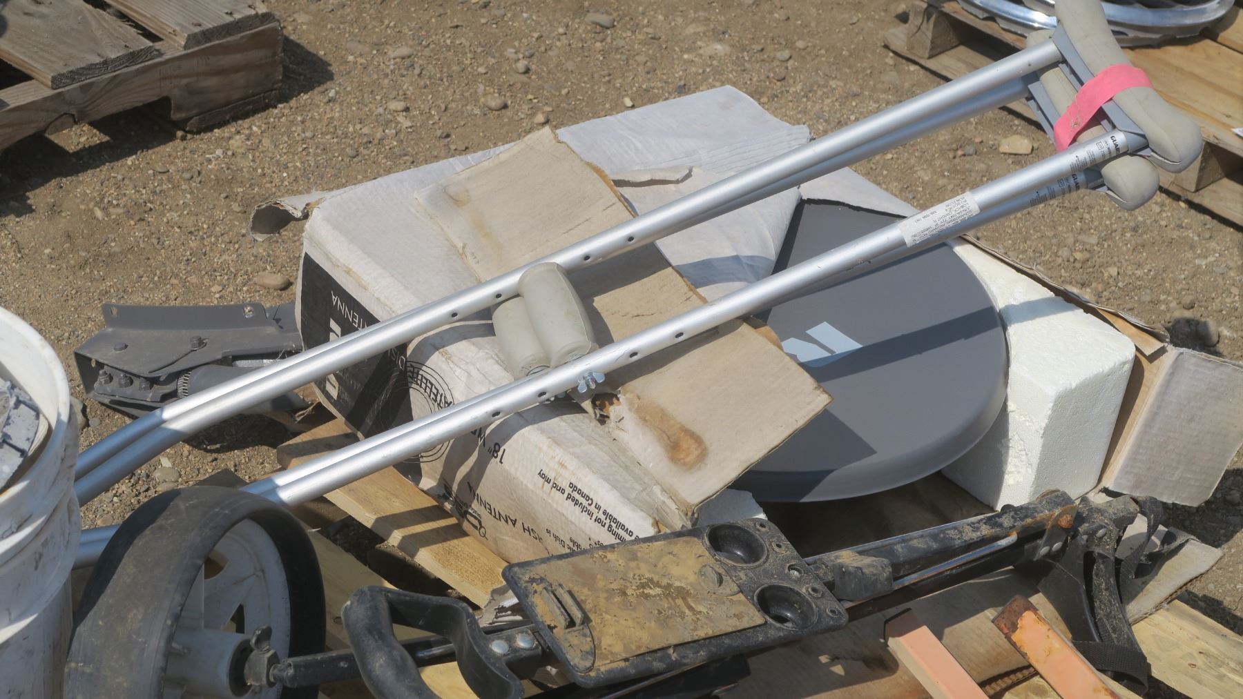 pallet of misc. items, golf caddy, roller stand, tools, RCV satellite dish
