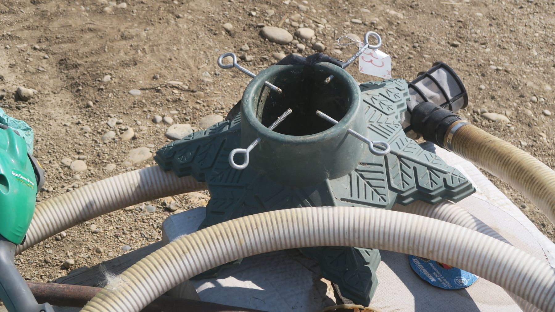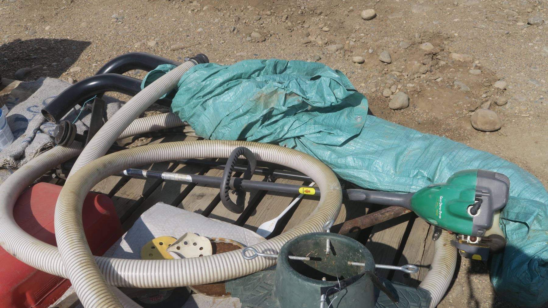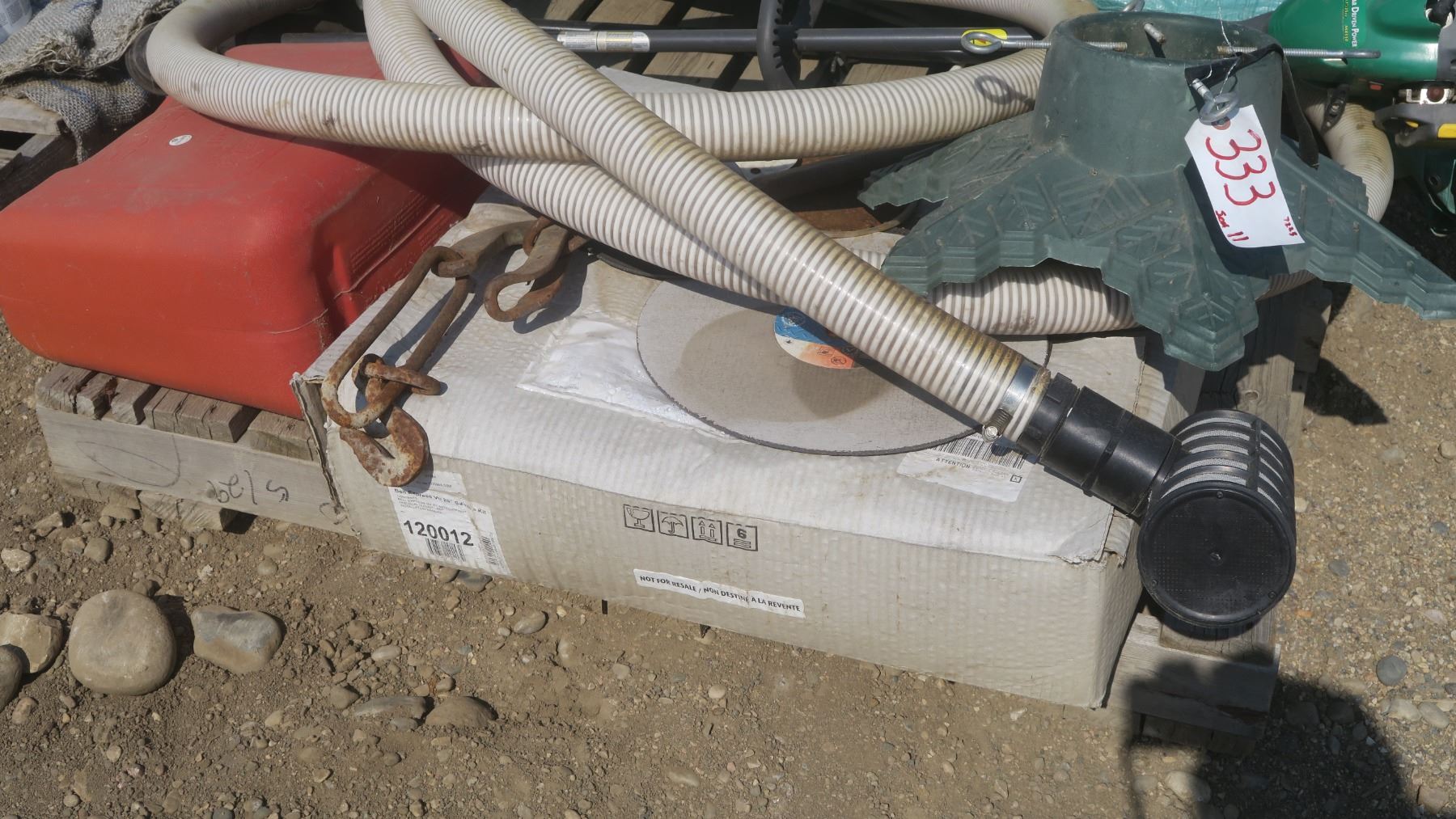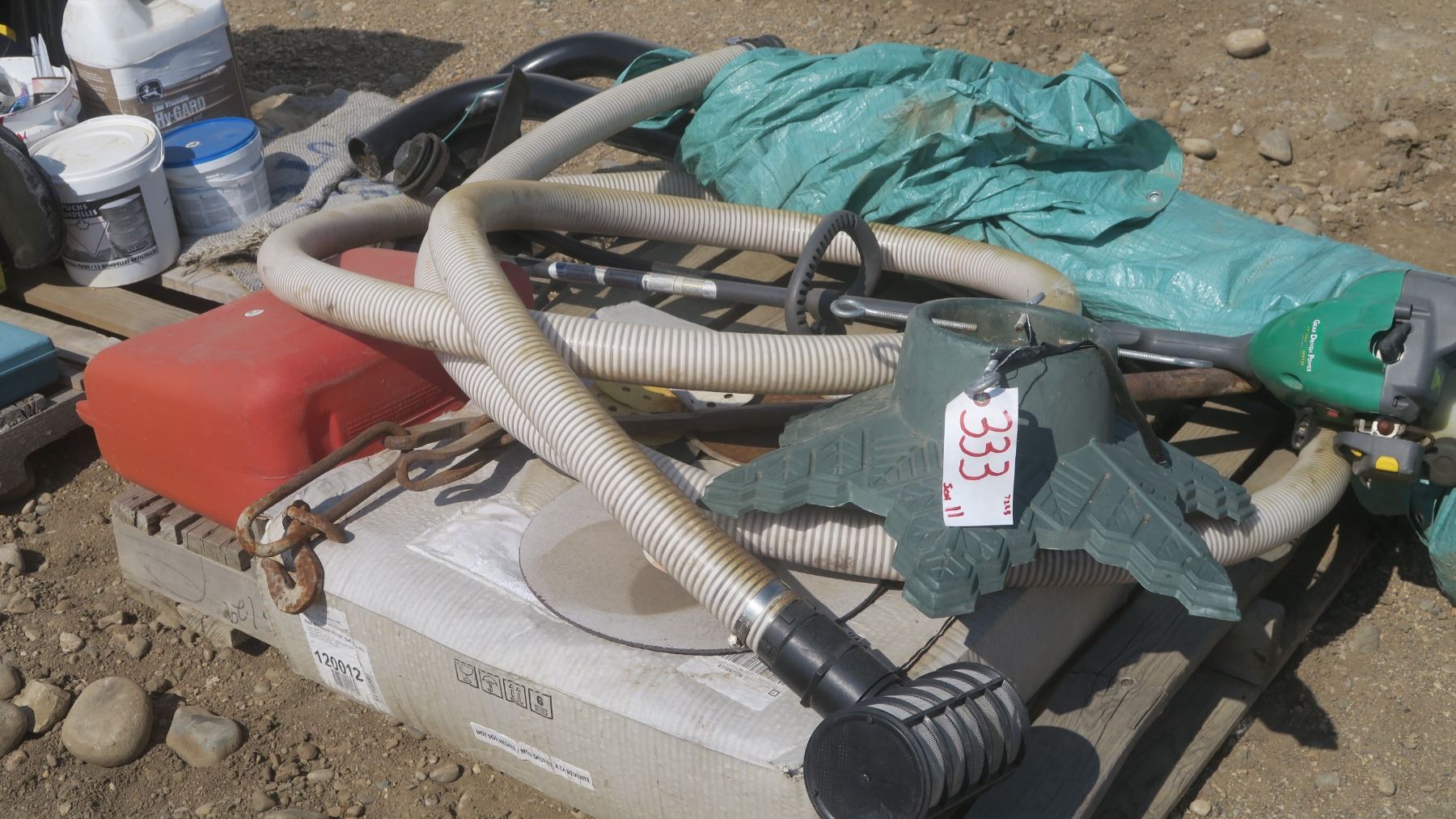 pallet of misc. items, satellite dish, gas can, black truck step rails, weed eater green.