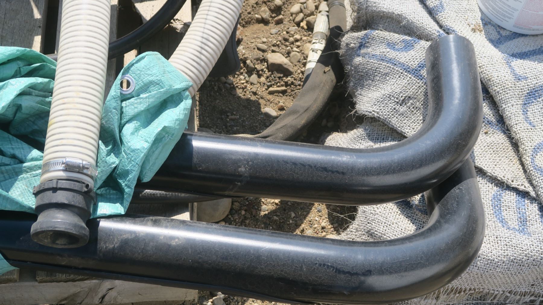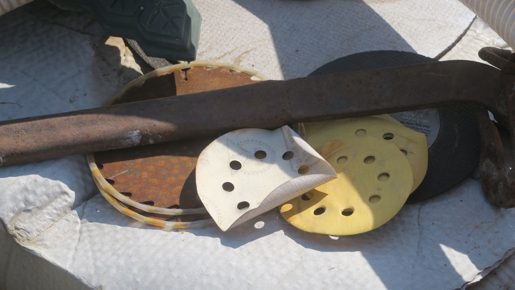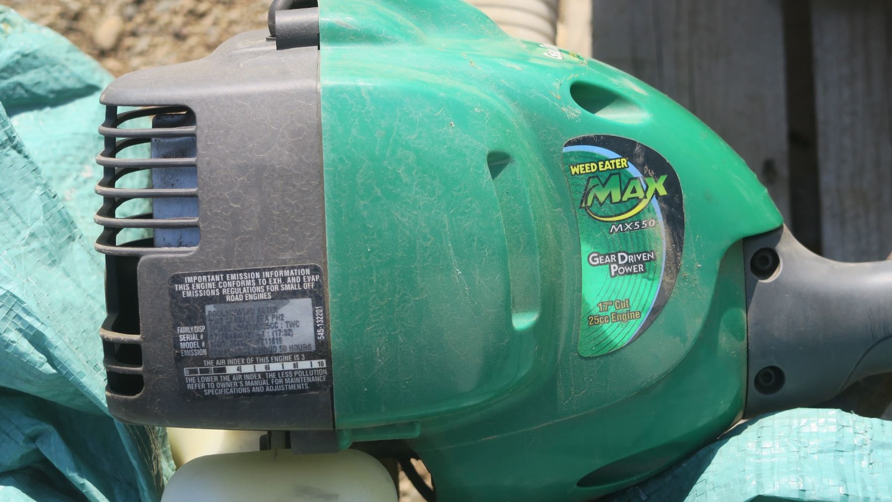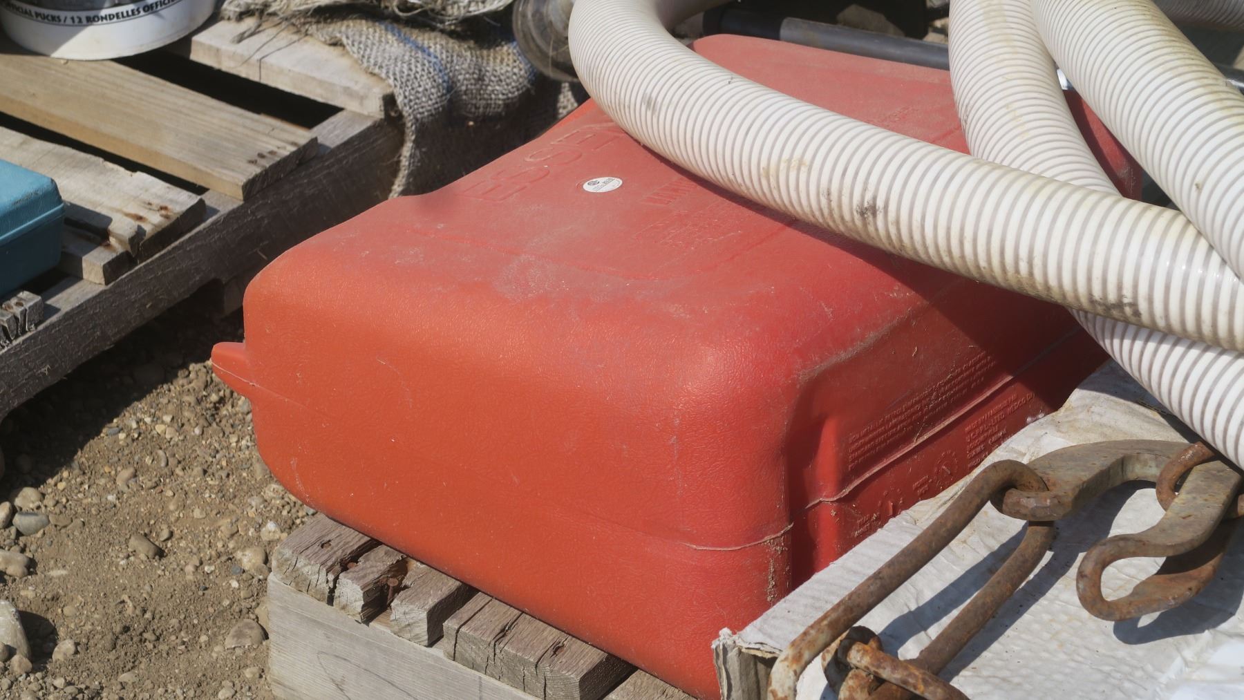 pallet of misc. items, satellite dish, gas can, black truck step rails, weed eater green.