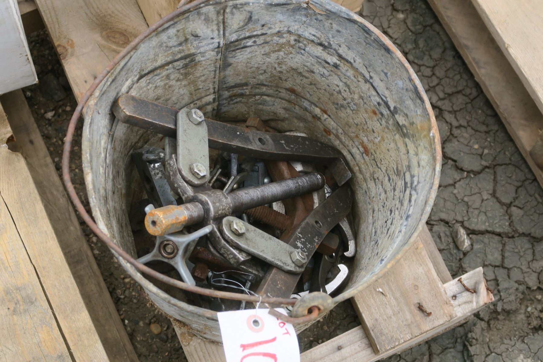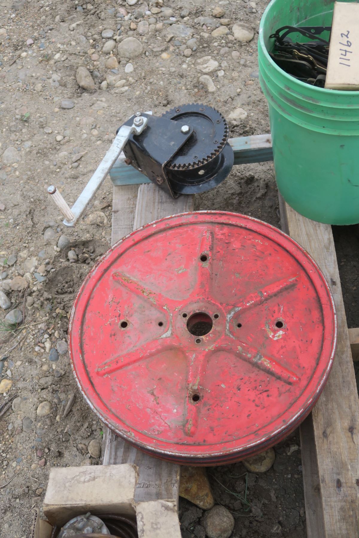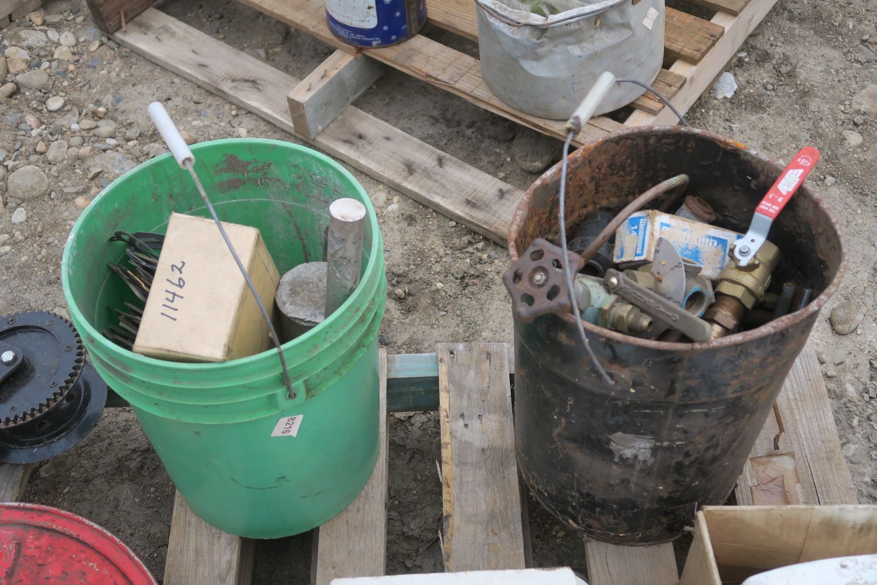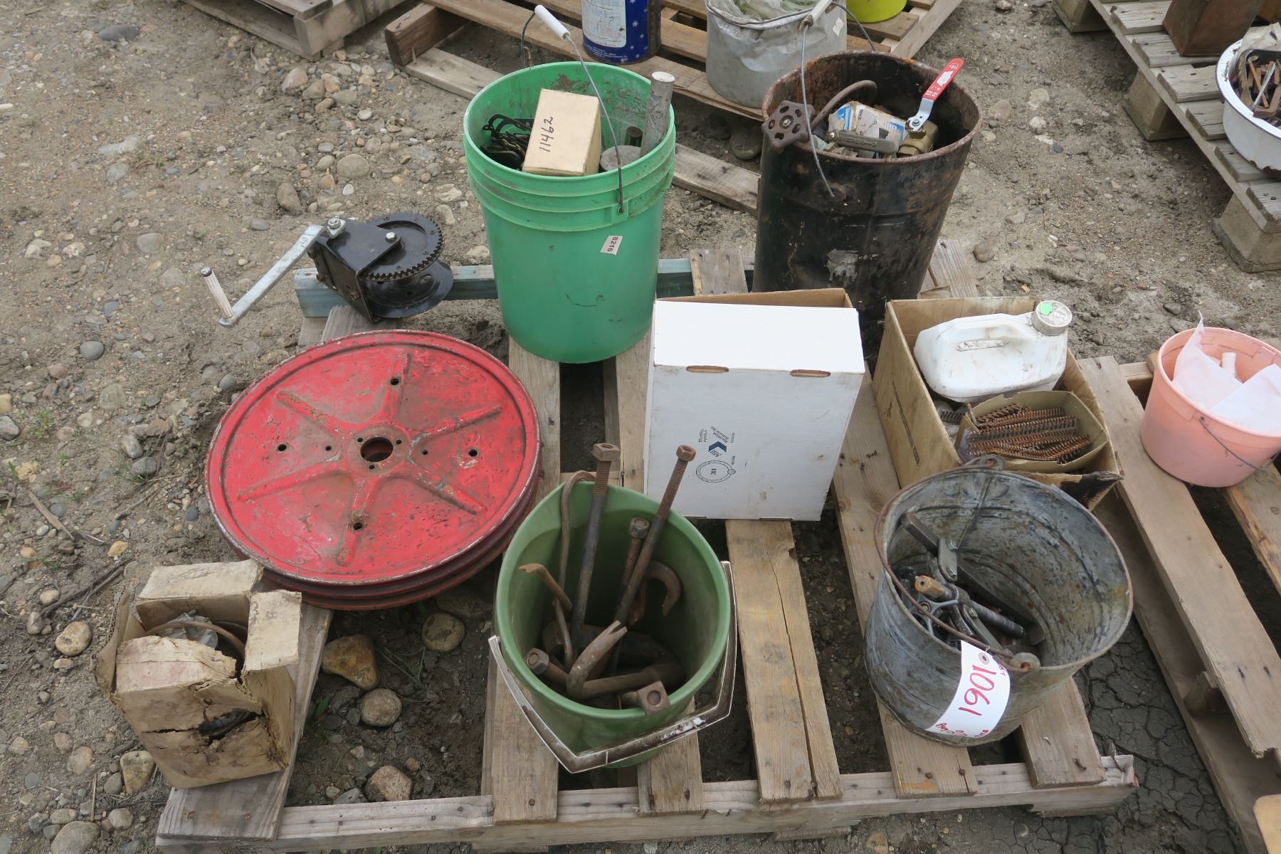 pallet of misc, tools, gear pullers, ball valves, pully wheels large, gaskets.