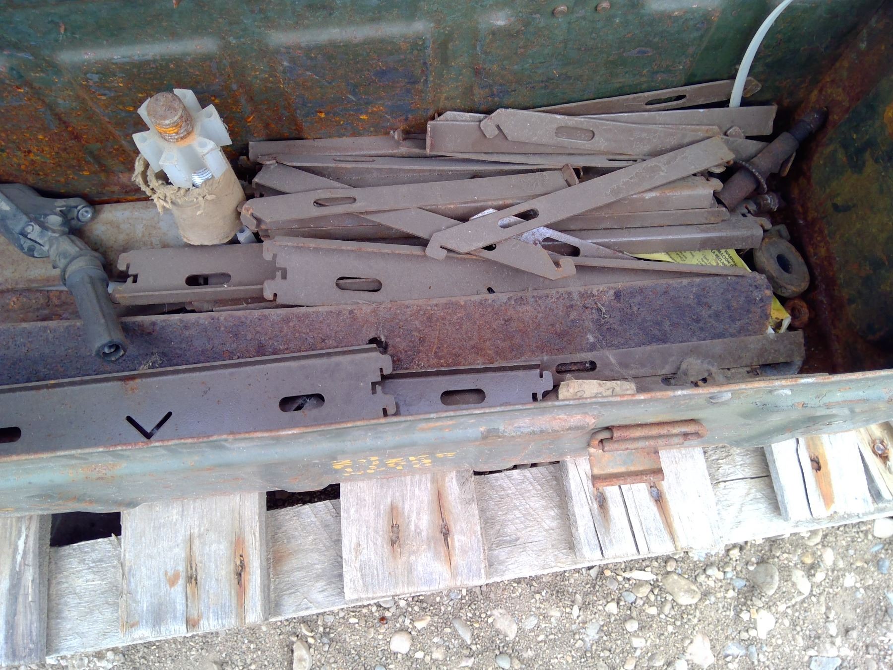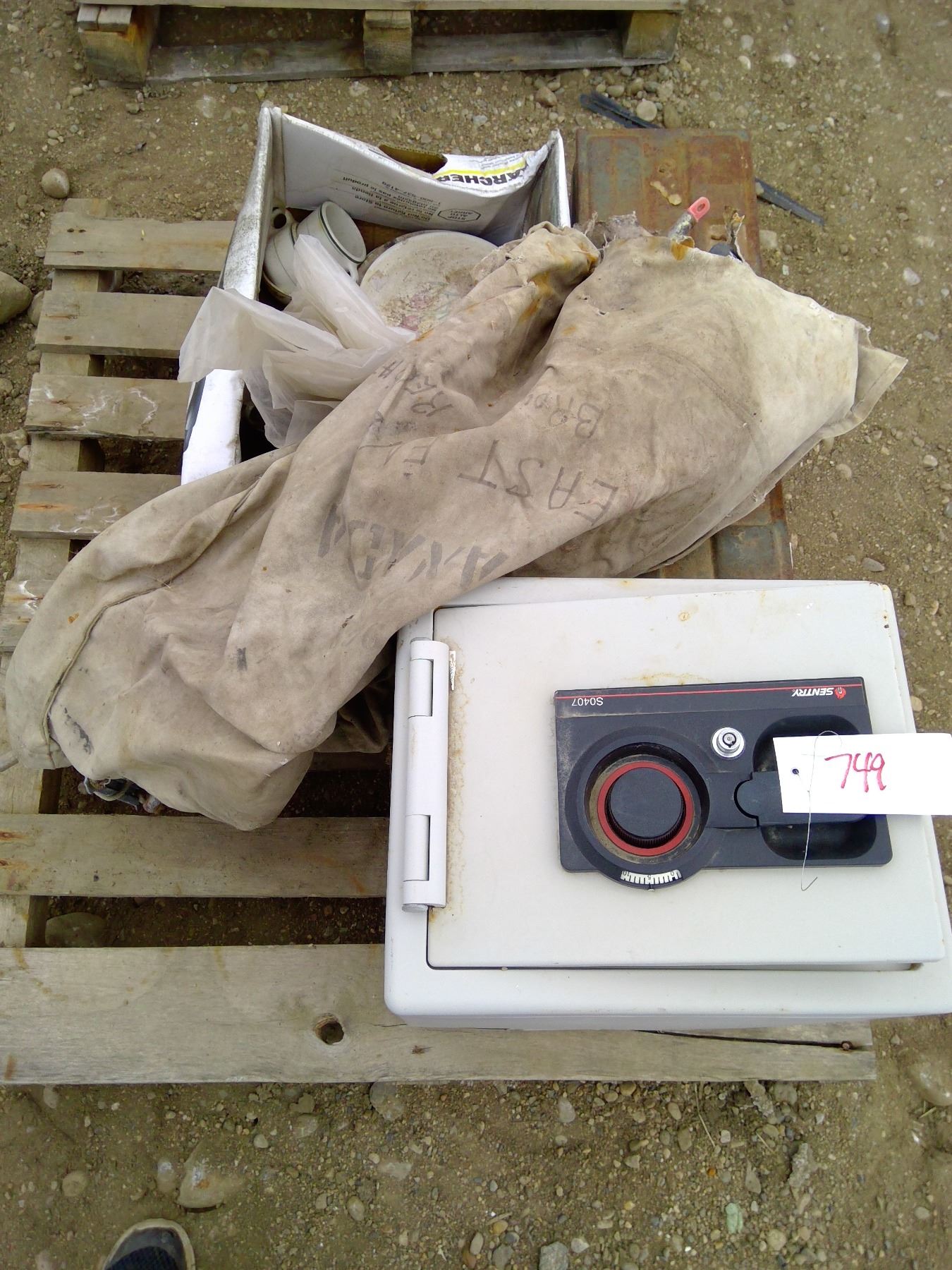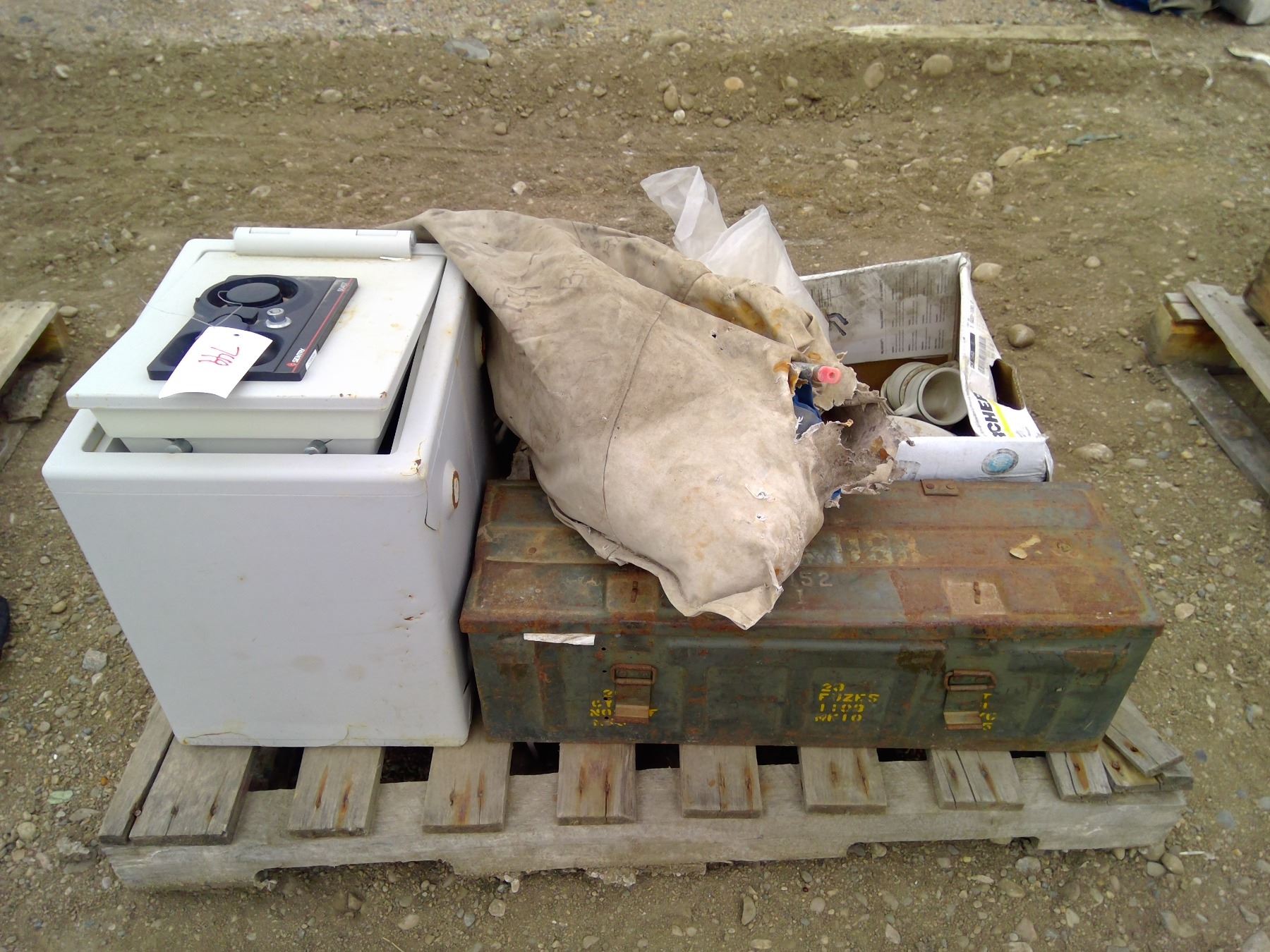 pallet of safe, toolbox, dishes tent poles