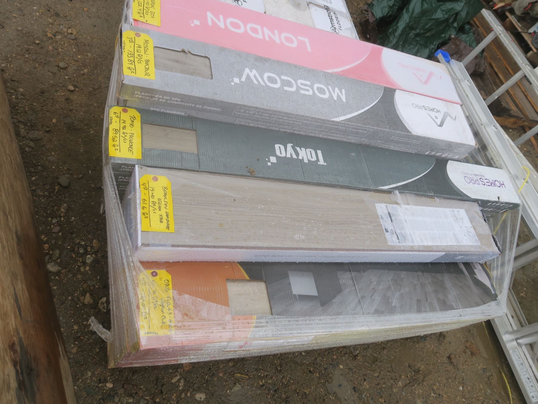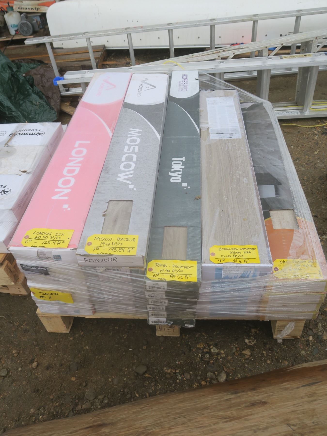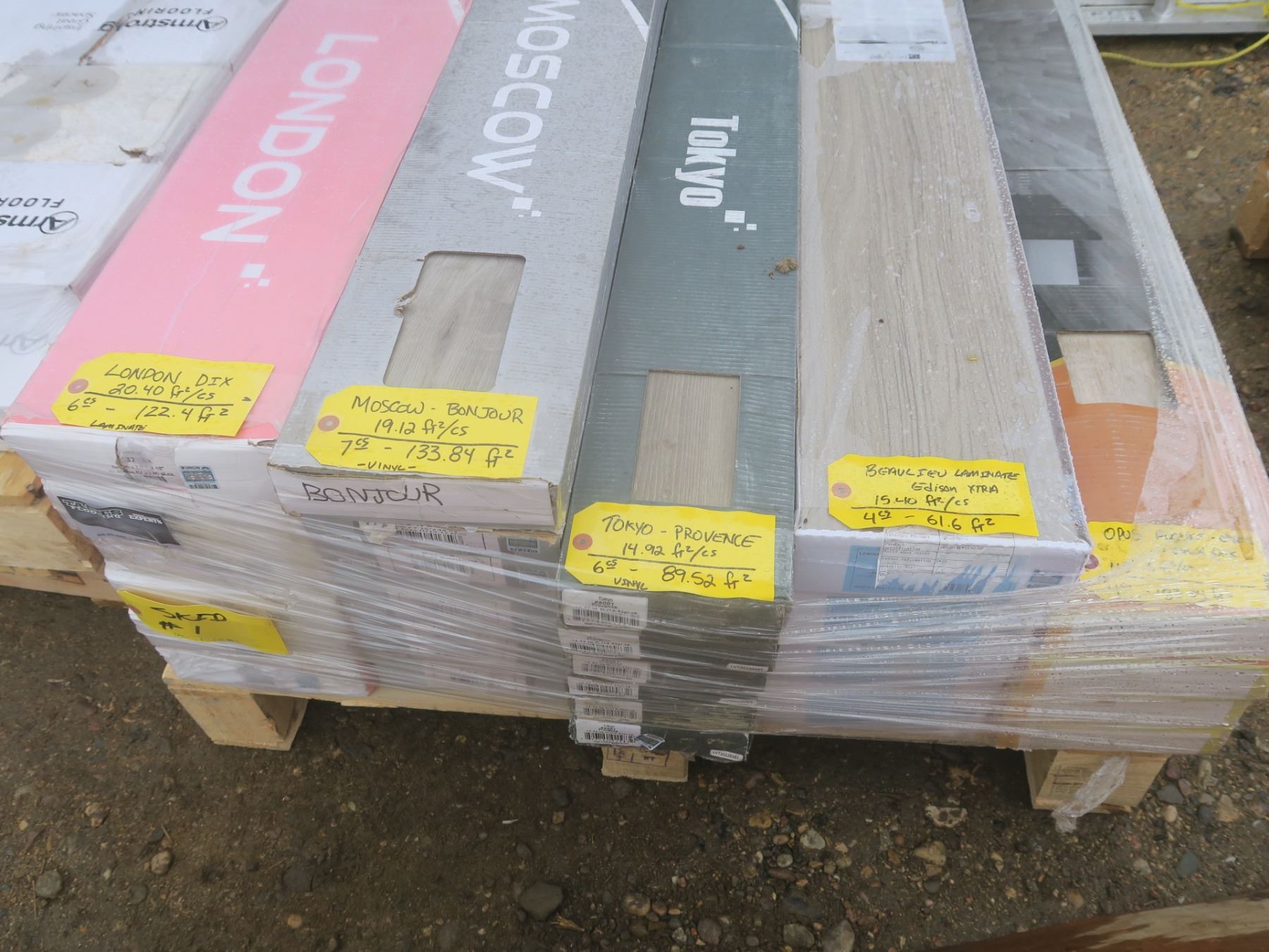 122.4ft² London Dix laminate, 133.84ft² Moscow Bonjour vinyl, 89.52ft² Tokyo Provence vinyl, 61.6ft² Beaulieu laminate, 183.04ft² Opus Leonard Oak vinyl