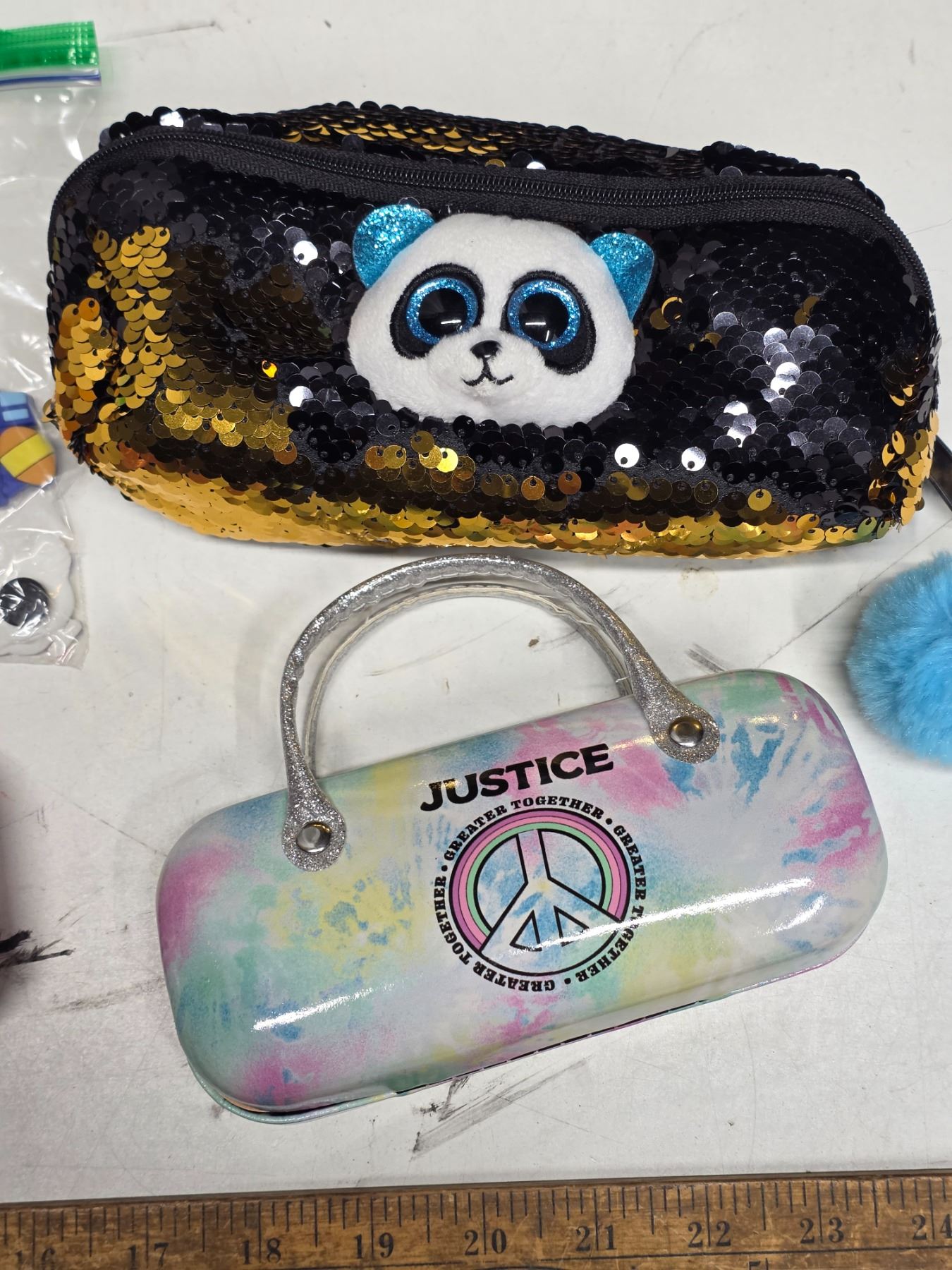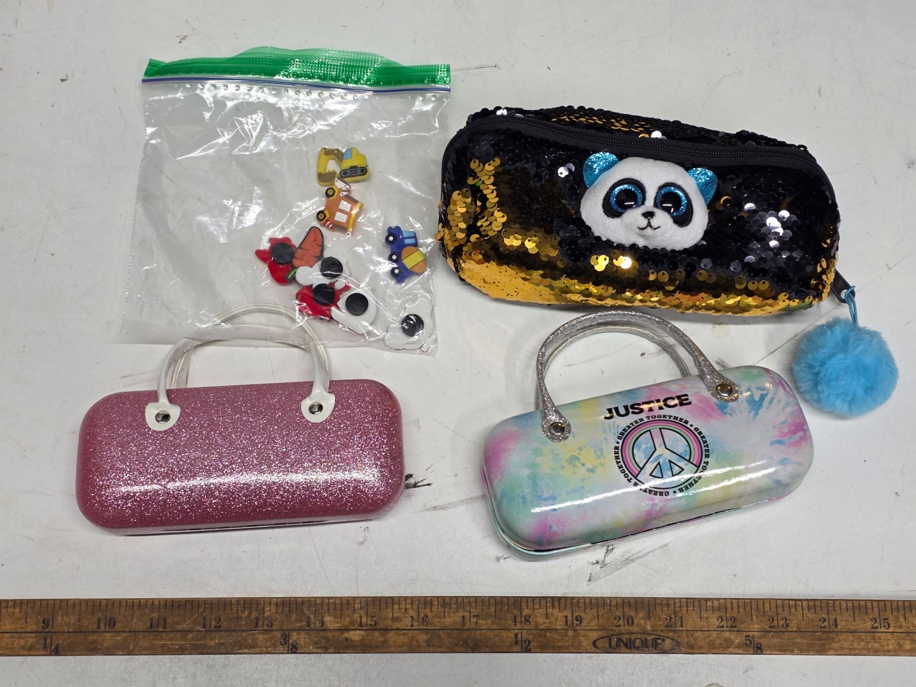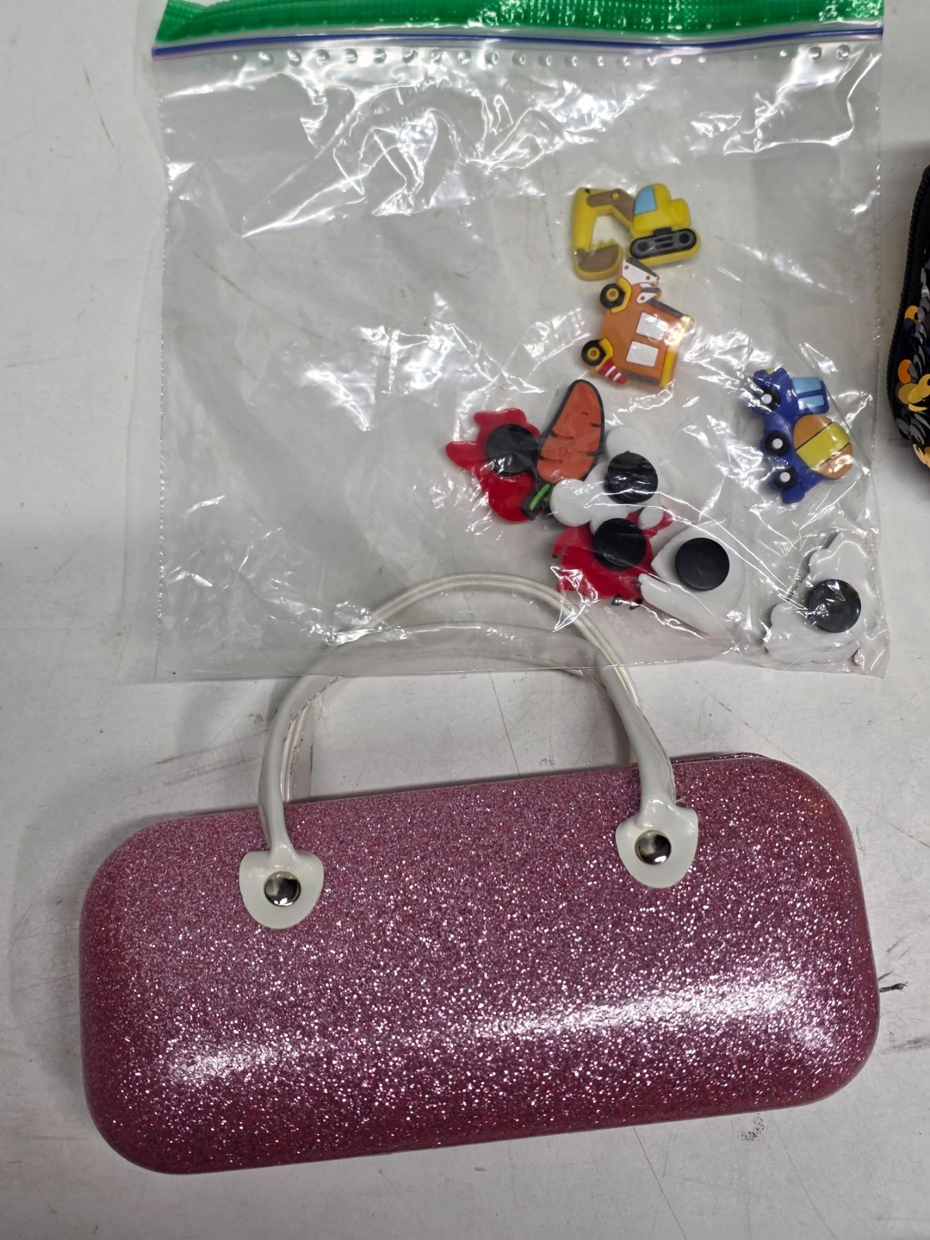 pencil case, 2 eye glass cases and crock charms