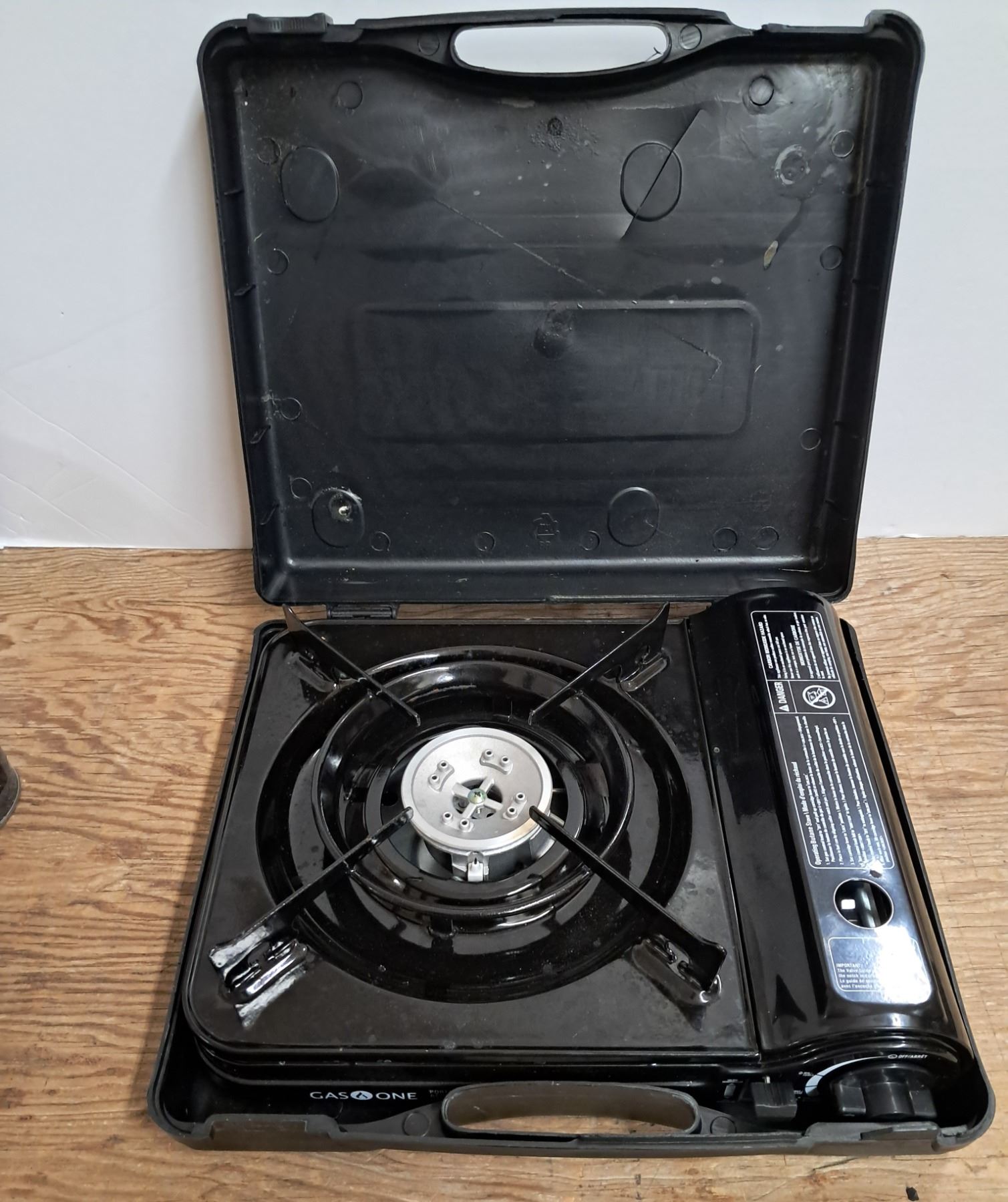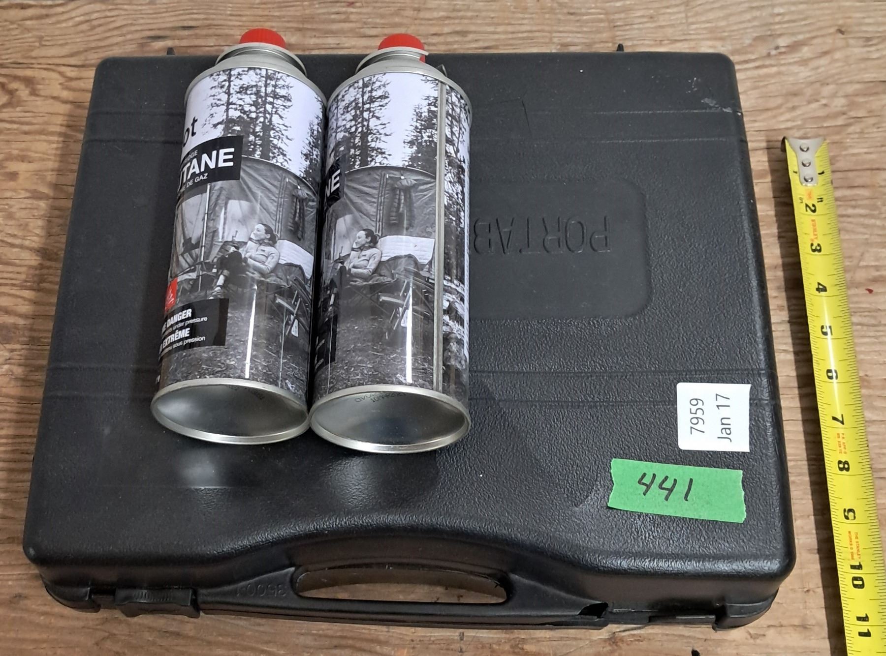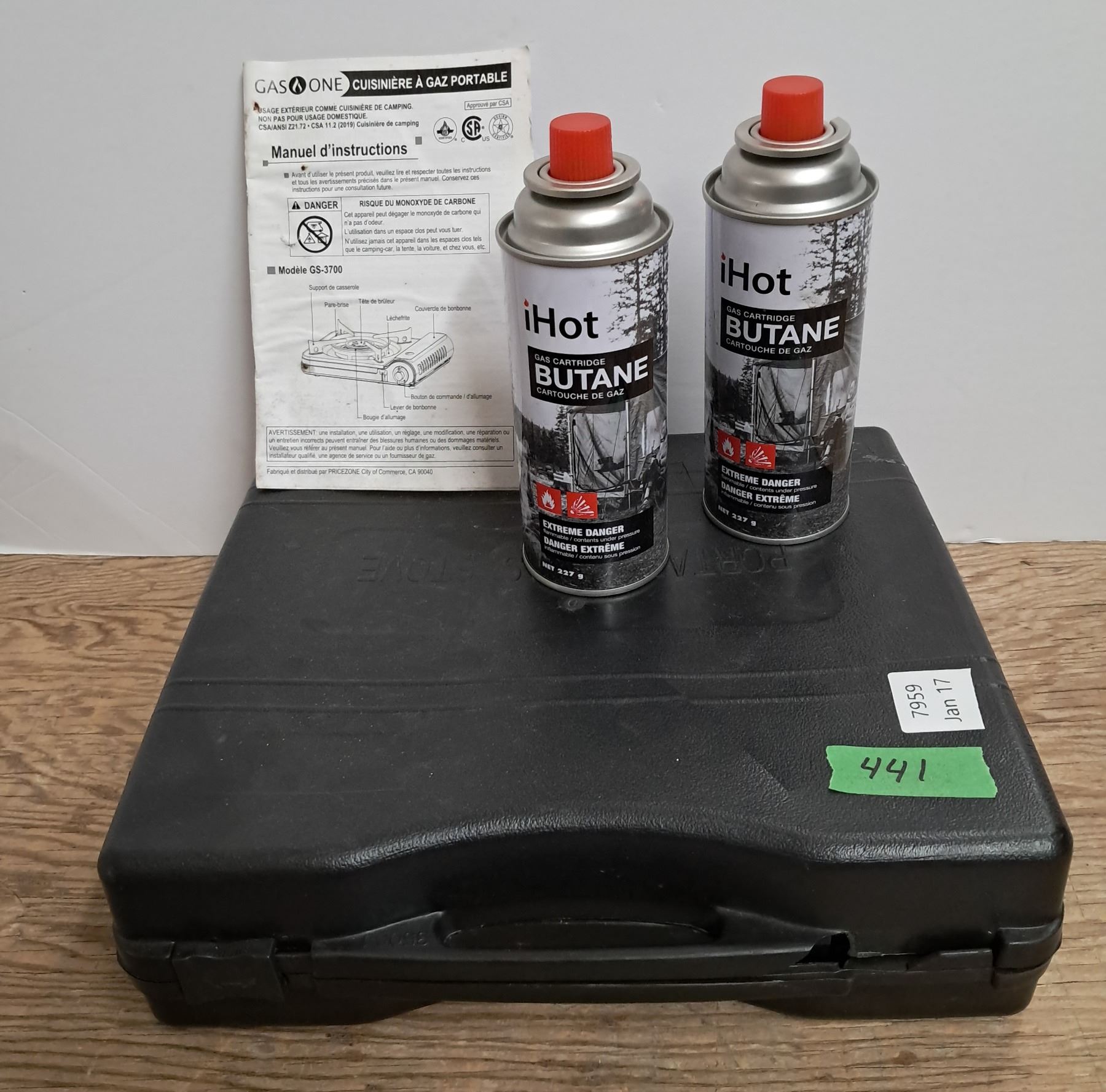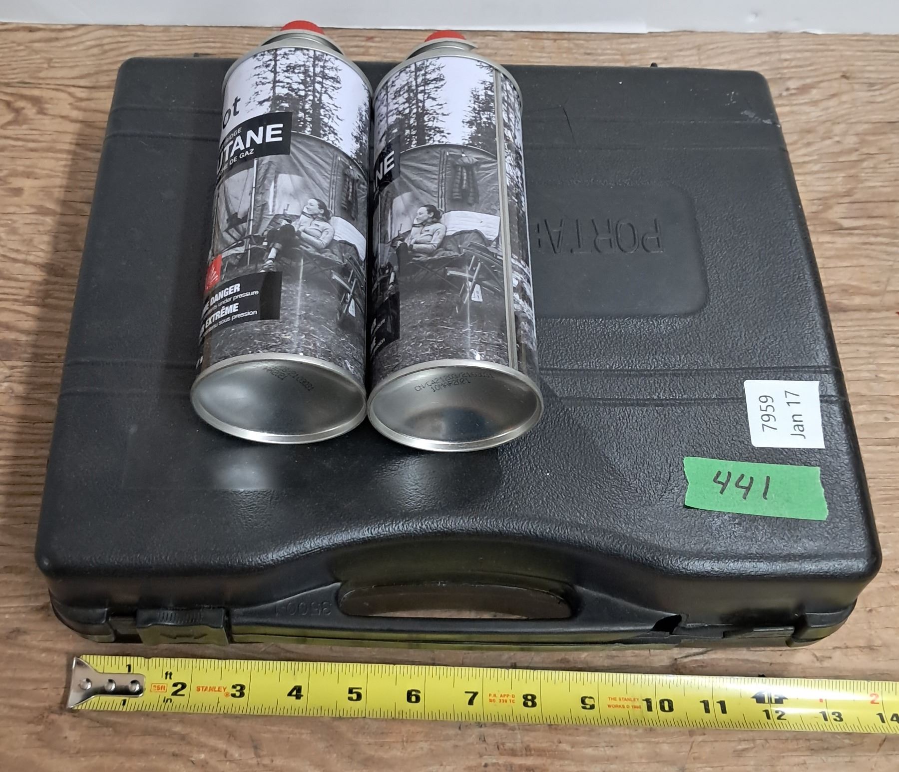 potable gas stove W/ carry case w/ (2 can of gas butane unused) (1) slide clip missing on case