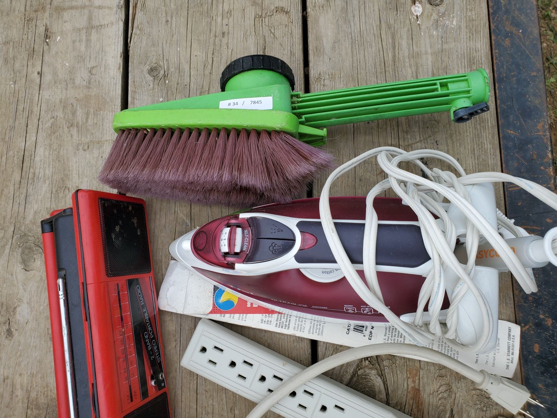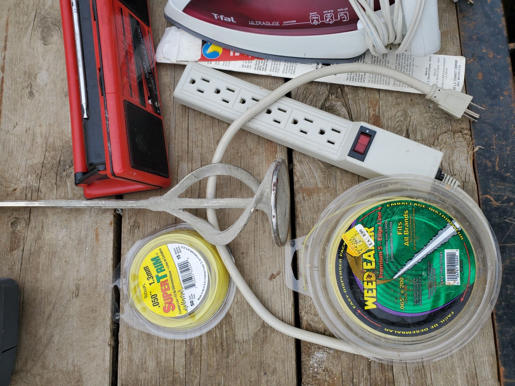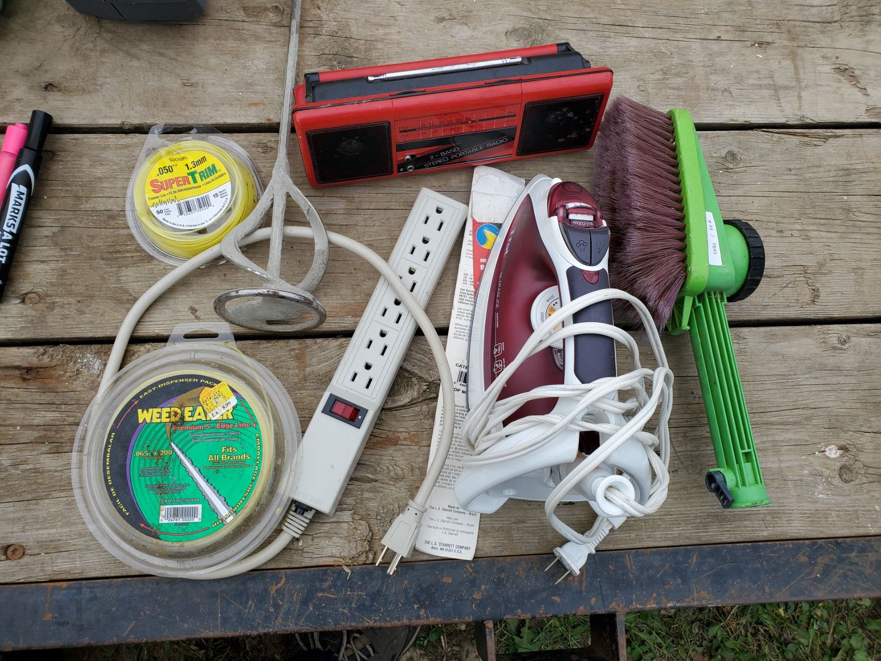 radio, iron, power bar, weedeater line, carwash brush