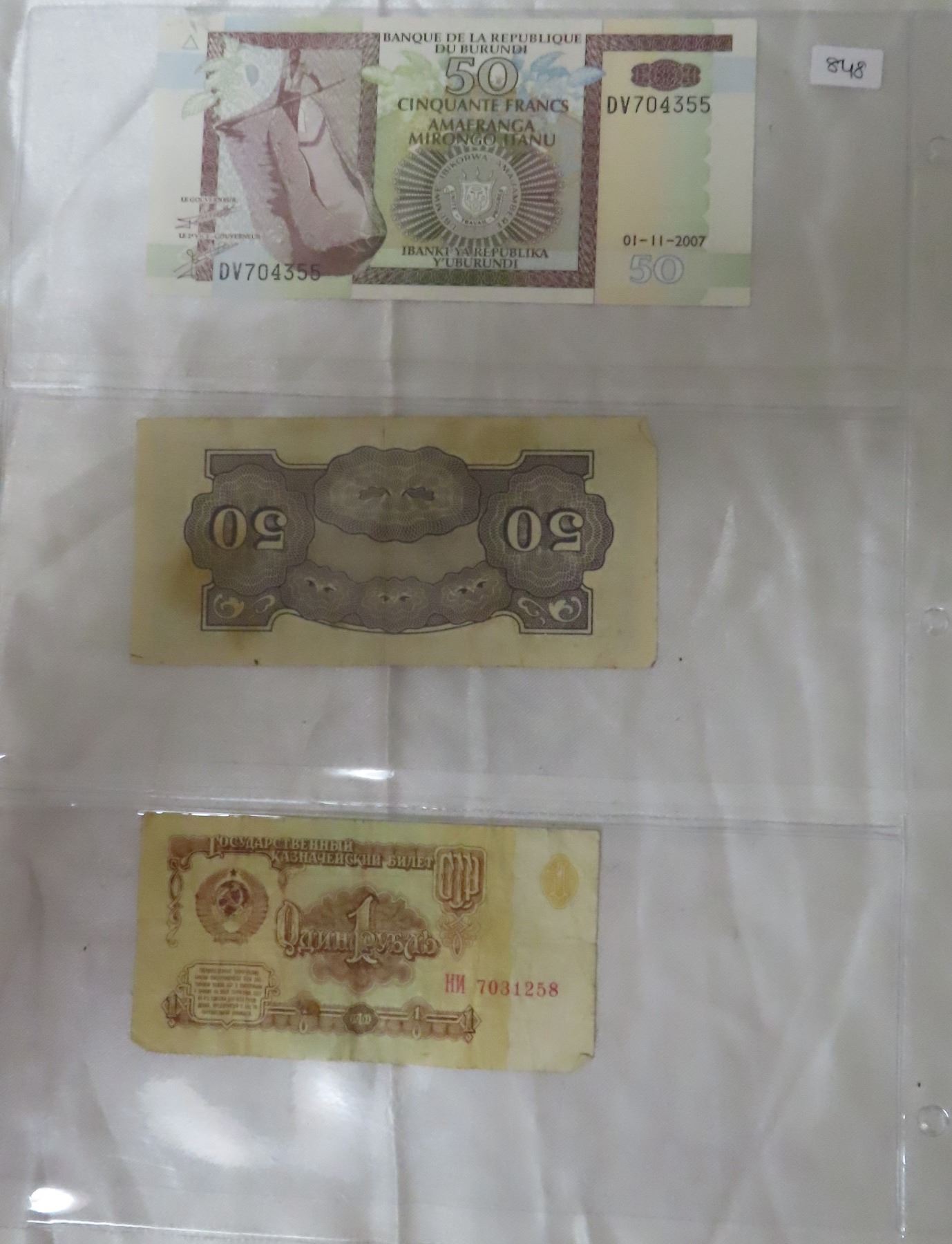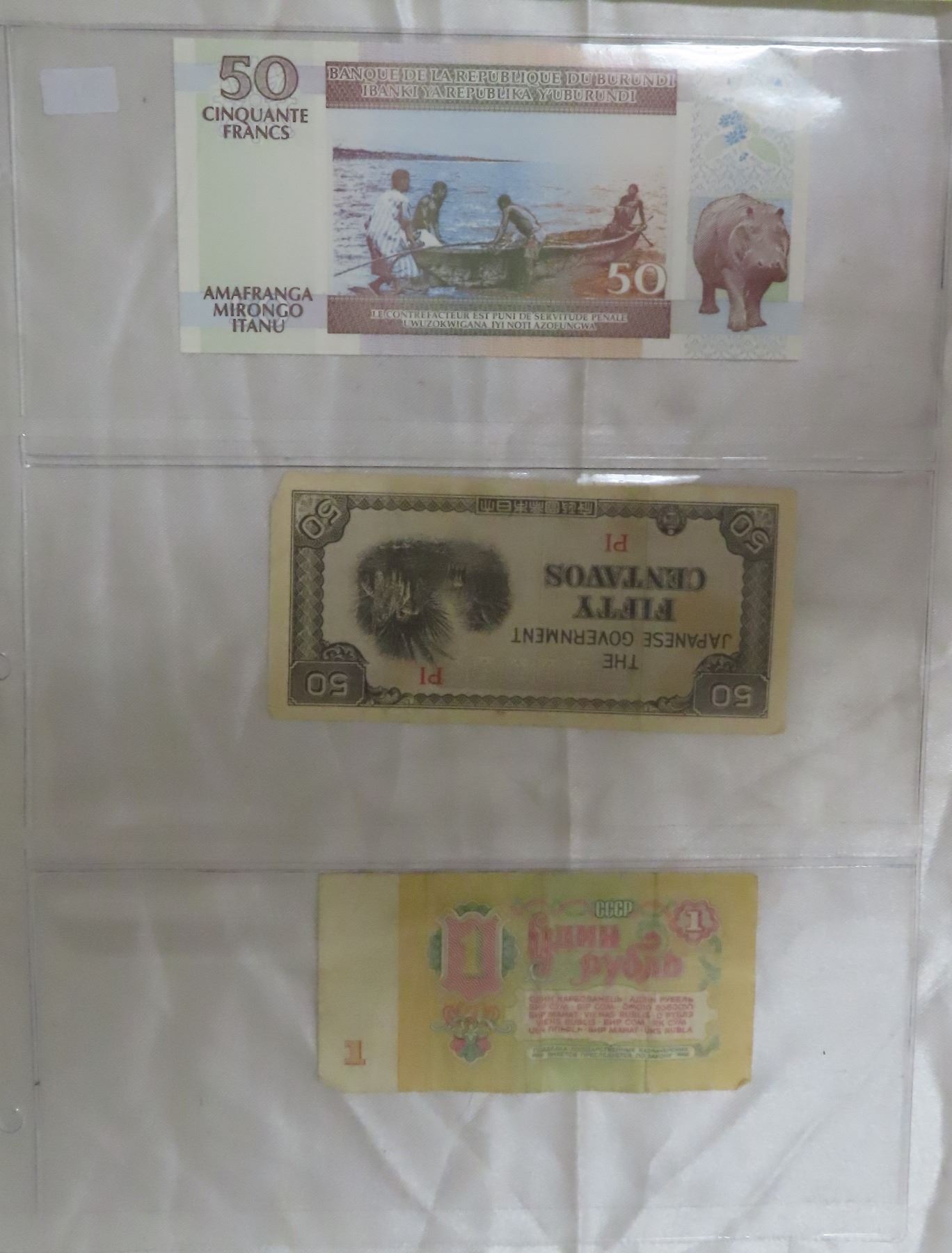 set of 3 bills (3 tickets, russia USSR- 1 ruble1961, the japanese government 50 centavos paper money WW@ Era philipines, burundi 50 frances 2007